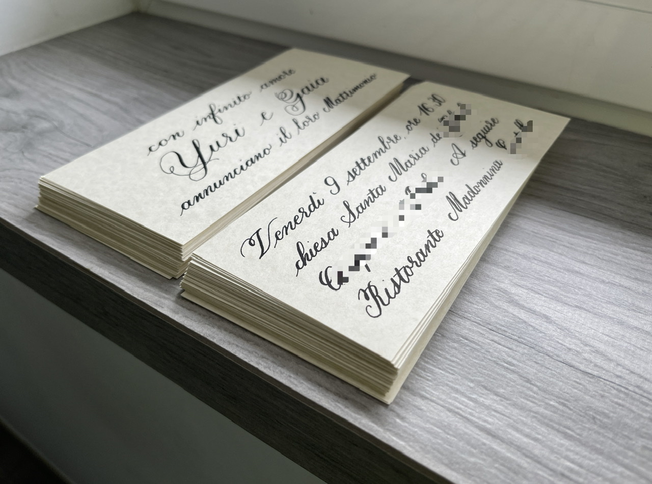 Recentemente mi è stato chiesto di scrivere a mano delle partecipazioni di nozze. 45 copie di “con infinito amore Yuri e Gaia annunciano il loro matrimonio” + data, ora, luogo del matrimonio e del ricevimento.