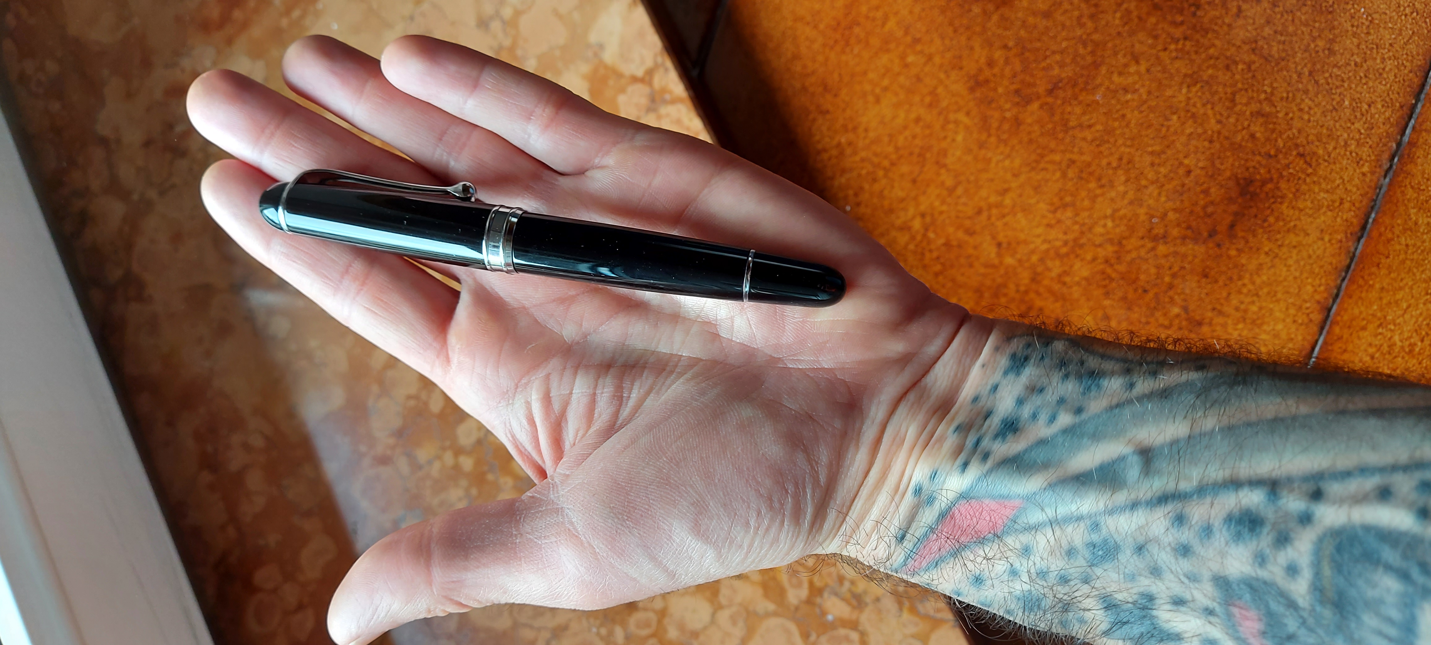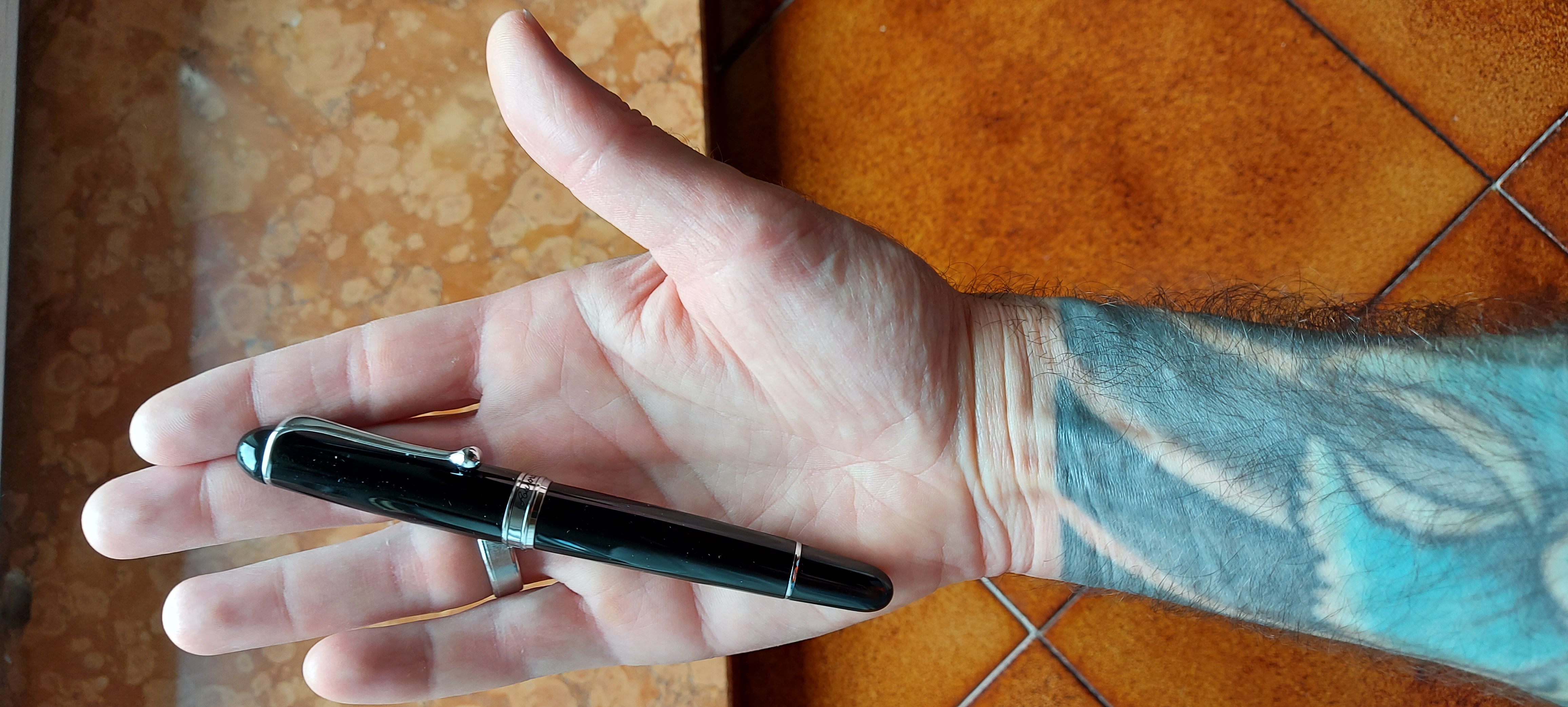 Penna bellissima io avevo la profit standard M che erroneamente ho venduto e adesso rimpiango, ormai ho maturato l'idea che penne di questa grandezza sono perfette se non calzate non stancano anche se usate ore, vorrei provare in futuro una Large semplicemente per il pennino 21k, le mie mani non sono grandi sembra che hanno la stessa misura delle tue. Comunque il tatuaggio è bello! Allego le foto con la mia Aurora 88, non avendo la sailor che più o meno dovrebbe essere quanto la Large e poi le ho messe pure per comparare la misura delle mani e per far vedere i tatuaggi
