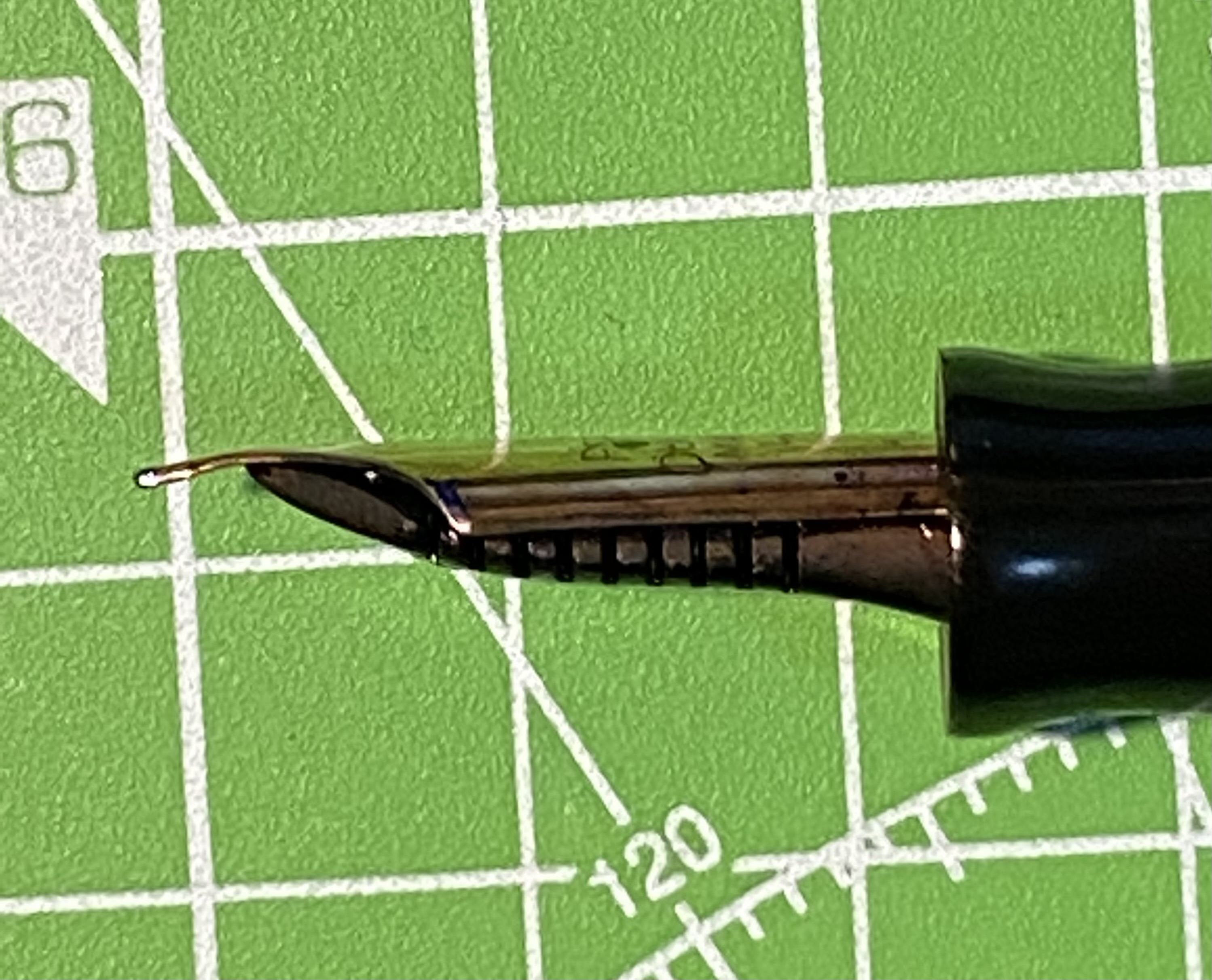 Questo modello verrà adottato dallo stile militare in cui i regolamenti imponevano che la penna non fuoriuscisse dal taschino e verrà declinato in varie forme praticamente da tutte le altre ditte che dovevano rispettare questo canone (ricordiamo le Tulip clip della Whal o le military clip della Sheaffer) Il cappuccio si svita in un quarto di giro, rivelando una comodissima sezione svasata a clessidra anch’essa frutto del nuovo design più snello, mentre prima c’era un vero e proprio colletto pronunciato. Su questo profilo le dita si assestano in modo molto naturale e non corrono il rischio di scivolare verso il maestoso pennino in oro 14 ct di grado F supportato da un alimentatore in ebanite Il pennino di questa signora si presenta piegato verso il basso, facendolo quasi rassomigliare ad un pennino di tipo posting. Forse un trauma da impatto … ma non credo, sembra più flessione da sforzo.