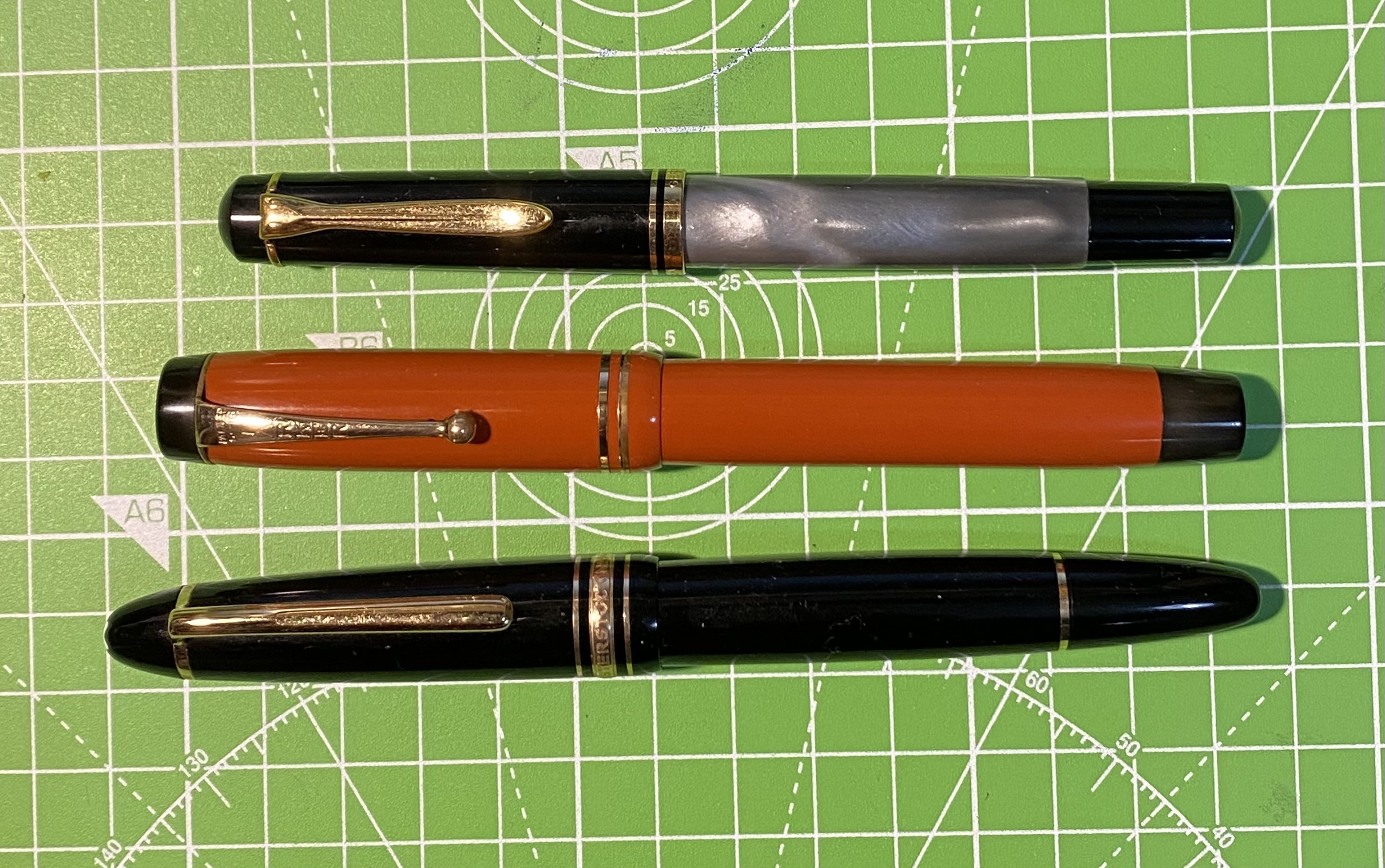Probabilmente mi viene da pensare che il vecchio proprietario fosse un poco maldestro e frettoloso.. oggi per noi collezionisti queste penne sono preziose, ma allora erano dei mezzi di scrittura (seppure prestigiosi come questo) e riempiendo la penna dal calamaio spingendo il pulsante di carica il proprietario puntellava sul fondo della bottiglia il pennino causandone il piegamento.. chissà.. Vediamola ora a confronto con una penna di dimensioni importanti come la Montblanc 146 le Grand ed una abbastanza piccola come una Pelikan M200. Vediamo che si posiziona nel mezzo, risultando dunque una penna che in teoria ancora si potrebbe portare appresso nella tasca e che comunque ha una certa dimensione per farsi notare