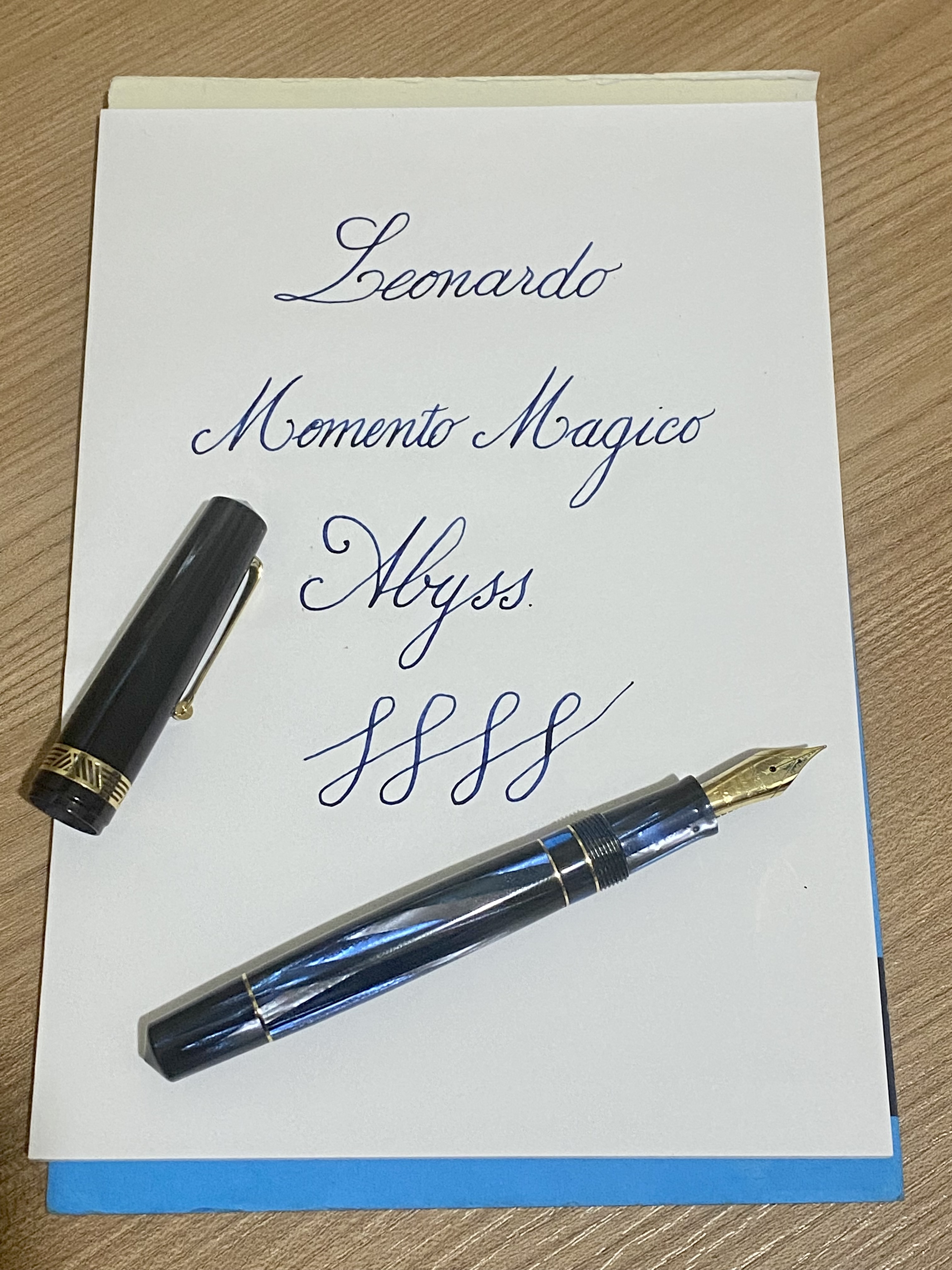 La cosa che però mi ha gratificato tanto di questa Leonardo è il suo gruppo scrittura, con il suo bell'alimentatore in ebanite blu lucida e un pennino che benché sia il solito JoWo, non scrive come il solito JoWo. Questo pennino non è rigido come un chiodo, è fermo e scorrevole, quasi burroso, ma senza mai far perdere la sensazione di contatto sulla carta, e offre persino un minimo di variazione di tratto, cosa che non avevo mai sperimentato su questi pennini. Il flusso è pieno, generoso, per la prima volta scrivo con un fine che è piacevole, non mi fa stridere i denti come con altri JoWo che ho avuto modo di provare e l’inchiostro sulla carta si vede. Certo buona parte del merito per un flusso così “glorioso” lo attribuisco all'alimentatore fatto in casa da Leonardo, ma questo pennino mi ha davvero piacevolmente sorpreso. Insomma questa penna non è una di quelle a pochi spiccioli, qui si paga soprattutto il materiale e il gruppo scrittura con alimentatore in ebanite blue e pennino in oro 14K, ma dopo averla presa in mano ed averci iniziato a scrivere credo di poter dire senza remore che li vale davvero tutti.