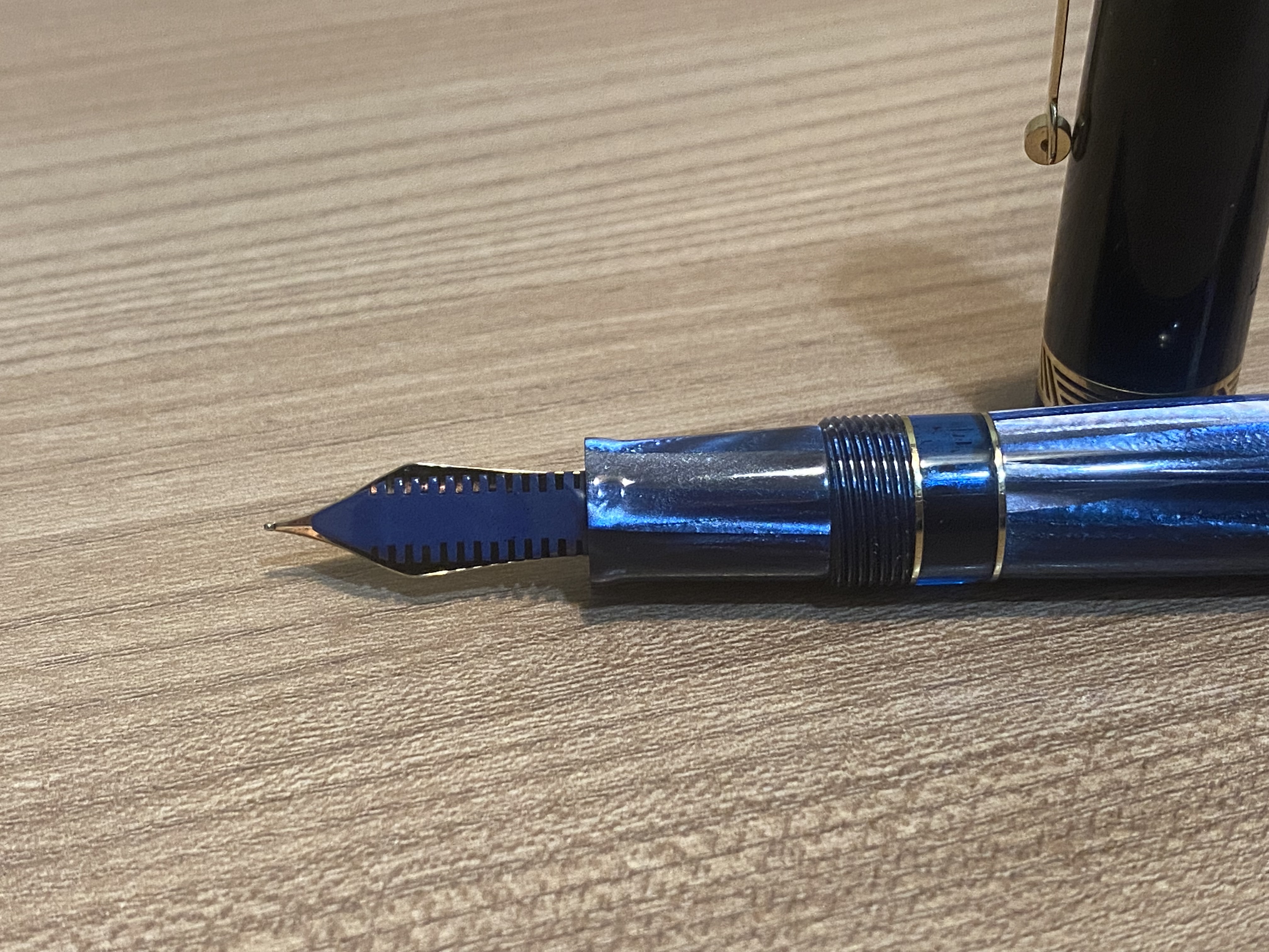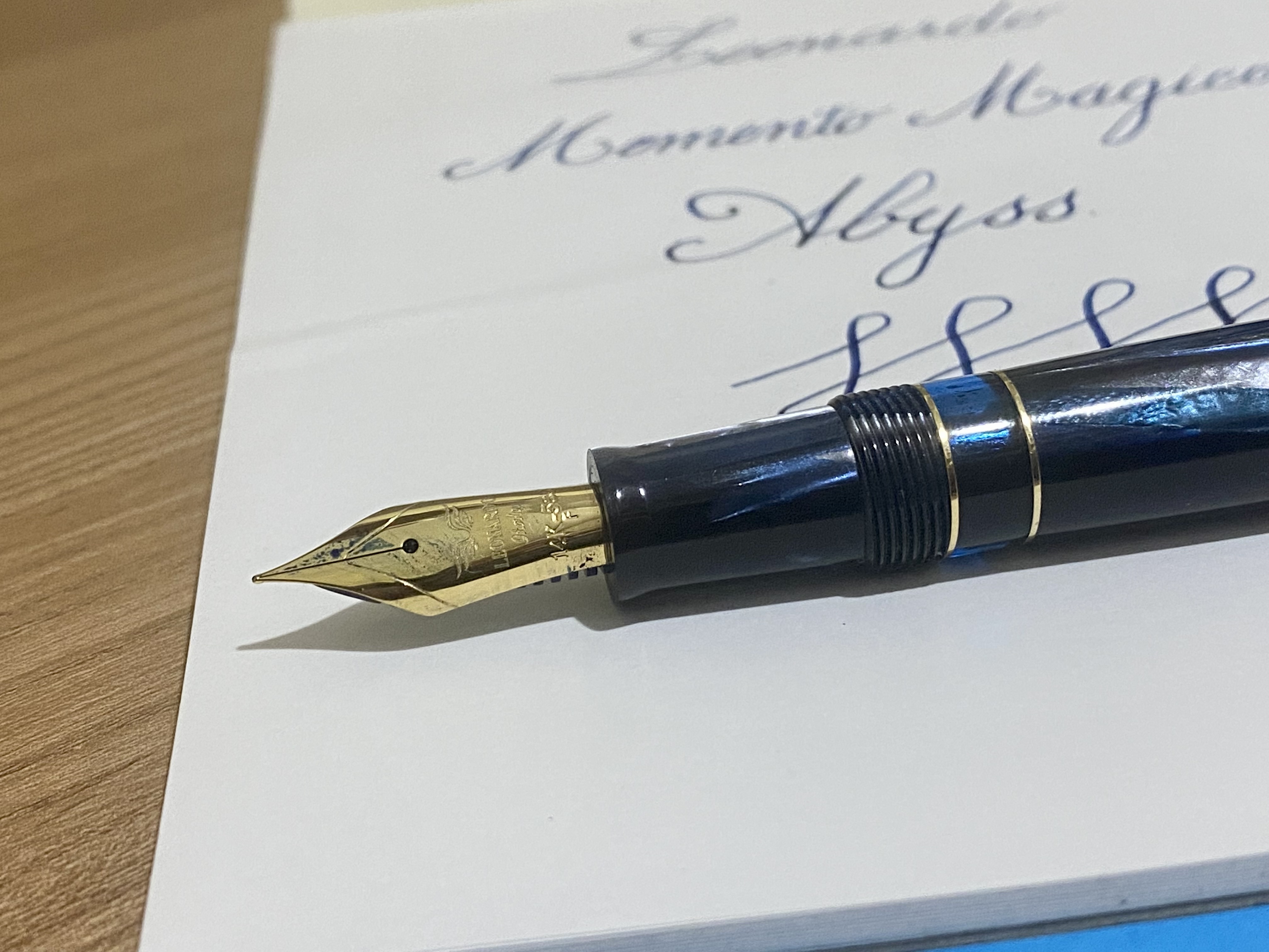 Io l’ho presa con un bel pennino Broad, generoso ma correttamente misurato, esalta bene le sfumature dell’ inchiostro che ho caricato (R.Oster Gray seas) senza saturare il colore. Sono soddisfatissimo. Soprattutto la stilografica non ha acquisito le misure Jumbo dettate dalla moda odierna. Soprattutto quando si parla di celluloide.
