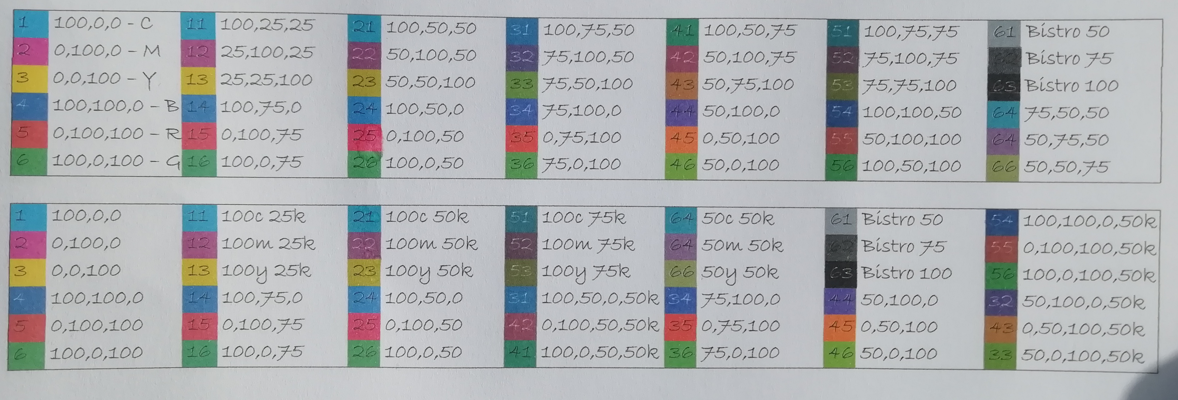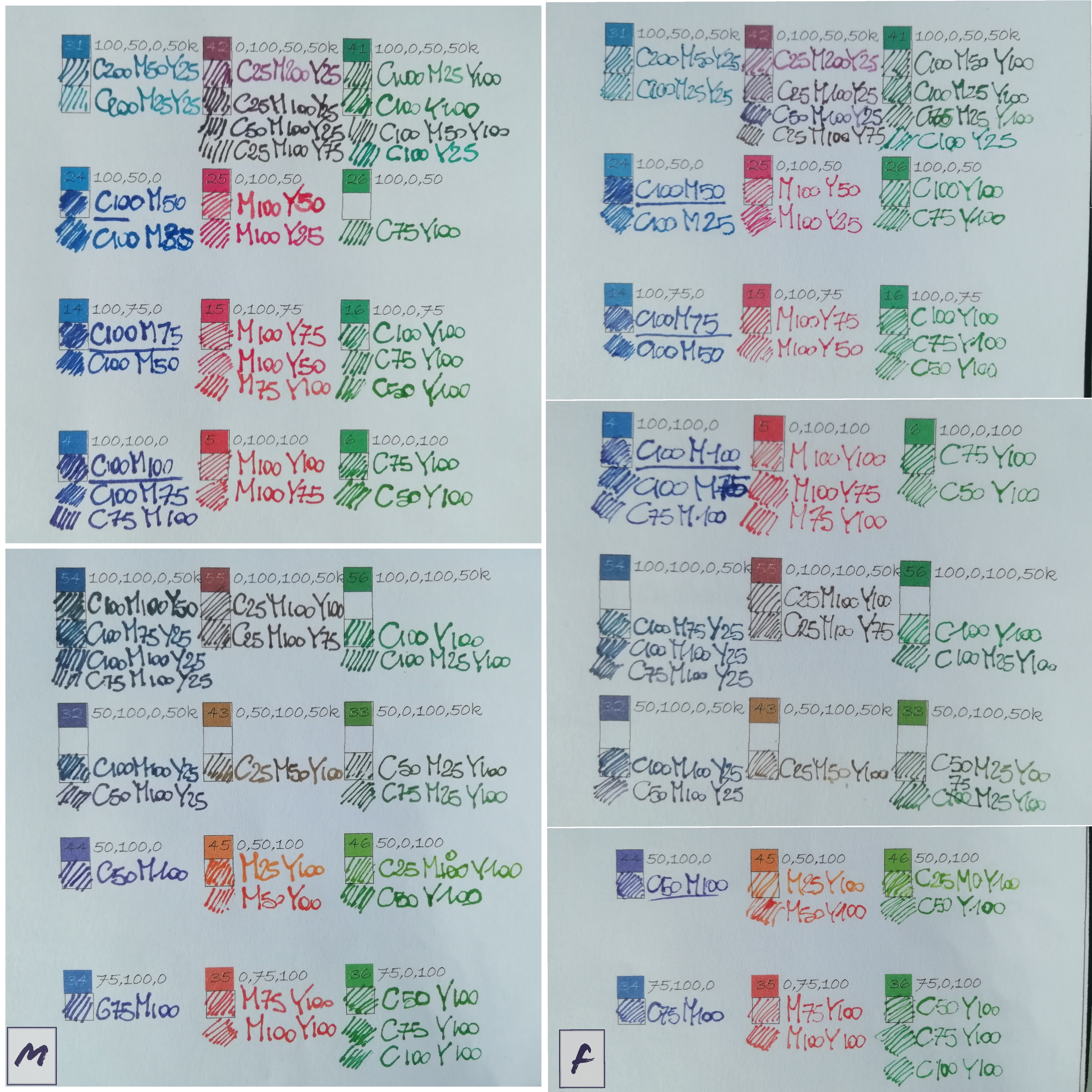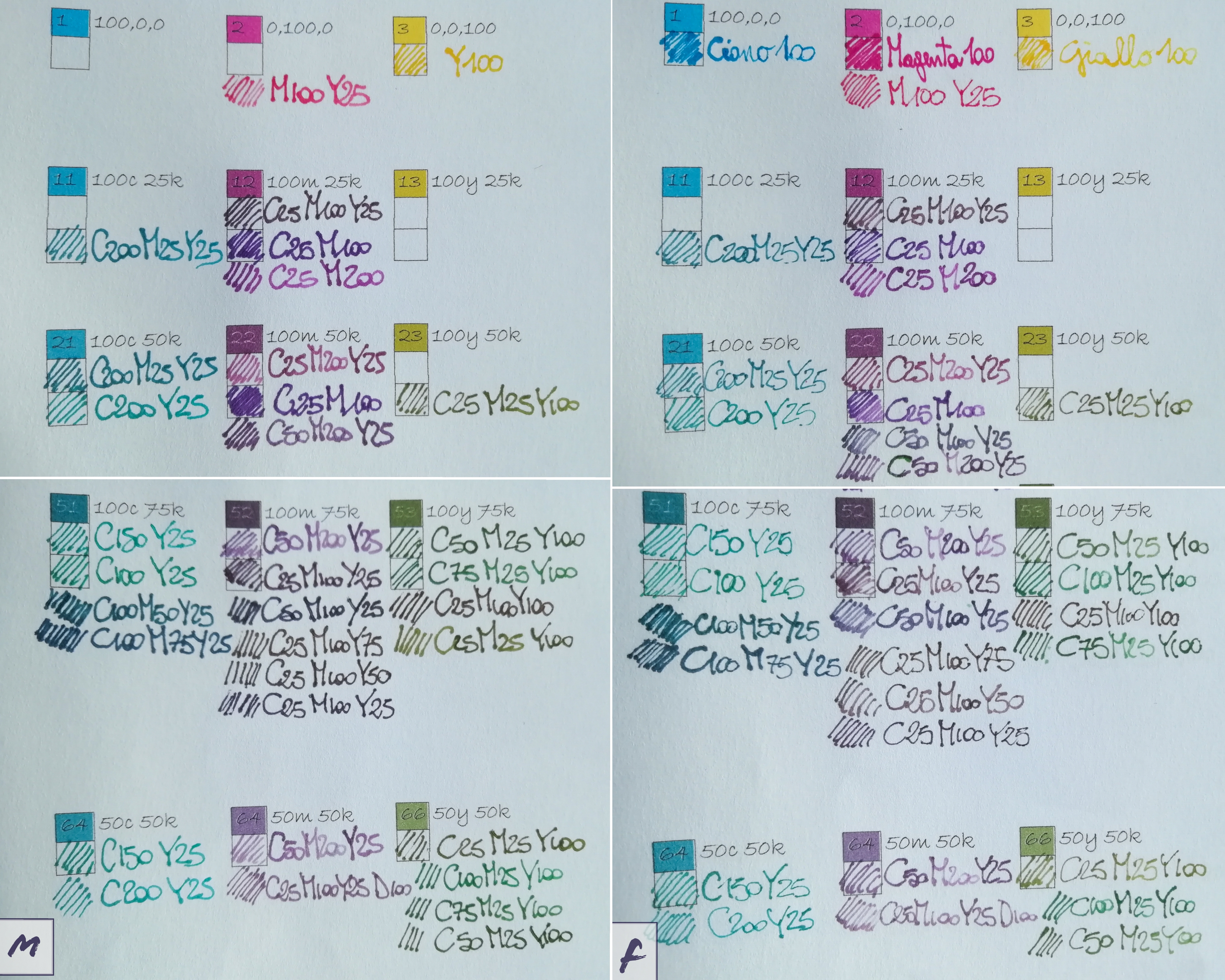 Dato che alla fine si tratta di un sistema cmyk affine a quello delle stampanti, ho iniziato costruendomi una palette guida e stampandola.