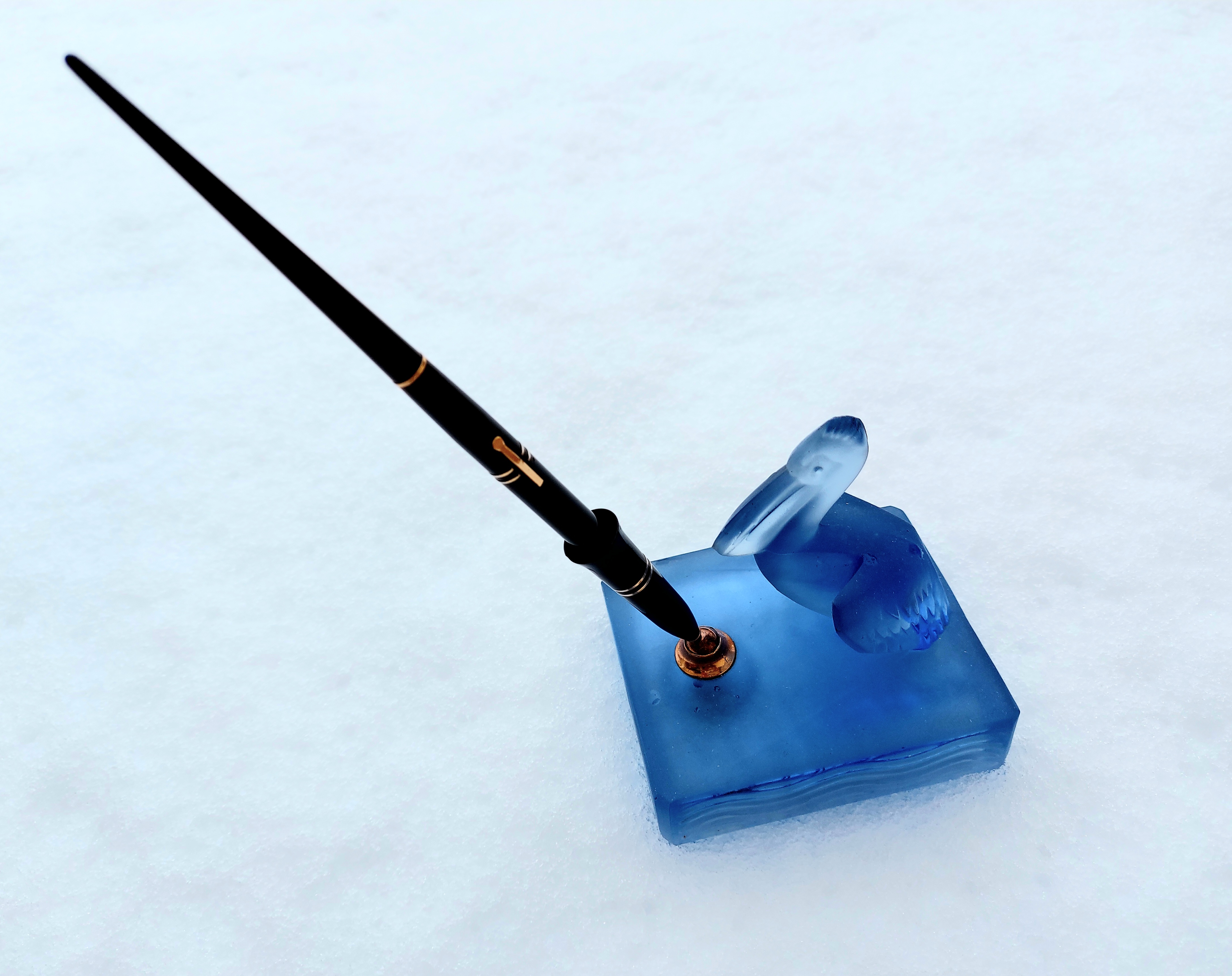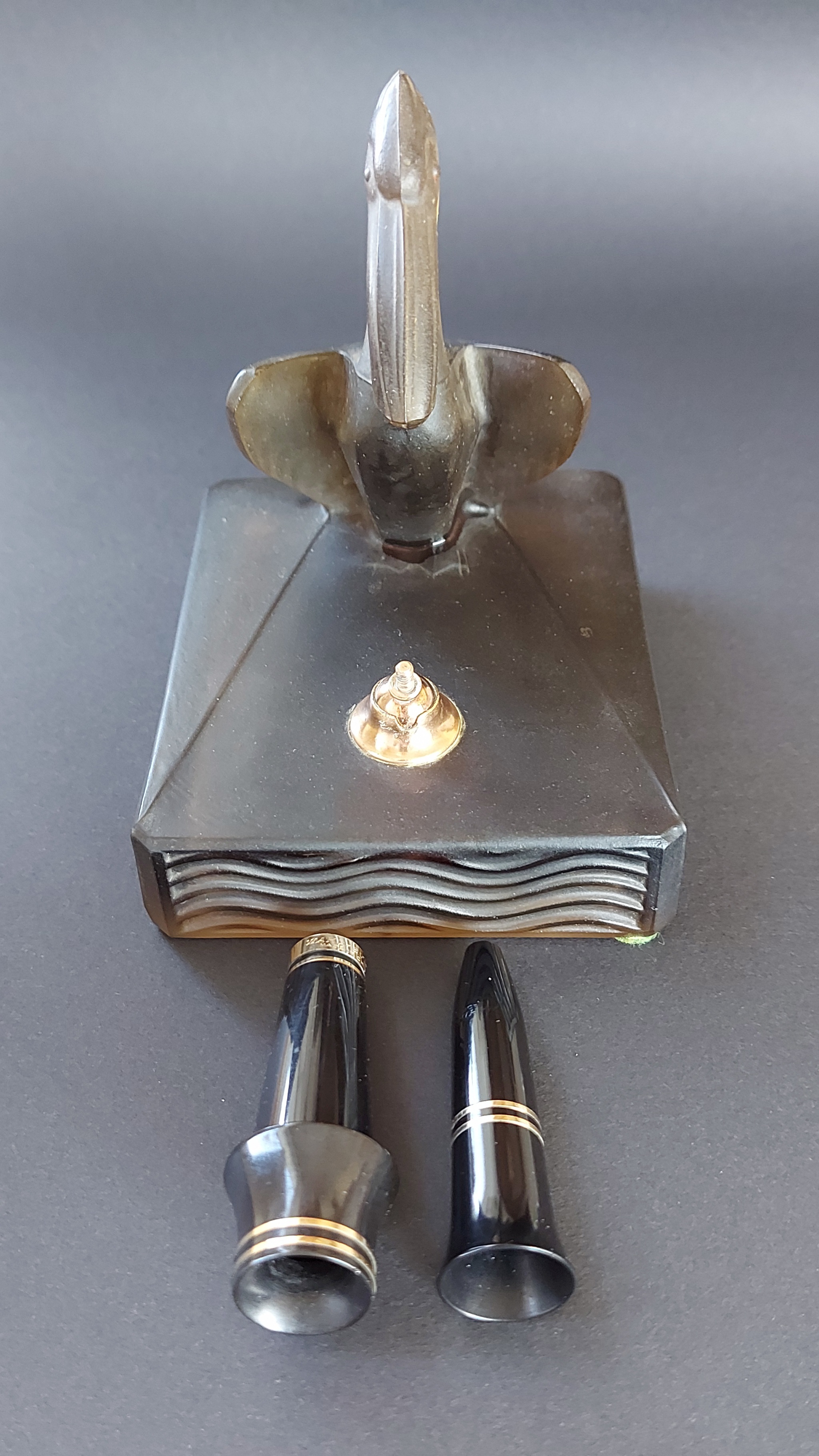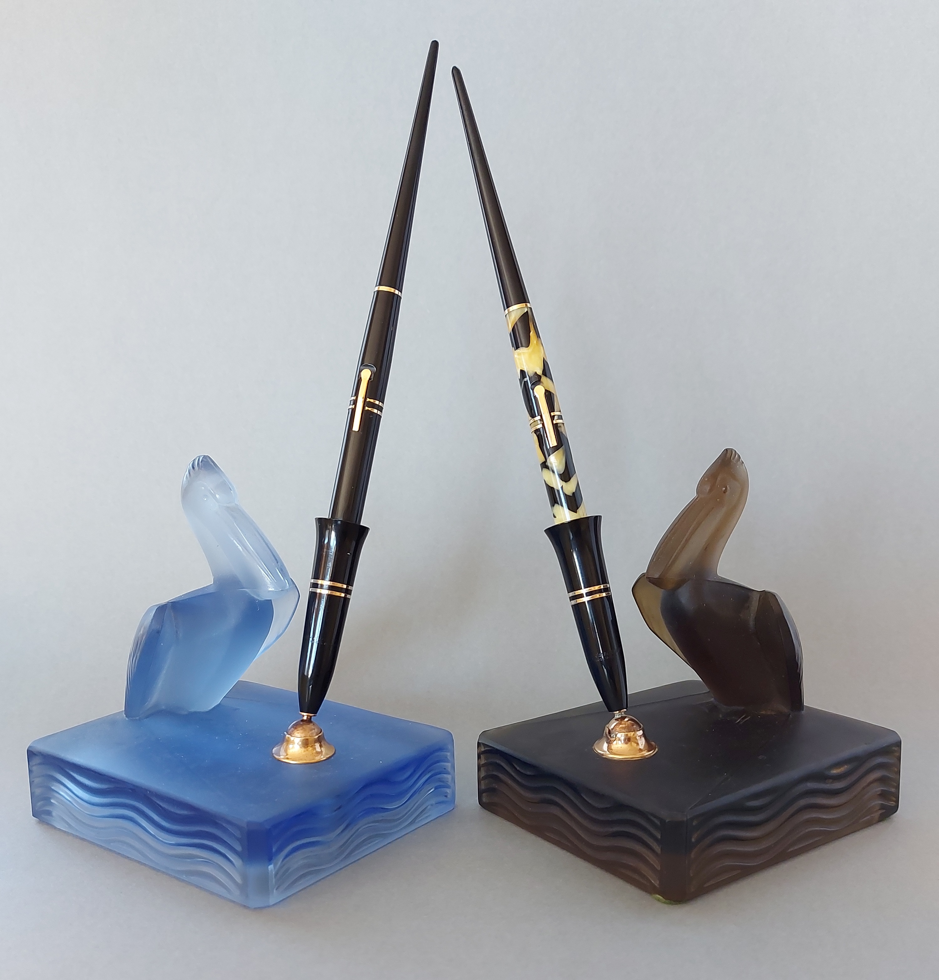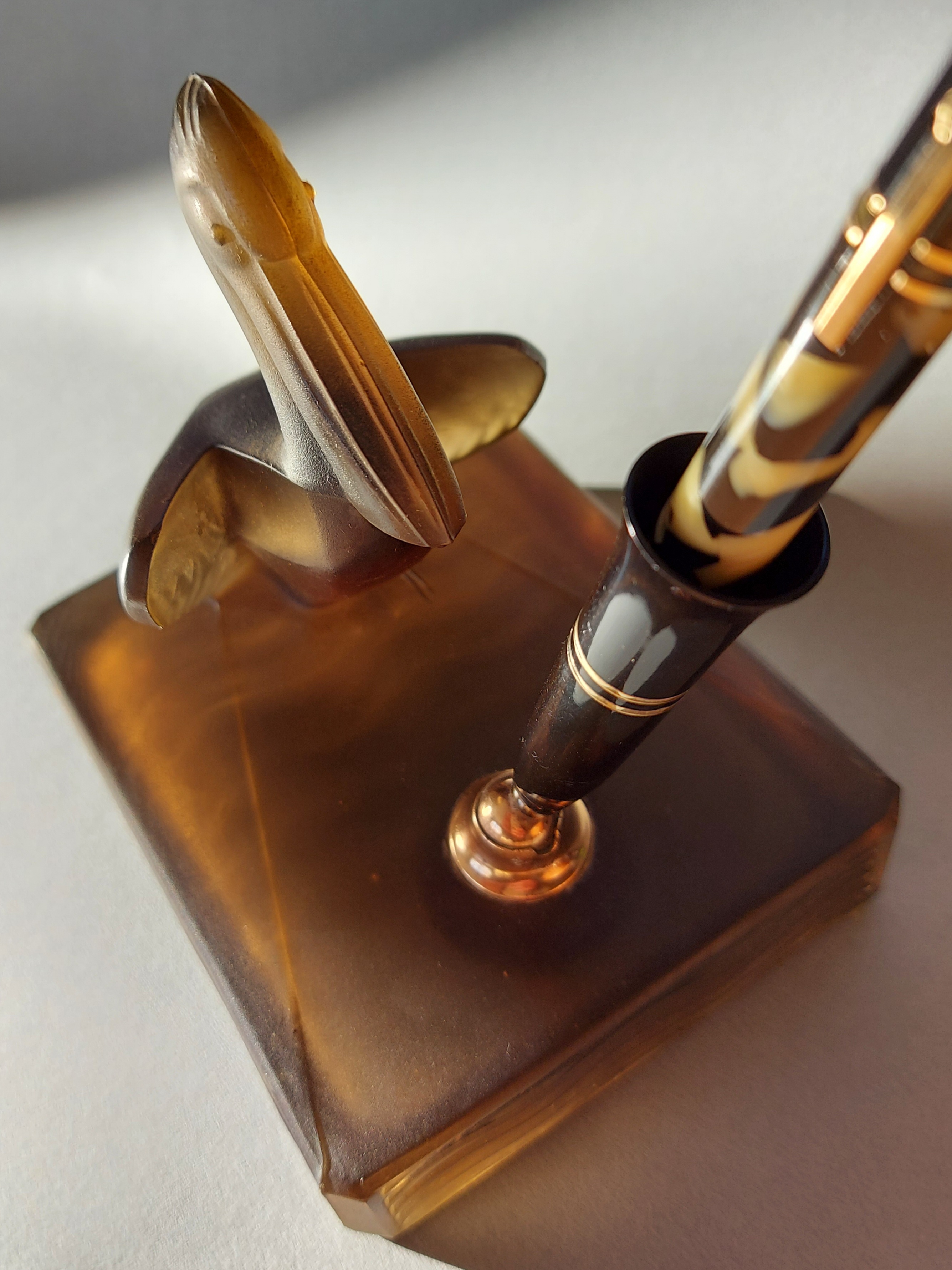 EVERSHARP – D’Avesn modernistic azure pelican glass desk set (Stylophore) and Doric fountain pens and pencils. Prob. attached to L'Illustration 1931-12.