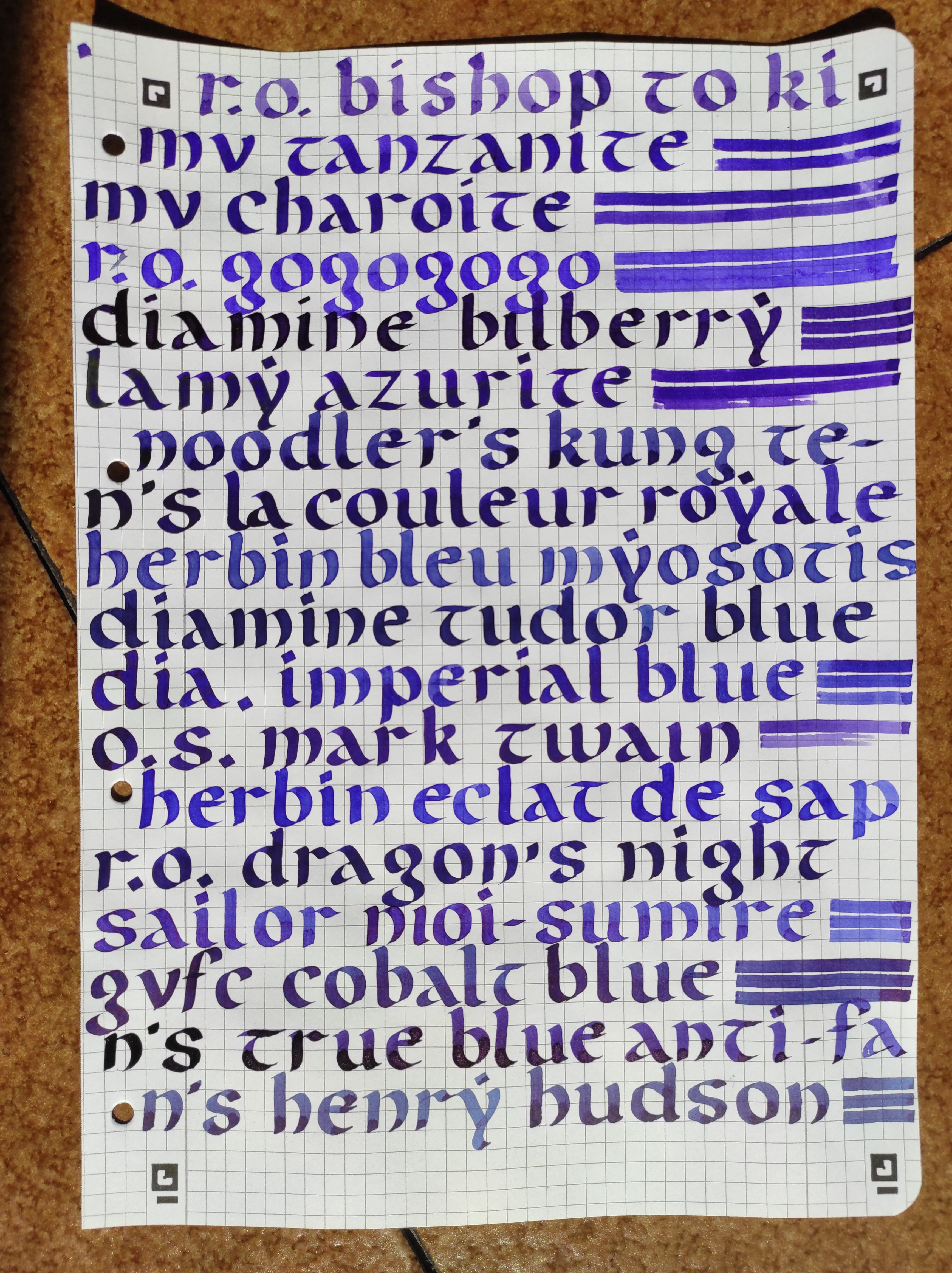 - Robert Oster Bishop to King. Questo inchiostro nella fialetta è un blu molto neutro, assume questa bellissima tonalità lavanda solo dopo esser rimasto sulla carta per qualche tempo.