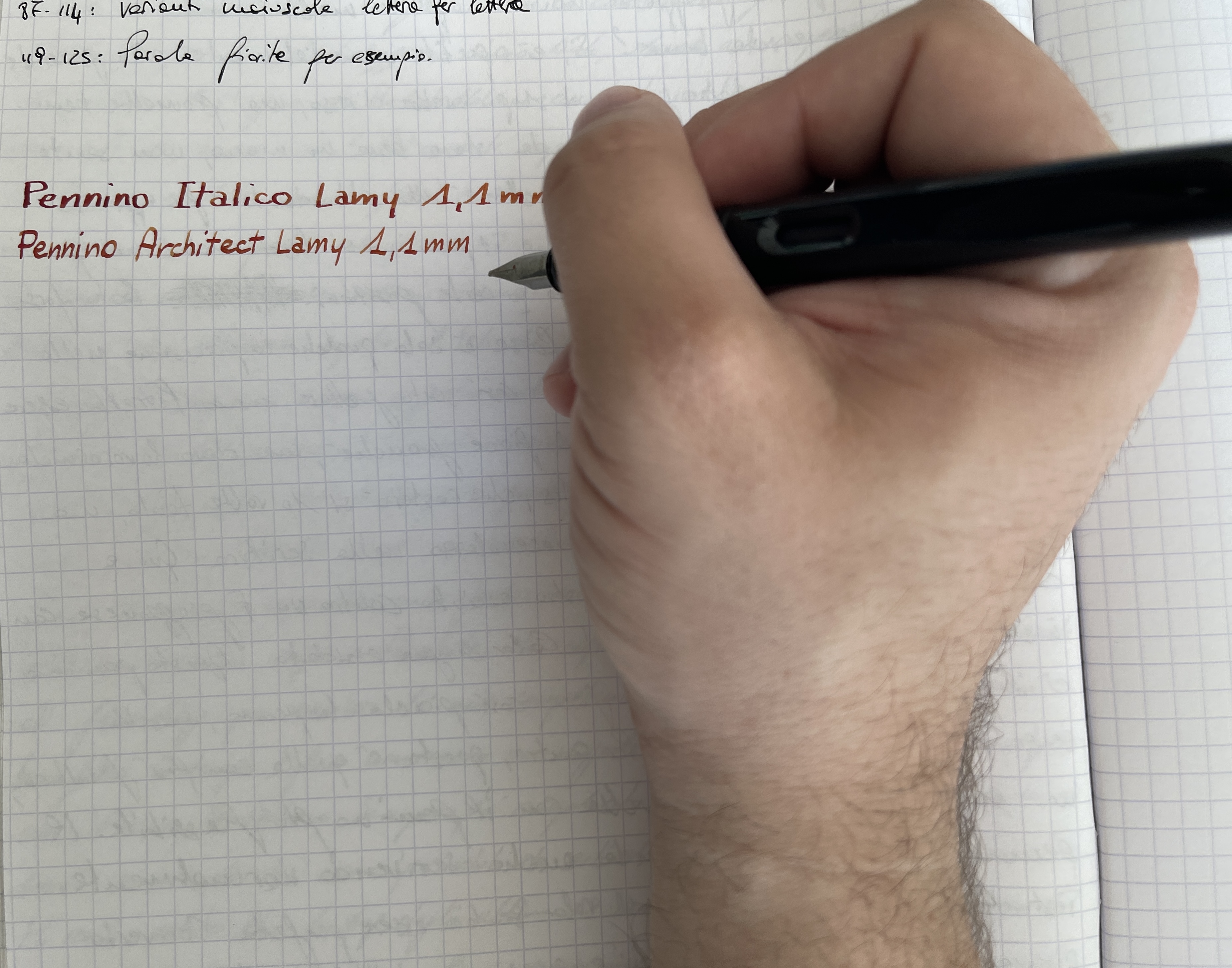 questo è il pennino architetto e mi piace molto come scrive, sì scrive al contrario di come scrive un italico, e bisogna mantenere l'inclinazione della penna, altrimenti il pennino si può impuntare e cambia anche lo spessore di scrittura