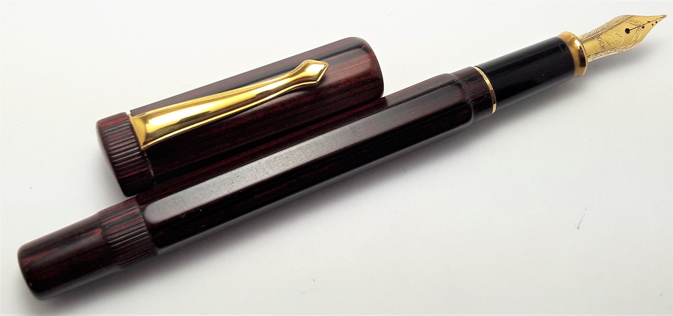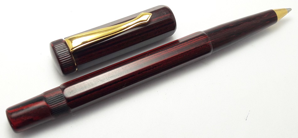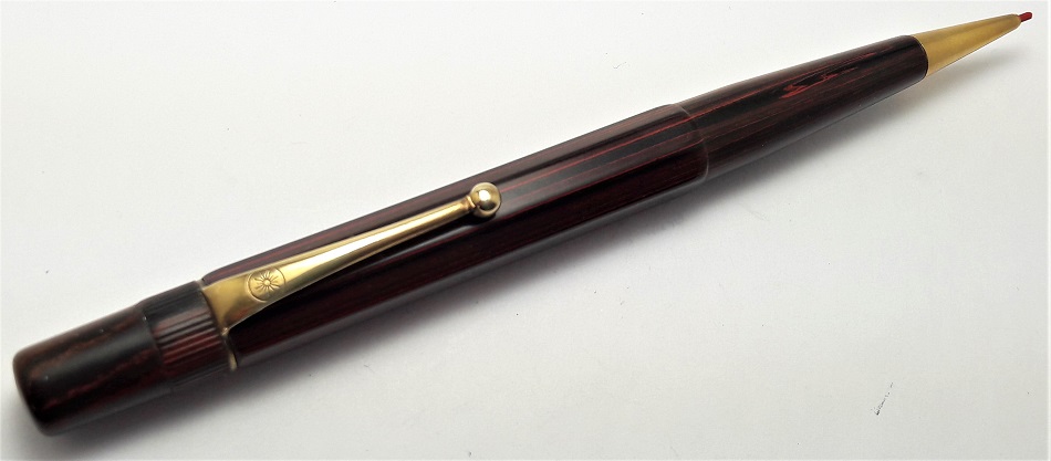 Gli strumenti di scrittura sono realizzati in ebanite marmorizzata rosso-marrone (increspatura rossa) e finiture placcate in oro. Corpo e cappuccio di forma ottagonale.