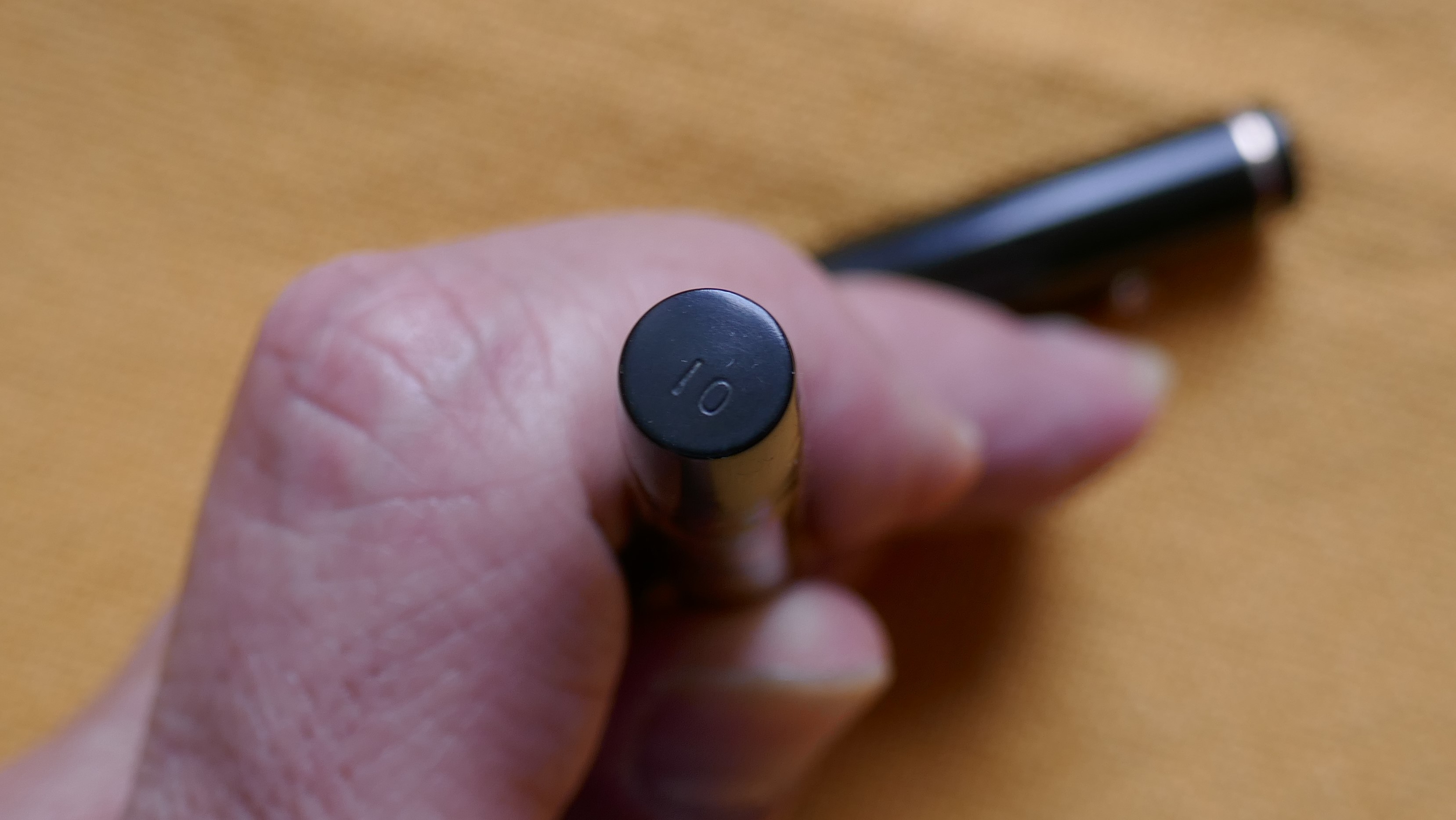 Piccola, con la marca scritta in verticale sulla clip e il nome