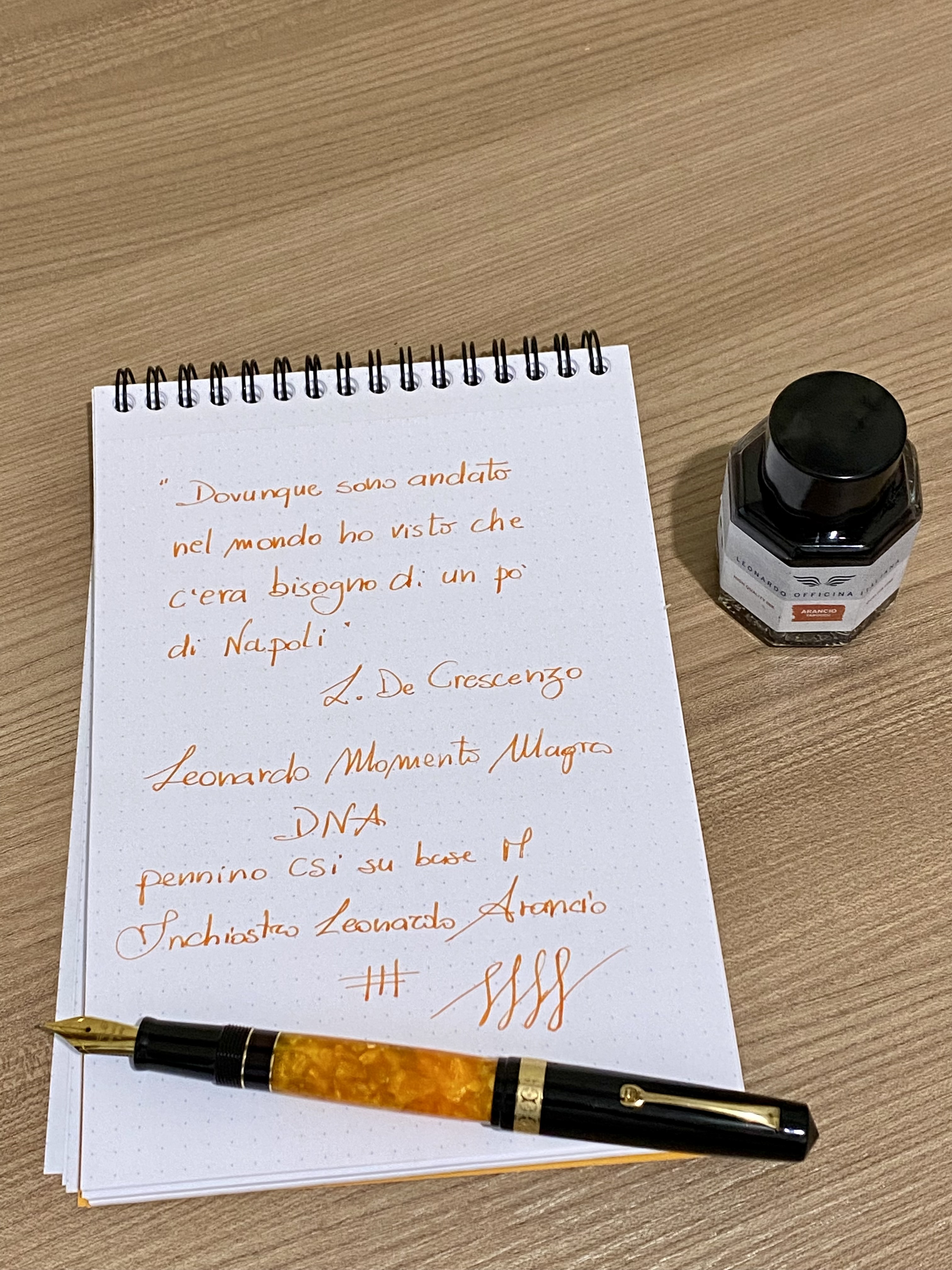 Ma veniamo alla sostanza, vediamo come scrive. Premetto che la DNA viene offerta sia con pennino in acciaio e alimentatore in ABS che con pennino in oro e alimentatore in ebanite fatto in casa da Leonardo. Il mio esemplare è con il gruppo scrittura JoWo in acciaio, ma con pennino personalizzato da Leonardo, ovvero un Cursice Smooth Italic su base M, cioè si è partiti da un pennino M per realizzare questo specifico taglio.