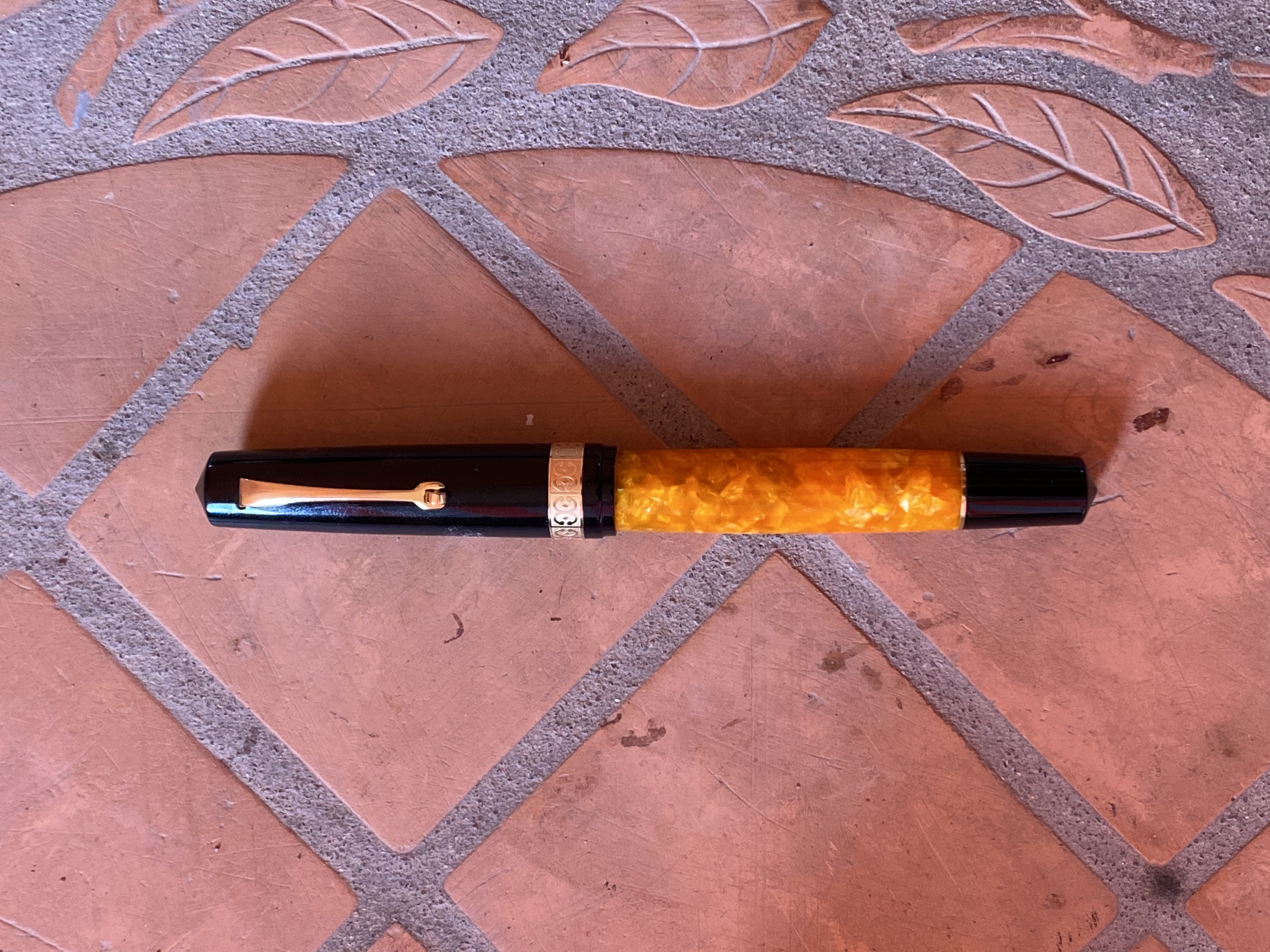 La resina del fusto è di una bellezza stratosferica (per me!), è vivace, ricca di tonalità con le sue screziature che vanno dal giallo all’arancio scuro, un materiale luminoso e caldo. Personalmente poi, trovo che l’accoppiata con le finiture dorate è perfetta.