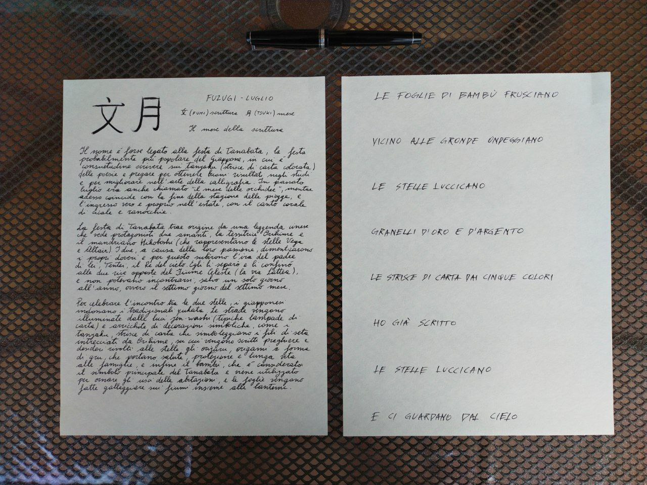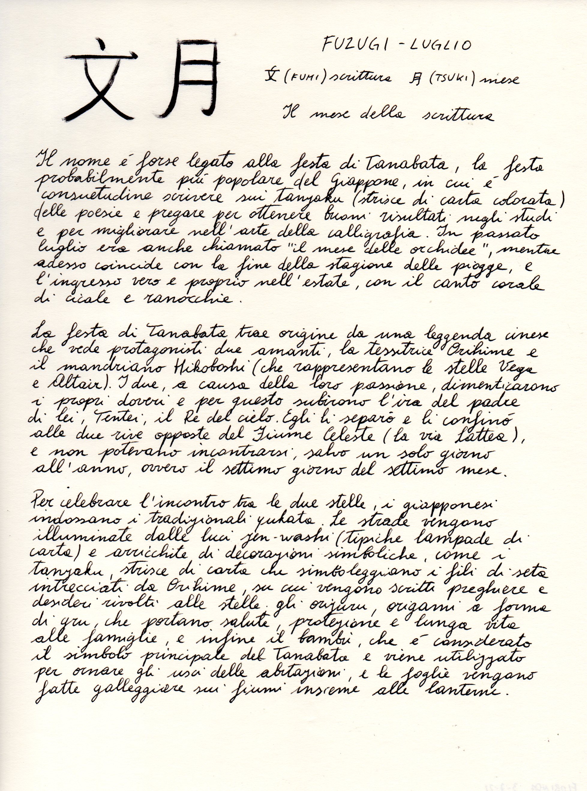 Spiegazione del nome giapponese del mese di luglio e testo di una canzone popolare che racconta le usanze tipiche della festa di Tanabata.