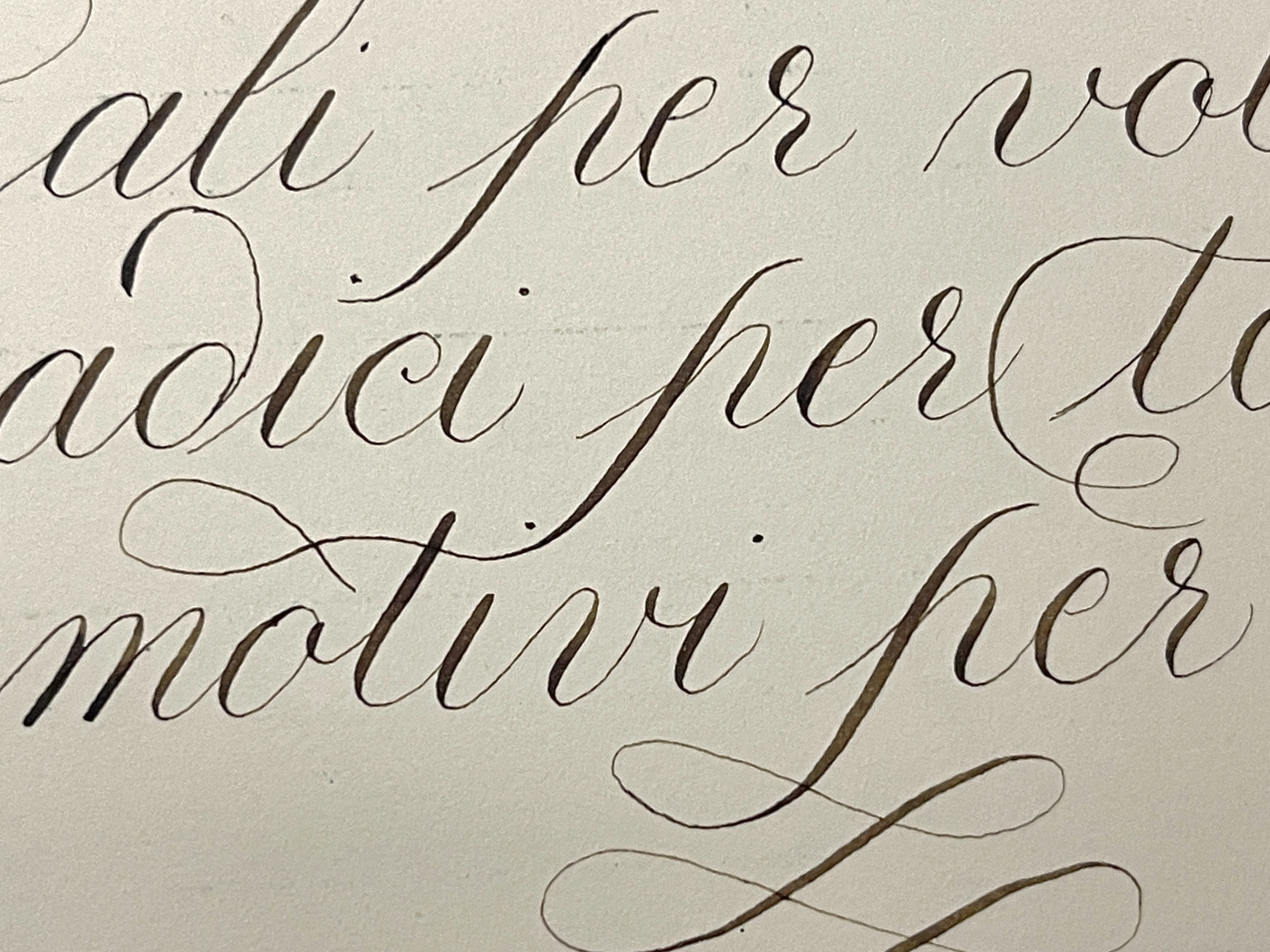 - Omas Extra da tavolo riempita con Diamine Autumn Oak che, su carta leggermente avoriata da acquerello, ha una resa fantastica! Il colore è molto più scuro, tendente all’ambra/foglia di the con shading ridotto (resta più chiaro nei tratti con pennino divaricato per minore presenza di inchiostro, ma uniforme, senza formare gocce in mezzo alla lettera come su carta Favorit/Rhodia)