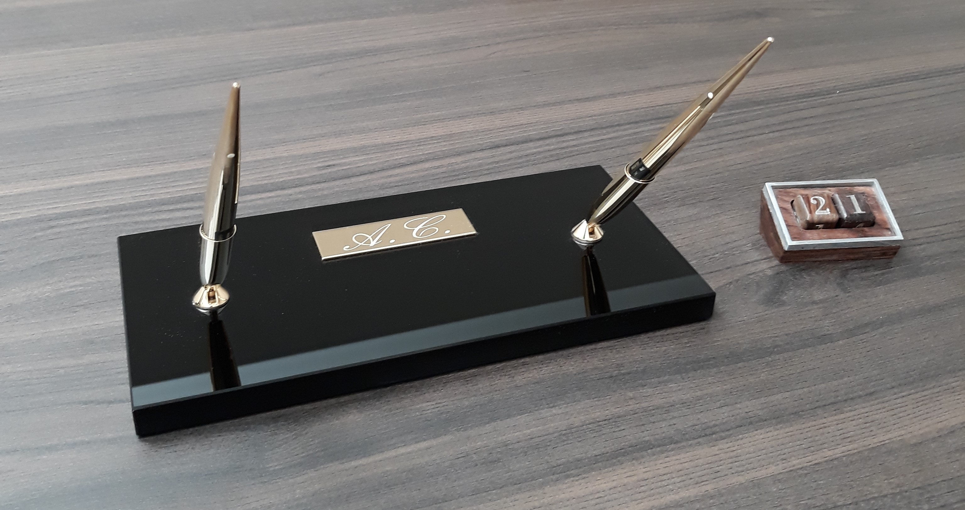 E’ costituito da una base in resina lucida perfettamente rifinita, che accoglie due calici dorati ed una placca dorata personalizzabile mediante incisione. L’inclinazione dei due calici è variabile, a scatto, su 4 posizioni. Un calice accoglie la stilografica Cart, con il bellissimo pennino intarsiato in oro a 14 carati (in questo caso con punta M), l’altro una penna a sfera con punta media.