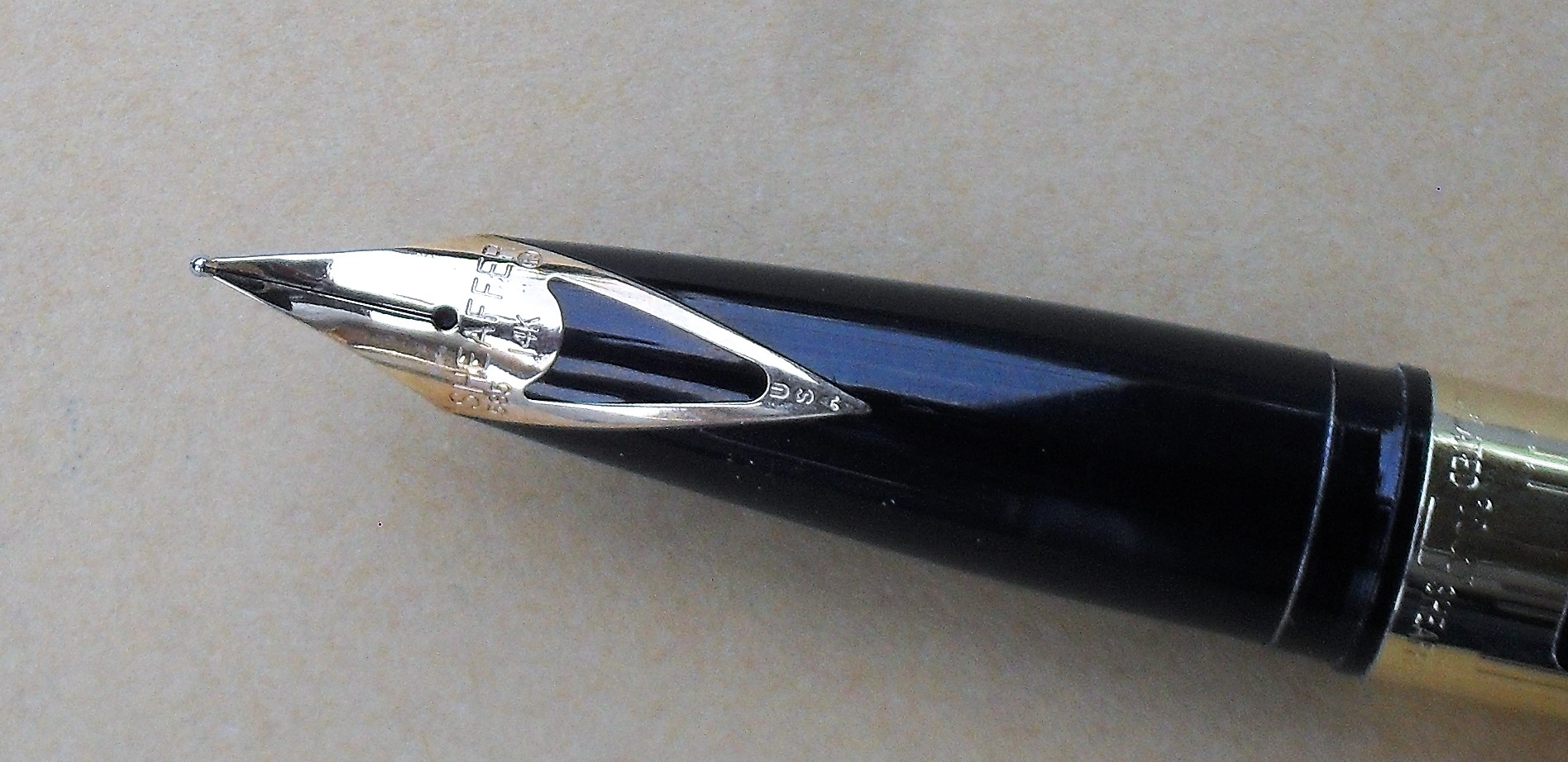 La stilografica è un perfetto strumento di scrittura: senza essere stata sottoposta ad alcun trattamento preventivo, inserita la cartuccia ha cominciato a scrivere prontamente, senza incertezze o difetti. La scorrevolezza della punta del pennino è piacevolissima ed il bilanciamento ottimo. La bellezza e l’eleganza del famoso pennino intarsiato, che Sheaffer introdusse nel 1959 per il modello Pen for Men e che a mio parere è imbattibile in termini estetici e d’eleganza, rende la scrittura ancora più piacevole.