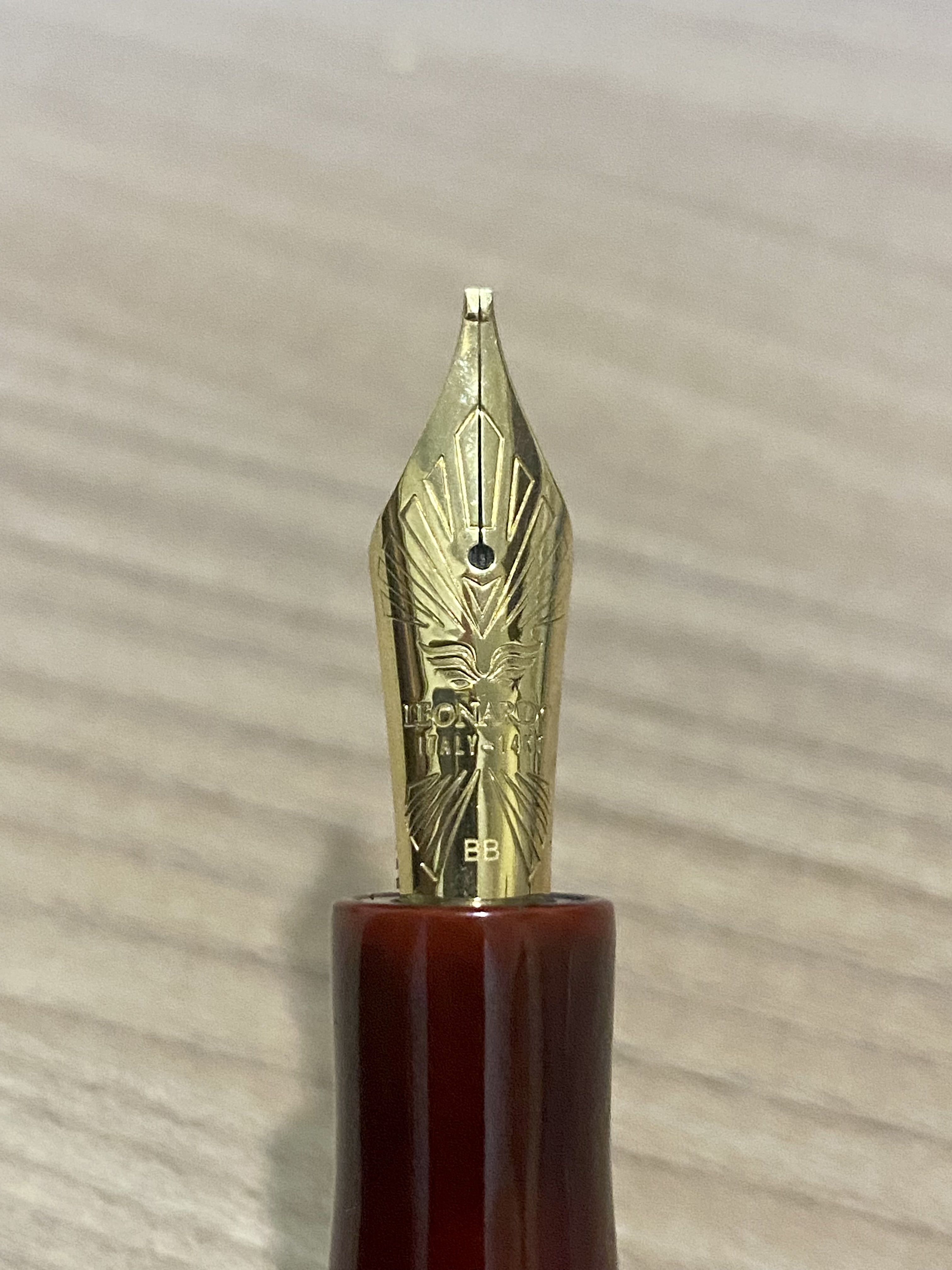 Il risultato è un pennino amichevole, scrive ad ogni inclinazione sulla carta con un piacevole feedback che ricorda un po’ i pennini Aurora, forse qui un pelino meno accentuato, giusto quel tanto quanto basta per sentire il pennino che scorre sulla carta. Ma quando si indovina il suo sweet spot si ha quel pelino di flusso in più che rende la scorrevolezza superba senza tuttavia mai diventare incontrollabile. Scrivendoci mi sembra di avere uno di quelle OMAS anni ‘80 con i vecchi pennini Bock, meno flessibile ma comunque morbido e scorrevole. Comunque la variazione di tratto c’è e ritorna bene, ma la cosa su un BB è difficile da vedere e capire e mi riservo, appena riesco, di provare un pennino F. Ovviamente l’alimentatore in ebanite di Leonardo ha il suo fondamentale ruolo in questa complessa equazione, garantendo un flusso di inchiostro continuo e costante.