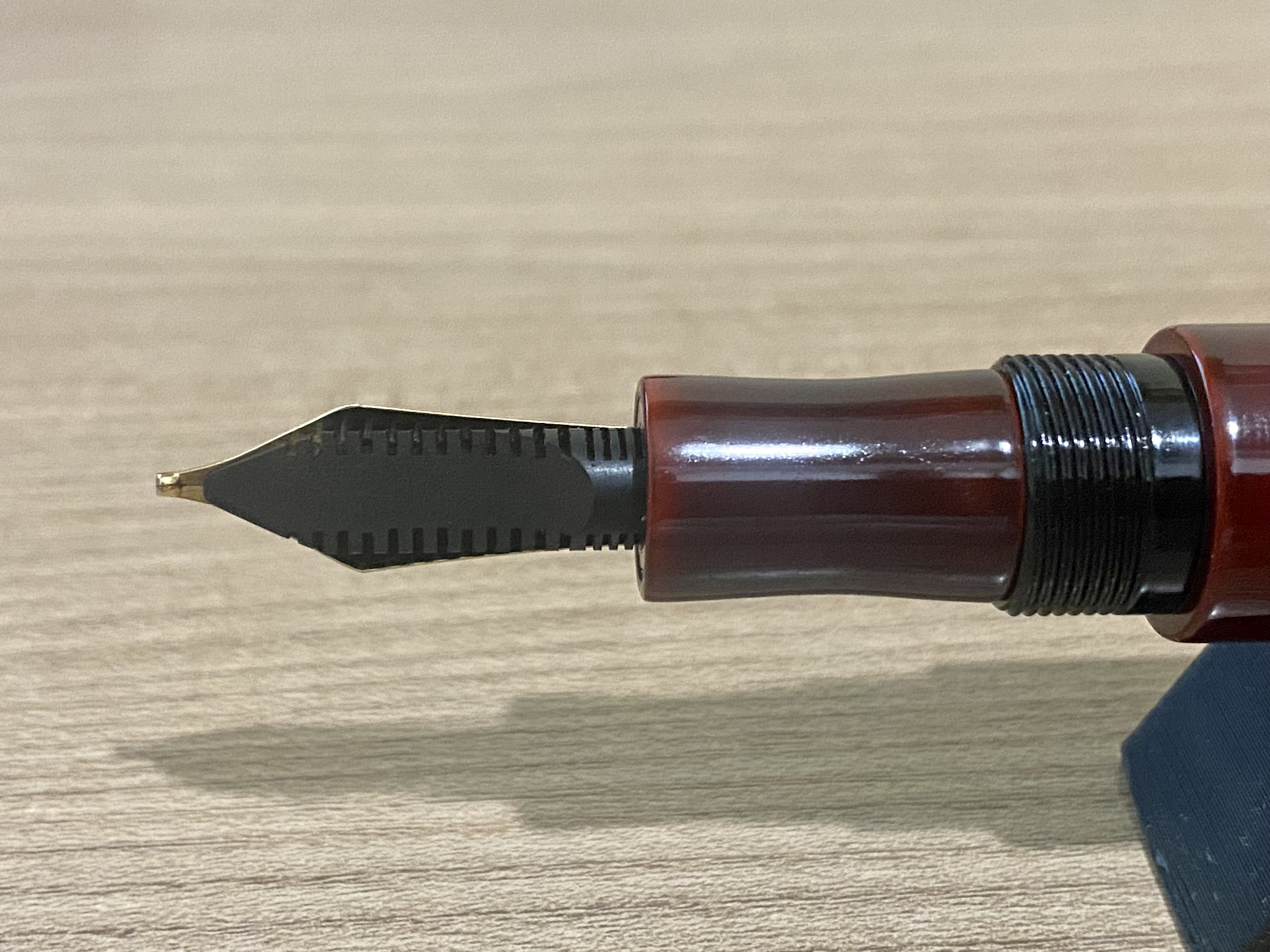 Non so che gruppo scrittura avesse in origine, io comunque ho chiesto espressamente di avere uno dei nuovi pennini prodotti in casa nella gradazione BB. Diciamo subito che non parliamo di un pennino dal flusso glorioso, uno di quelli da domare con inchiostri secchi, ed un tratto da far arrossire un pennino teutonico, questo BB ha un flusso perfettamente controllato leggermente spostato sul bagnato, mentre il tratto è moderato, direi giusto con una piacevole caratteristica “stubish”. Ad una attena analisi visiva sono rimasto colpito dalla forma dell’iridio, non è come quella che ci si aspetterebbe di trovare su un pennino stub, ha una bella pallina pronunciata che di profilo ricorda la forma di quella che si vede sotto un pennino Architec, solo che questa è larga e non stretta e tagliente.