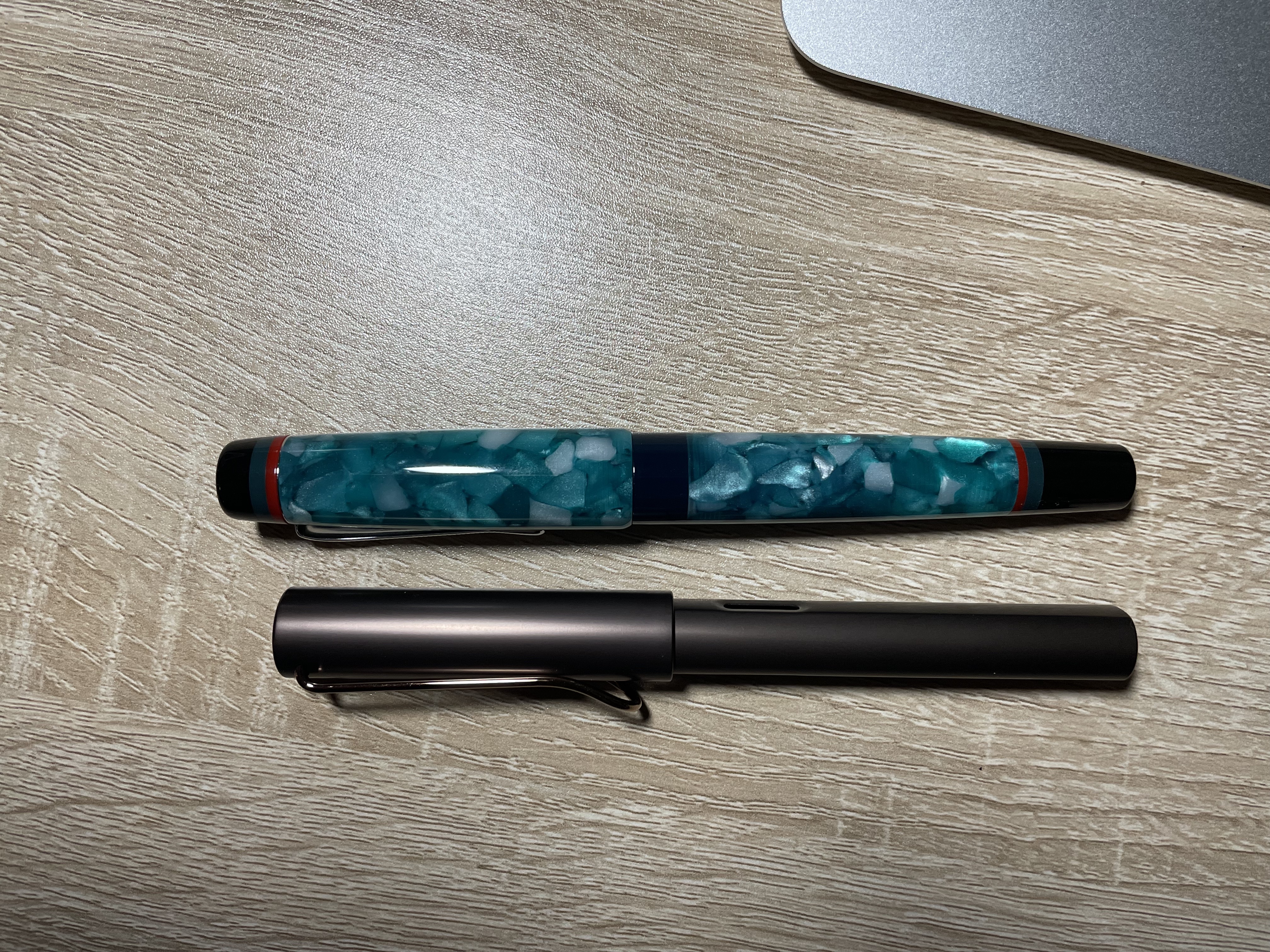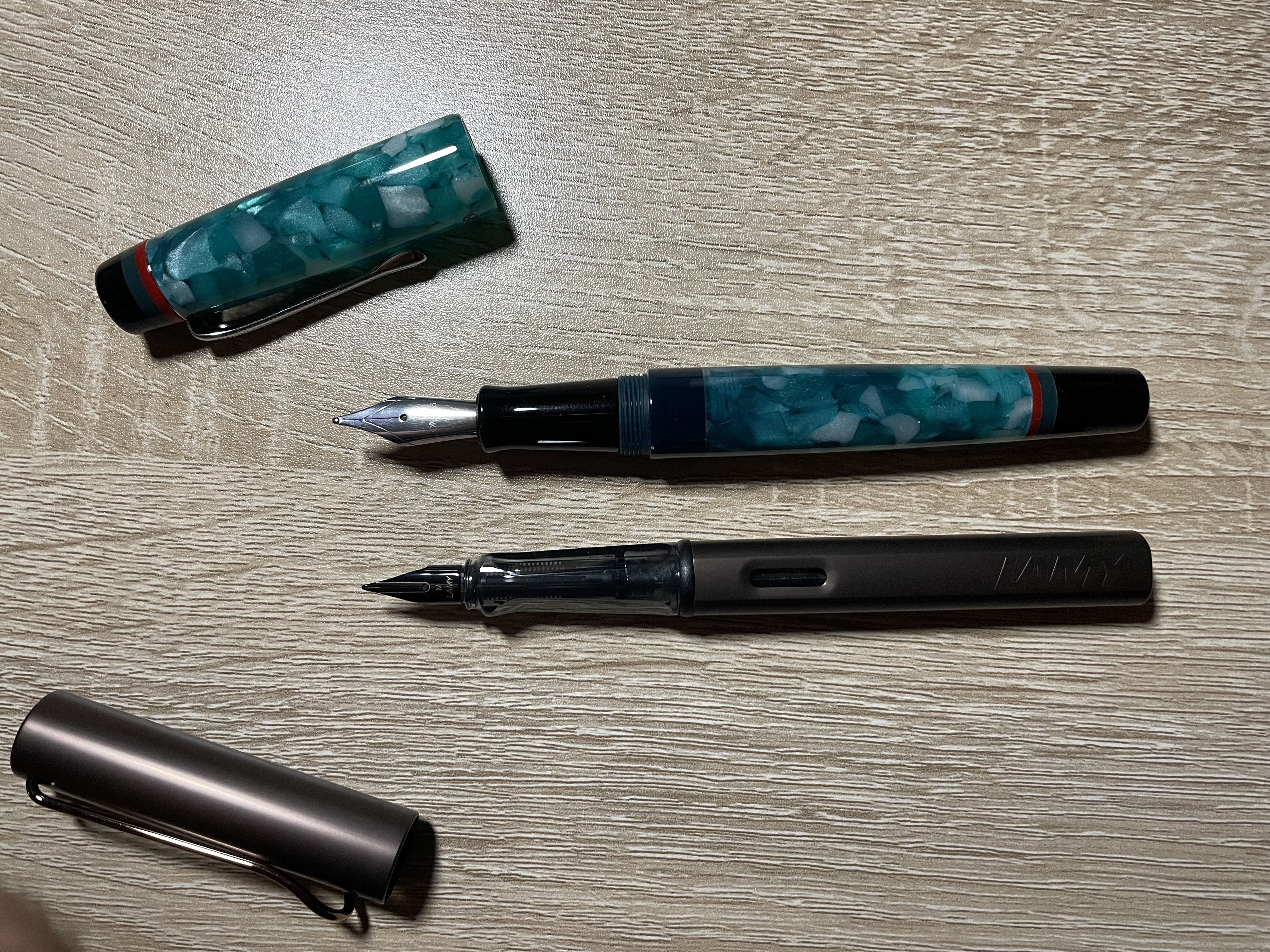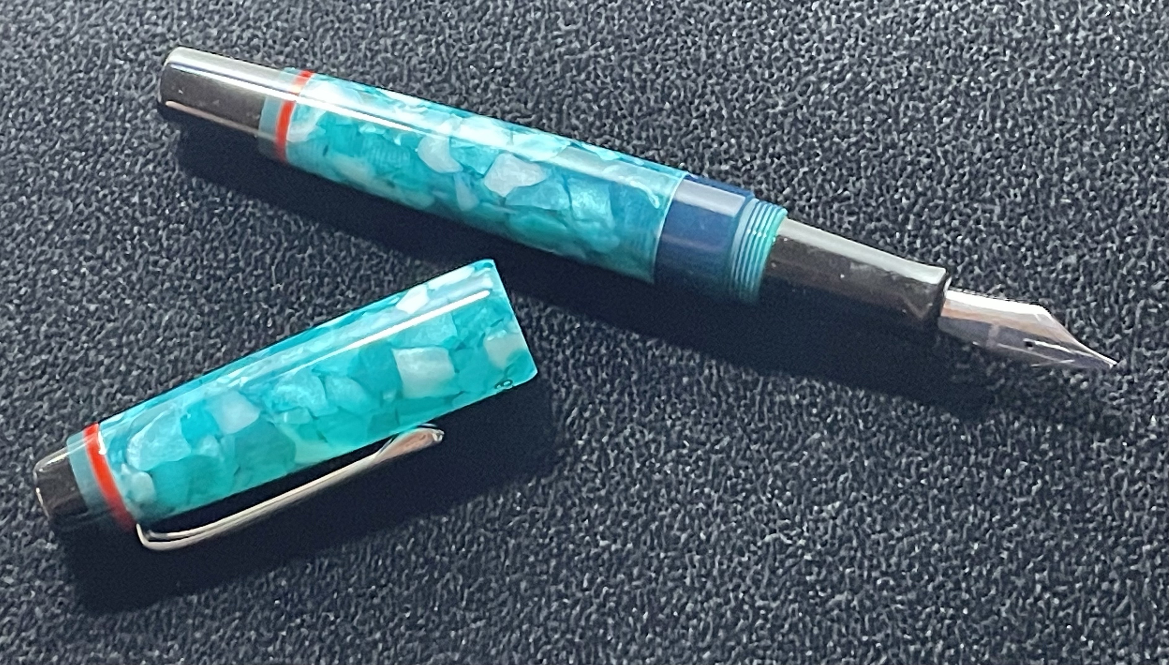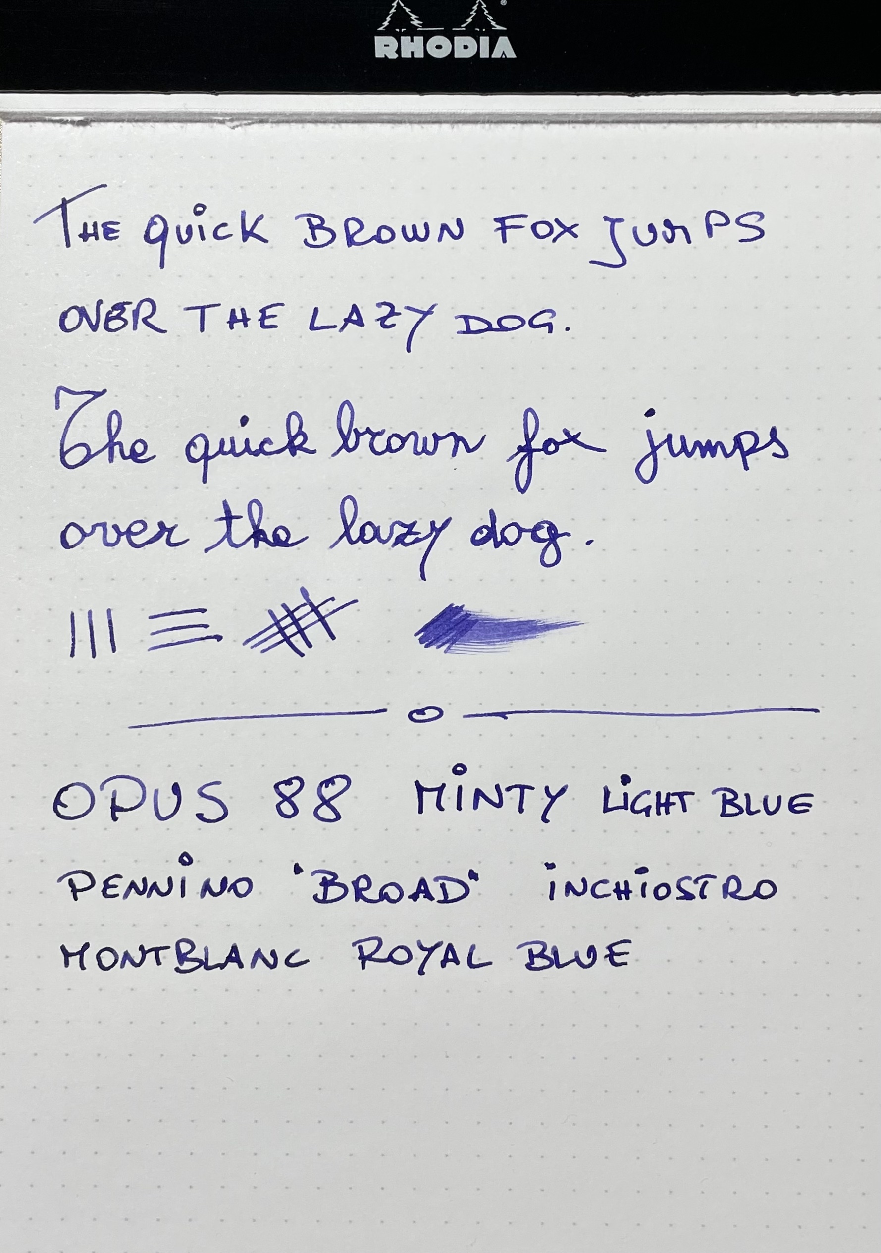 Buongiorno a tutti, questa è la mia prima recensione (forse è meglio dire impressione) di una penna che mi ha fatto sussultare quando l'ho vista per la prima volta. Si tratta di una Opus 88 Minty Light Blue, una penna di dimensioni importanti (io però ho le "manone") con una colorazione per me fantastica. L'ho scelta con il pennino broad perchè preferisco una scrittura ampia e veloce con un flusso giusto o appena leggermente abbondante. Per provarla ho scritto su carta Rhodia che essendo abbastanza patinata non è (secondo me) molto adatta a un pennino broad. Si avranno risultati certamente migliori con carta più ruvida. L'inchiostro usato è il Montblanc Royal Blue che ben gli si abbina. Per concludere... è stato un acquisto d'impulso del quale non mi sono affatto pentito!