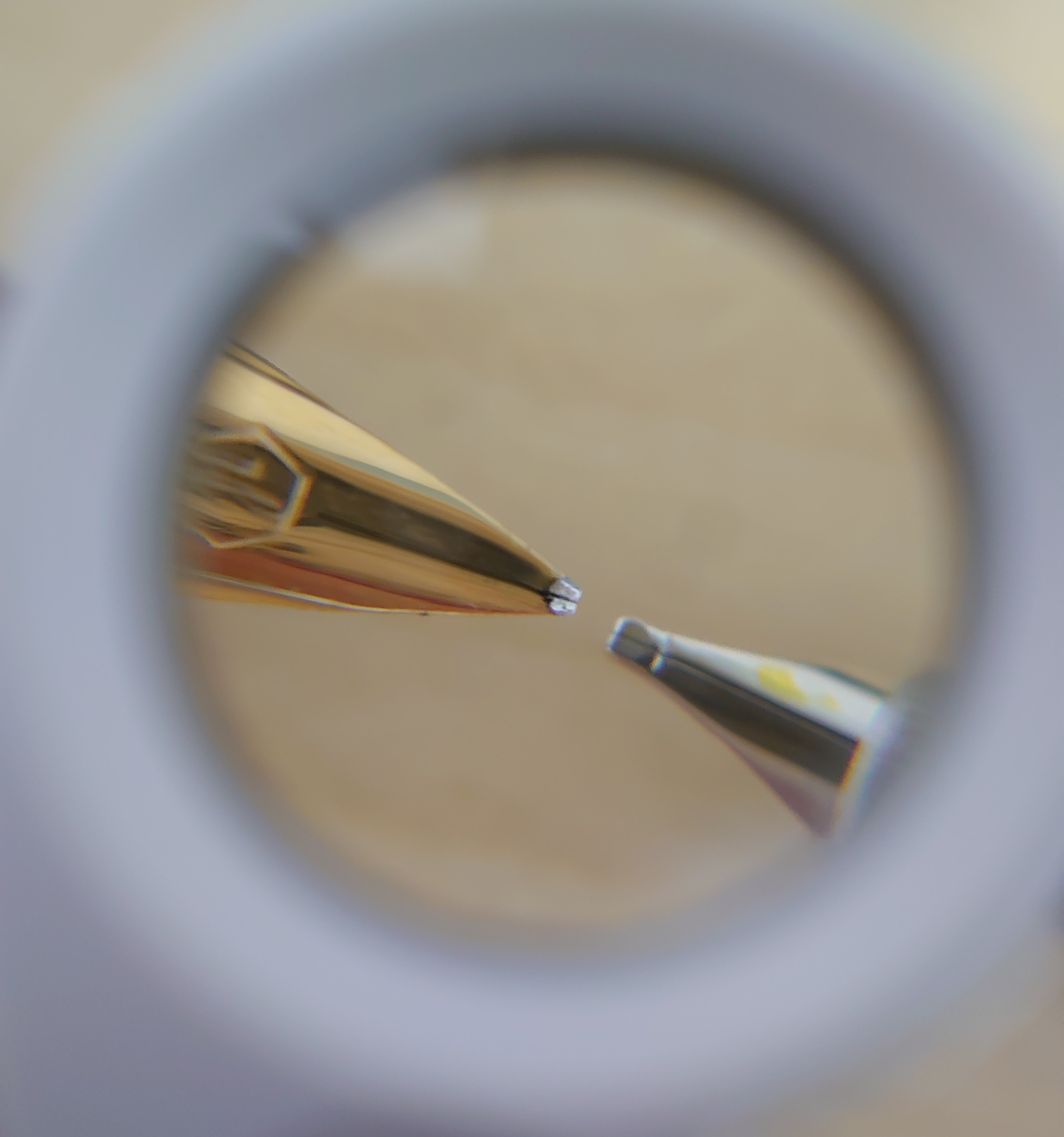 un suggerimento fuori tema che vorrei fare a riguardo è per il pennino L di waterman. ha la classica forma "a cubetto", come la chiamo io, dei pennini BB e come grandezza mi sembra proprio a metà tra un B ed un BB lamy (ed è la misura che più preferisco nella mia collezione). nella comparazione sto usando un inchiostro secco sulla waterman (il grigio) ed un iroshizuku sulla 2000. quindi utilizzando un inchiostro più scorrevole su entrambe le penne la situazione potrebbe essere anche più simile