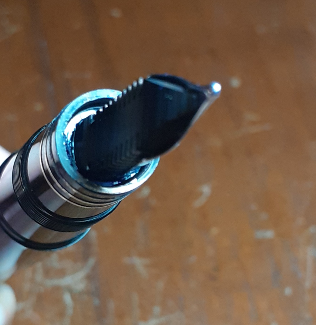 Ho usato quindi un pezzetto di cartuccia sheaffer, tagliandola lateralmente perché di diametro inferiore all'alimentatore e l'ho messa così senza fissarla.. Ho poi inserito il pennino che sta perfettamente fermo e in un atto di audacia ho pure caricato la penna..... beh...non ci crederete ma dopo un giorno nessun problema, domani la porto pure in ufficio. Chiaramente la pezza messa è facilmente reversibile, presumo sia possibile creare in 3d un nuovo collarino ma nell'attesa la uso :wave: