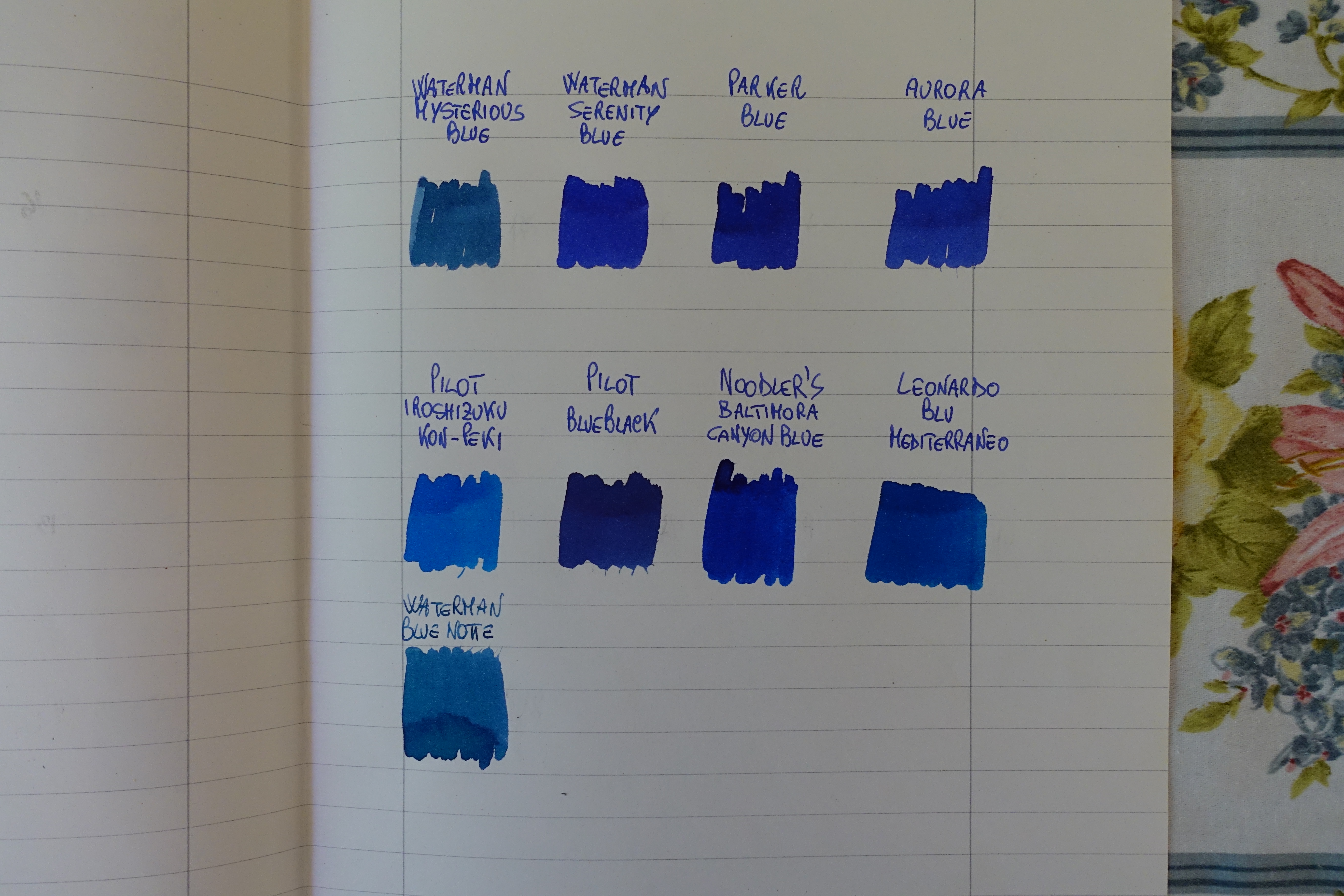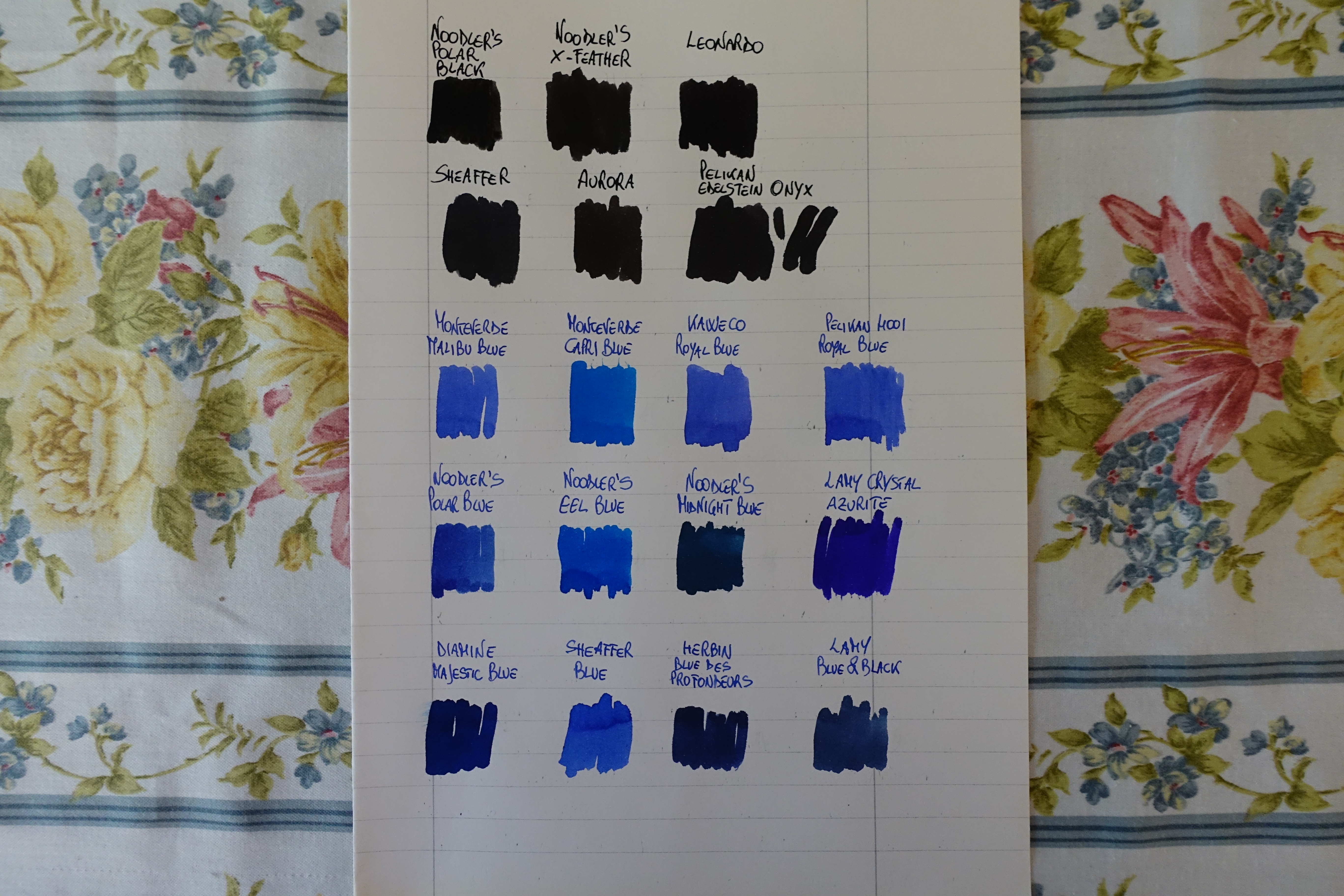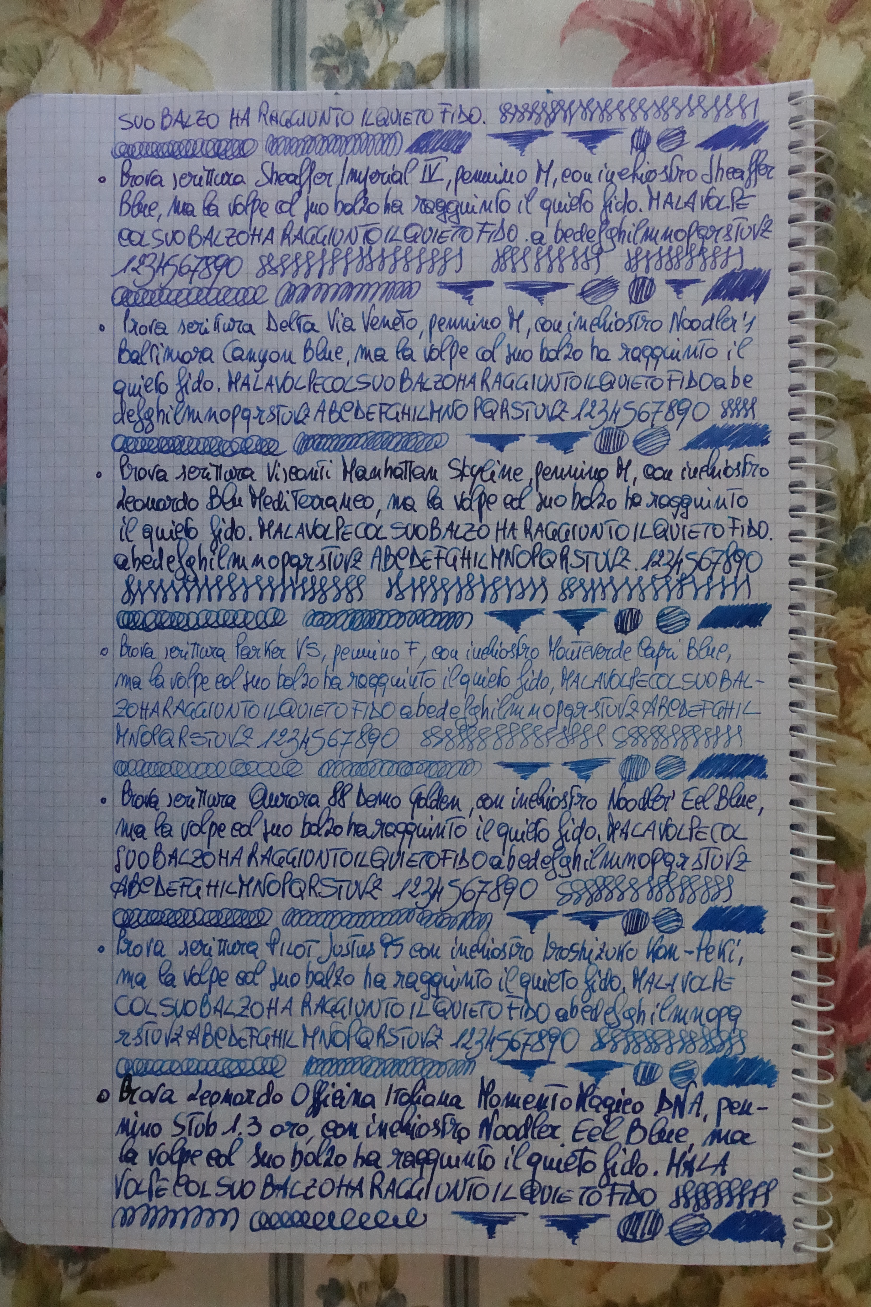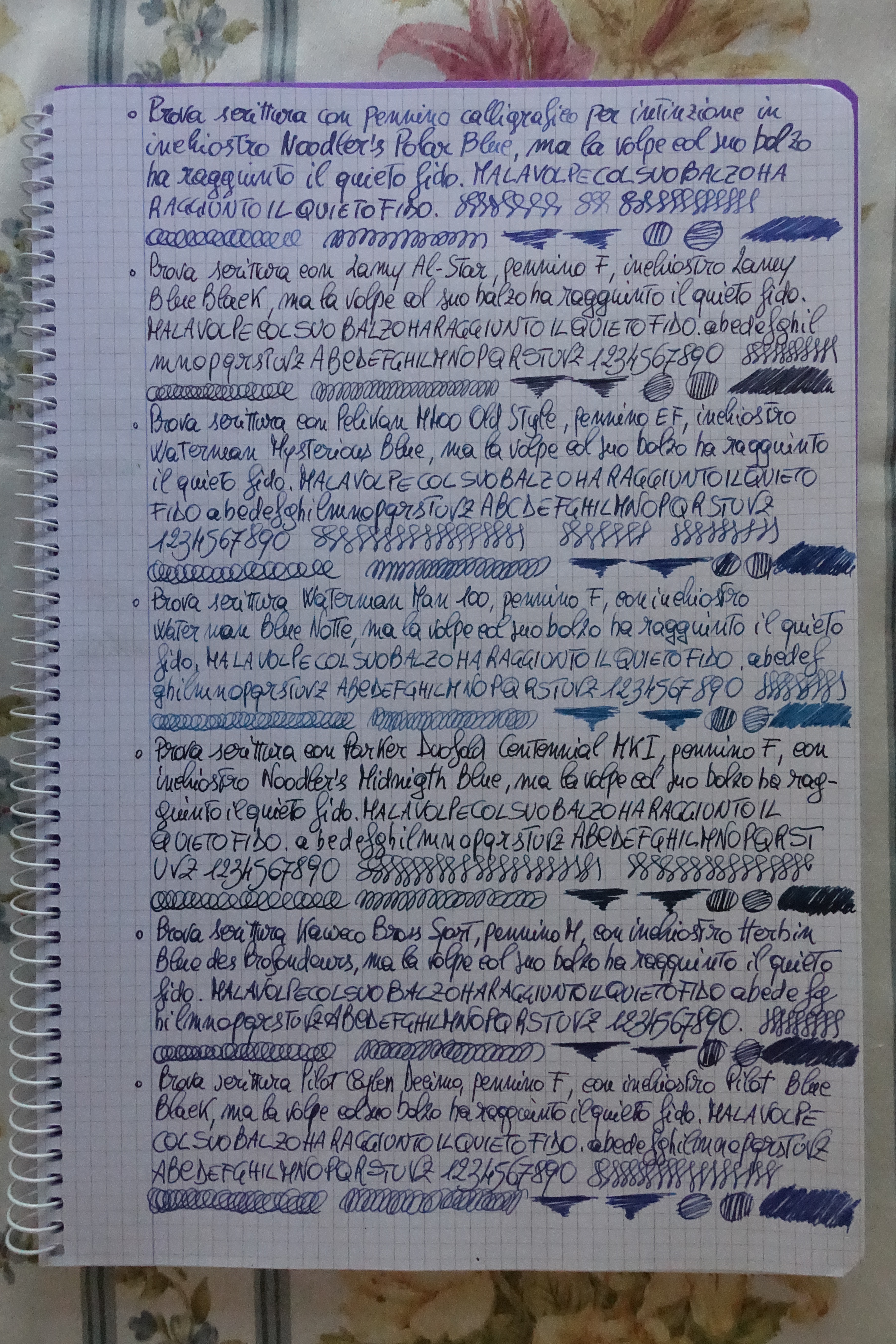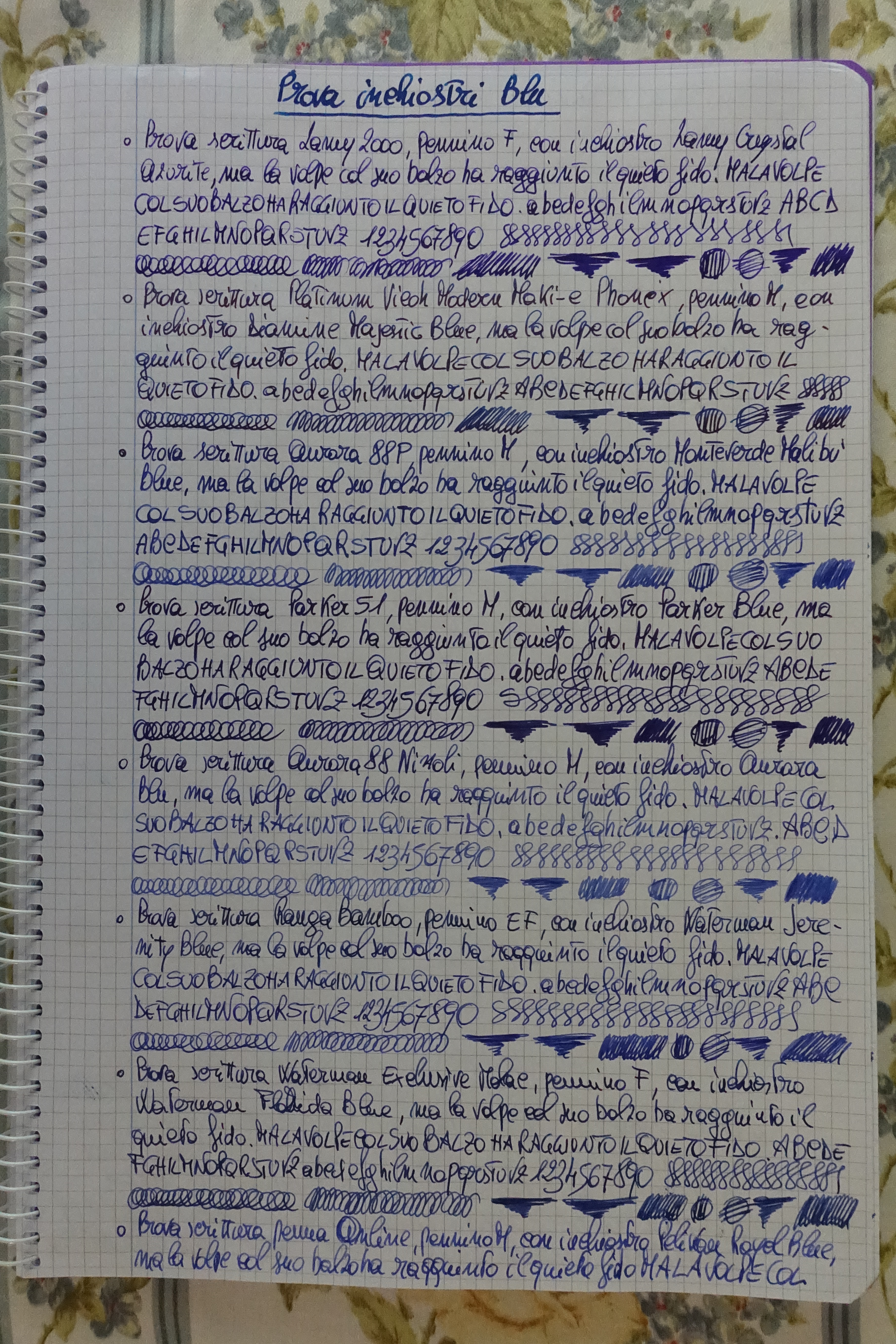 Facendo seguito ad un mio precedente argomento sul "Blu di Giotto" ho fatto una specie di tavola di confronto sugli inchiostri che uso, soprattutto per ricordarmi il tipo che ho caricato sulla particolare penna. Una vera verifica dovrebbe essere fatta usando la stessa identica penna e carta da scrivere con i vari inchiostri ma assolutamente non ho voglia di pulire e lavare una stilografica per 35 volte.