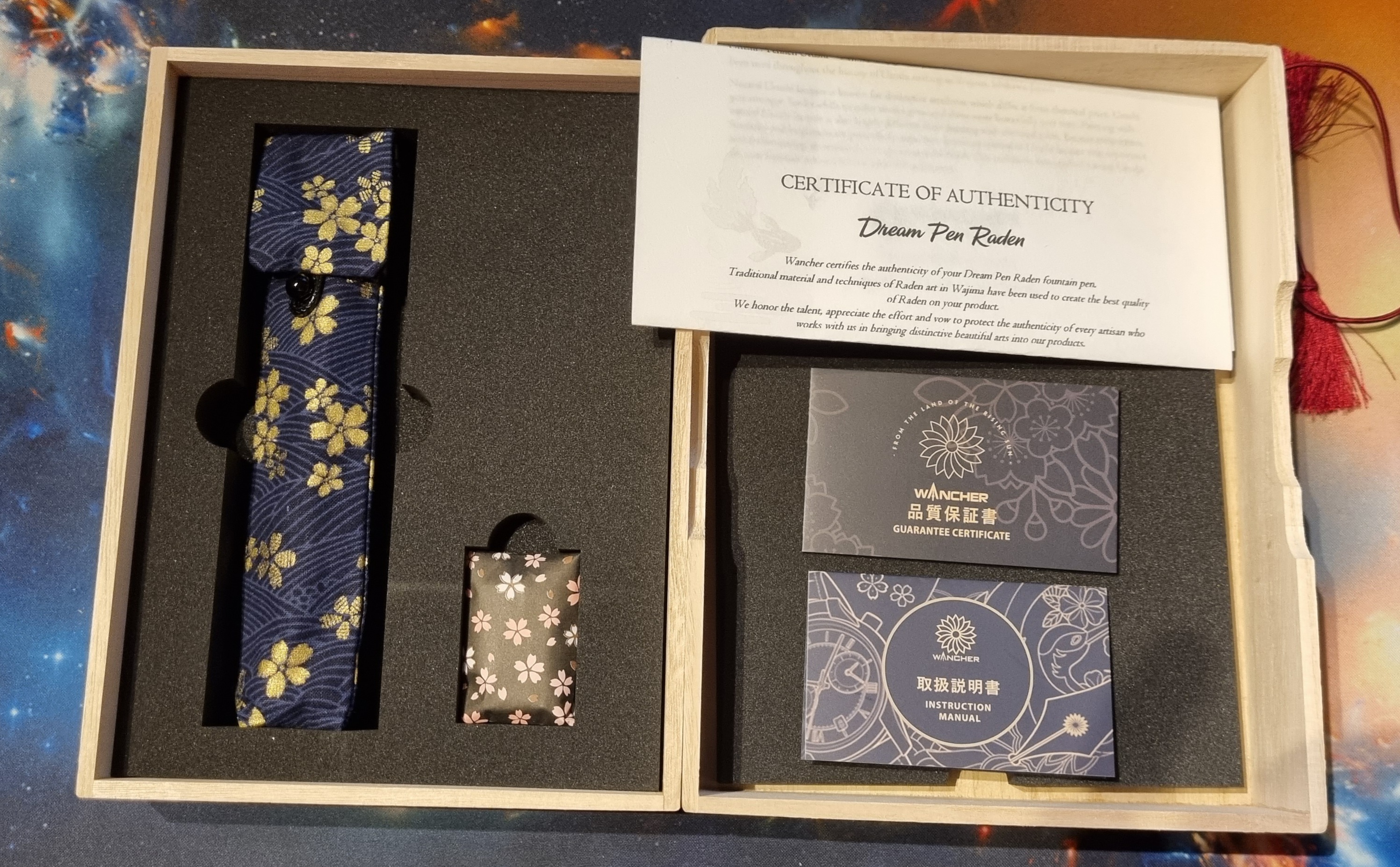 Nella confezione c'è la penna, completa di converter, una custodia, delle cartucce impacchettate, e i documenti.