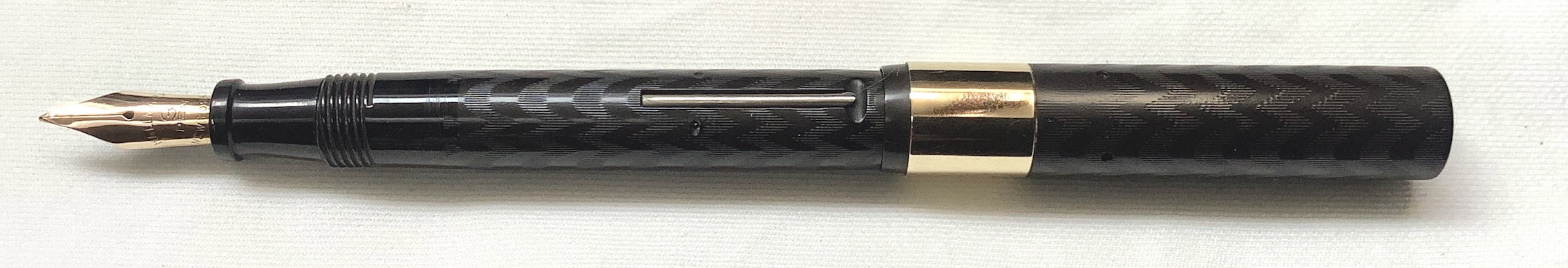 Per riferimento, questa stilografica Hallmark in ebanite cesellata sarebbe l'esatta copia della Karker Pen Model 34(S) , ad eccezione del cappuccio con fermaglio fisso e di una modesta lavorazione a sbalzo sulla banda in metallo dorato, presenti solo sulla Model 34(S).