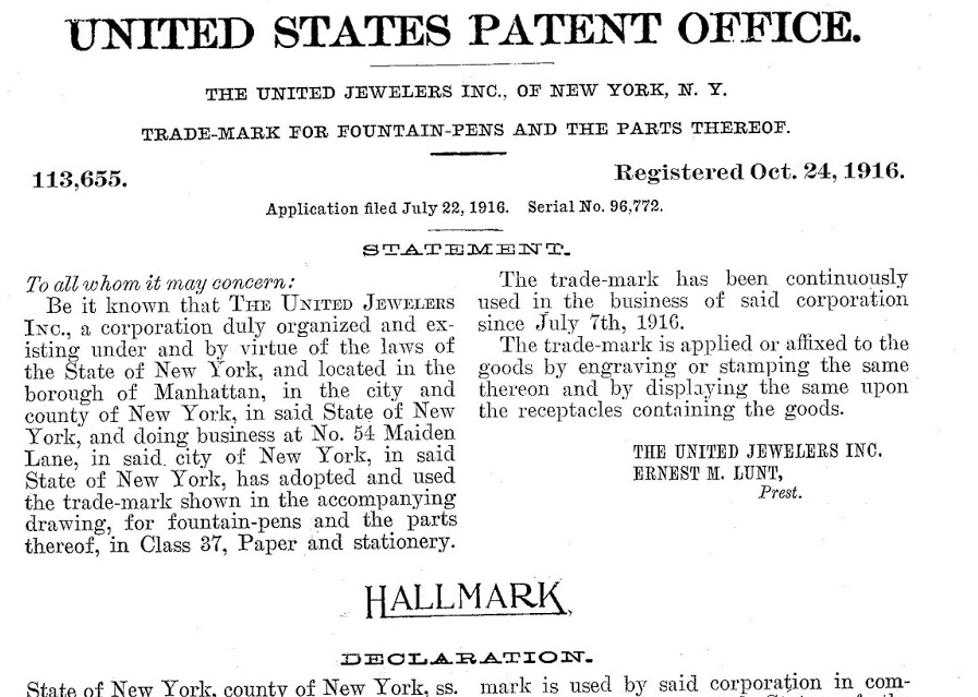 Qualche cenno sul marchio. E’ stato depositato nel 1916 dalla The United Jewelers Inc. con sede a New York ed adottato quale marchio per le penne stilografiche e cancelleria (es. matite). Di fatto la United Jewelers era una corporation con negozi di gioielleria sparsi nelle principali città americane e con questa mossa intendeva anche proporre alla loro clientela penne e matite meccaniche.