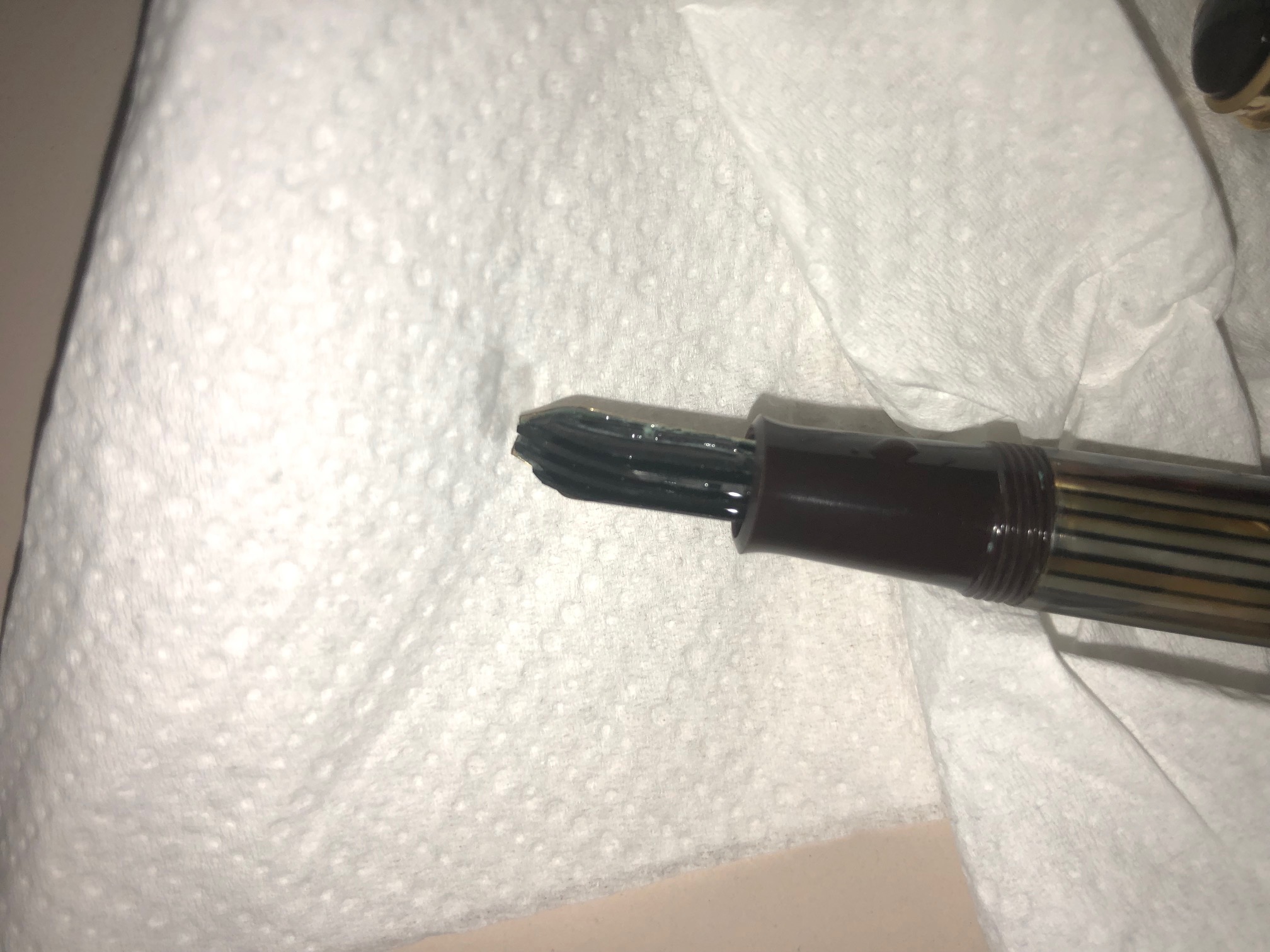 Il collare che tiene insieme alimentatore e pennino nelle Pelikan è molto stretto. Se il collare non è rotto, anche tirando, il pennino non esce (se il collare è rotto il pennino esce anche tenendolo solo con le mani...)