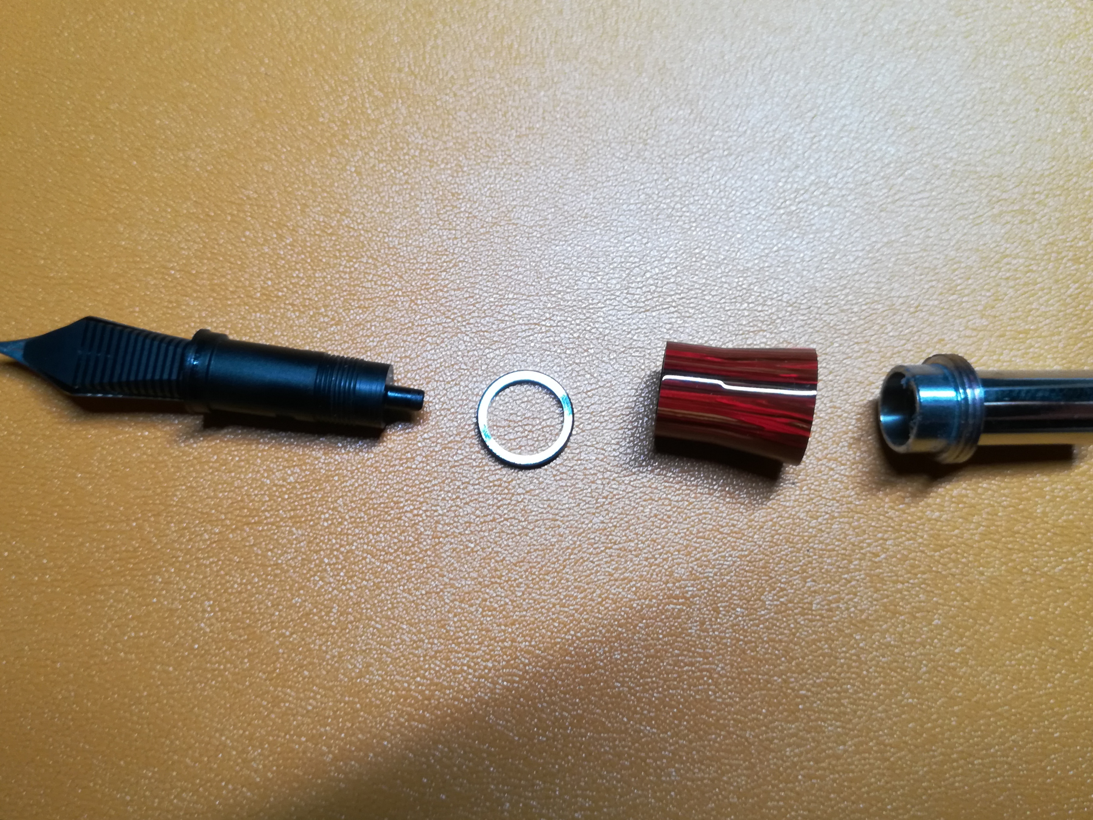 Visto che ne hai una, la sezione della tua quanto si smonta? Perché oggi ho dato una pulita alla mia e mi è venuto via tutto. come in foto. non ho fatto nessun movimento o tirato, girando per togliere il pennino si è allentato tutto e la parte in resina della sezione si è allontanata dalla filettatura in metallo e poi bastava sfilarla senza nessuno sforzo e senza resistenza. Una volta rimontata è stabile e sembra un unico pezzo.