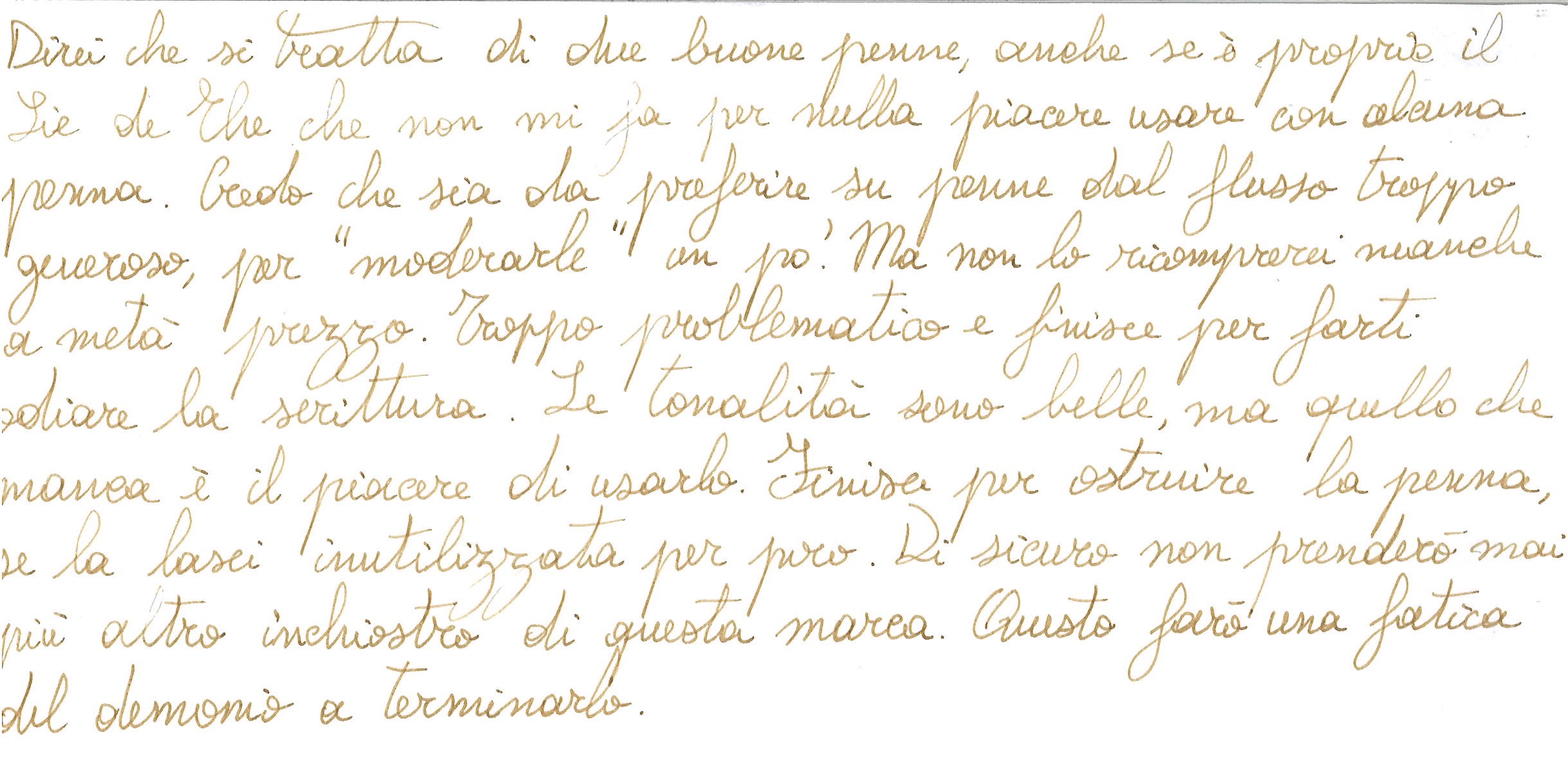 Su Herbin, parimenti ho riportato le mie impressioni d'uso. Mi intasa tutte le penne (non le lascio senza cappuccio, nè in posizioni strane). L'unica con la quale riesco a usarlo (con fatica) è la Pelikan 400NN, che ha un flusso molto generoso e una consistente variazione di tratto. Sarò incappato io in una boccetta fallata (vecchia, forse?) ma sto seriamente pensando di lanciarlo dalla finestra.