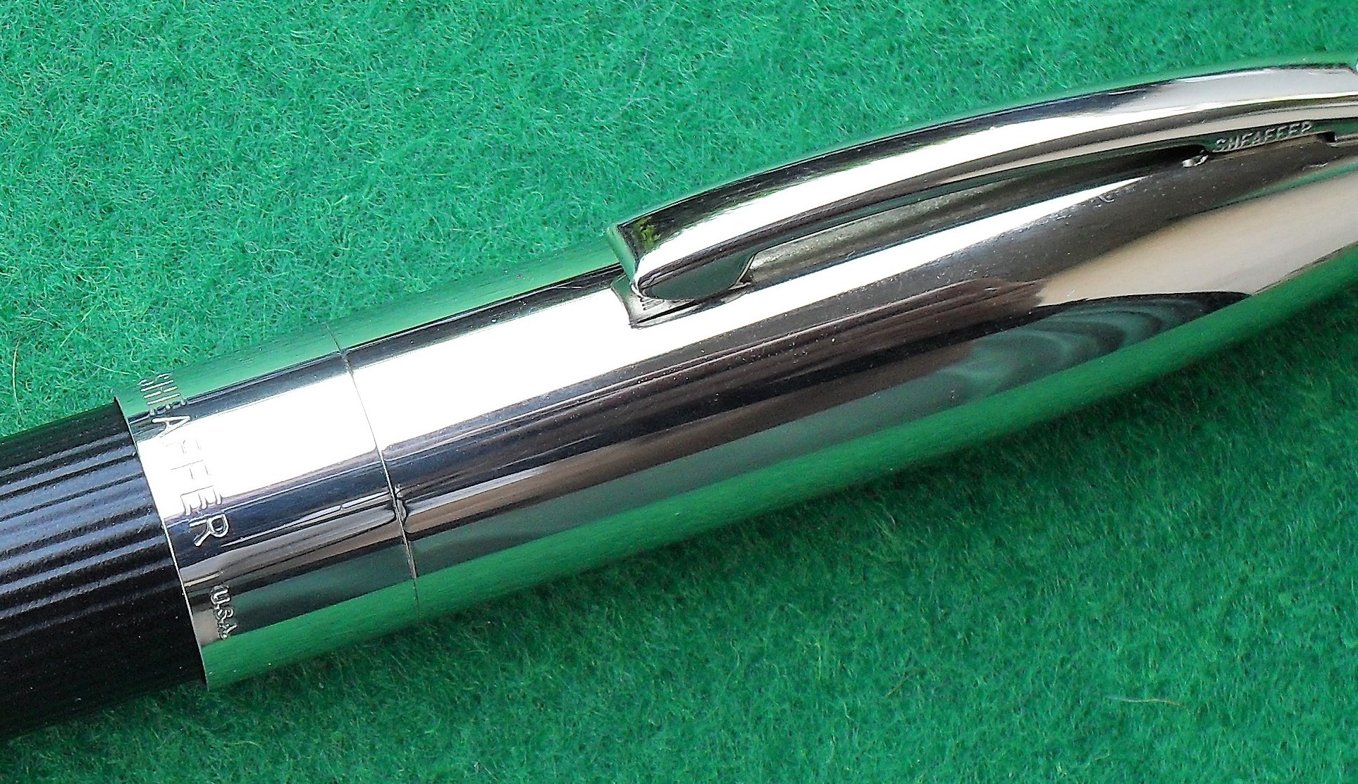 Il bellissimo, per quanto semplice, “white dot”, il punto bianco divenuto sinonimo di Sheaffer’S, non stona affatto ed è senza dubbio più discreto ed elegante d’altri marchi dello stesso colore. Nel caso di questo modello, se non vado errato, il “white dot” significa ancora garanzia a vita, come in origine. Purtroppo, mi riesce difficile confermarvelo, perché non dispongo della garanzia originale. Il cappuccio chiude con uno scatto molto convincente, che promette una tenuta eccellente. La clip a molla, che scongiura perdite di tensione dovute al maneggiamento, esercita un’ottima pressione.