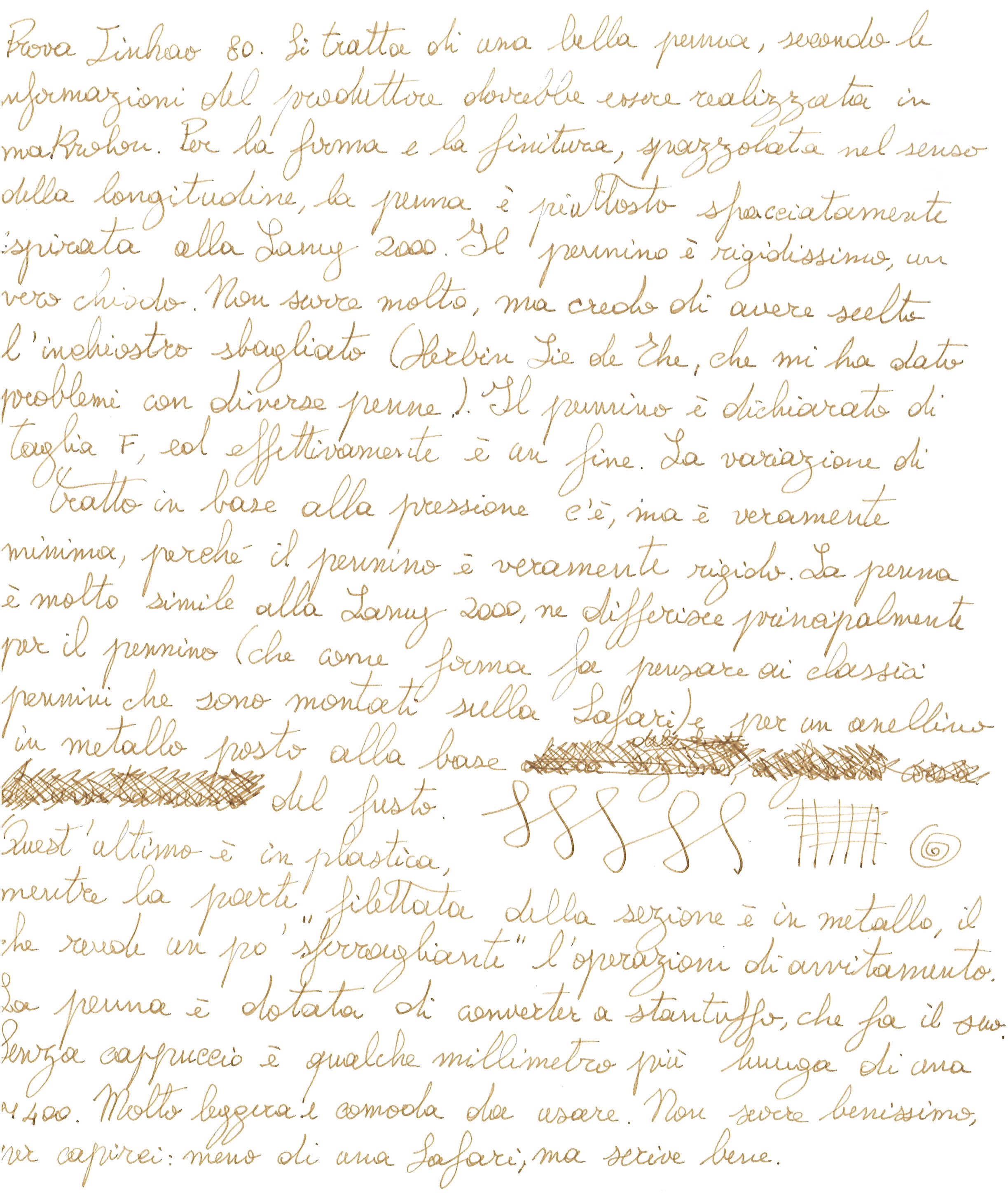 Su Herbin, parimenti ho riportato le mie impressioni d'uso. Mi intasa tutte le penne (non le lascio senza cappuccio, nè in posizioni strane). L'unica con la quale riesco a usarlo (con fatica) è la Pelikan 400NN, che ha un flusso molto generoso e una consistente variazione di tratto. Sarò incappato io in una boccetta fallata (vecchia, forse?) ma sto seriamente pensando di lanciarlo dalla finestra.
