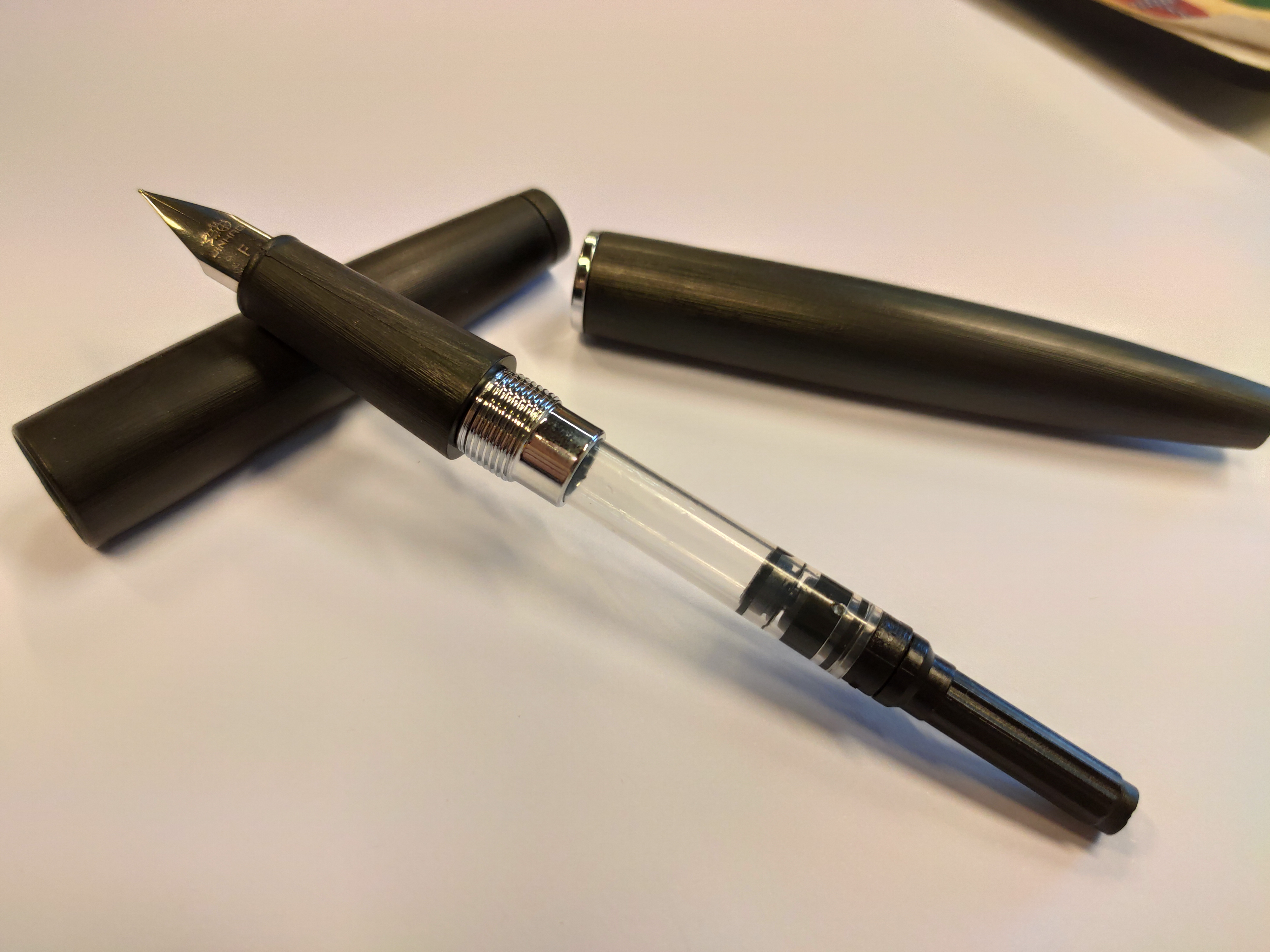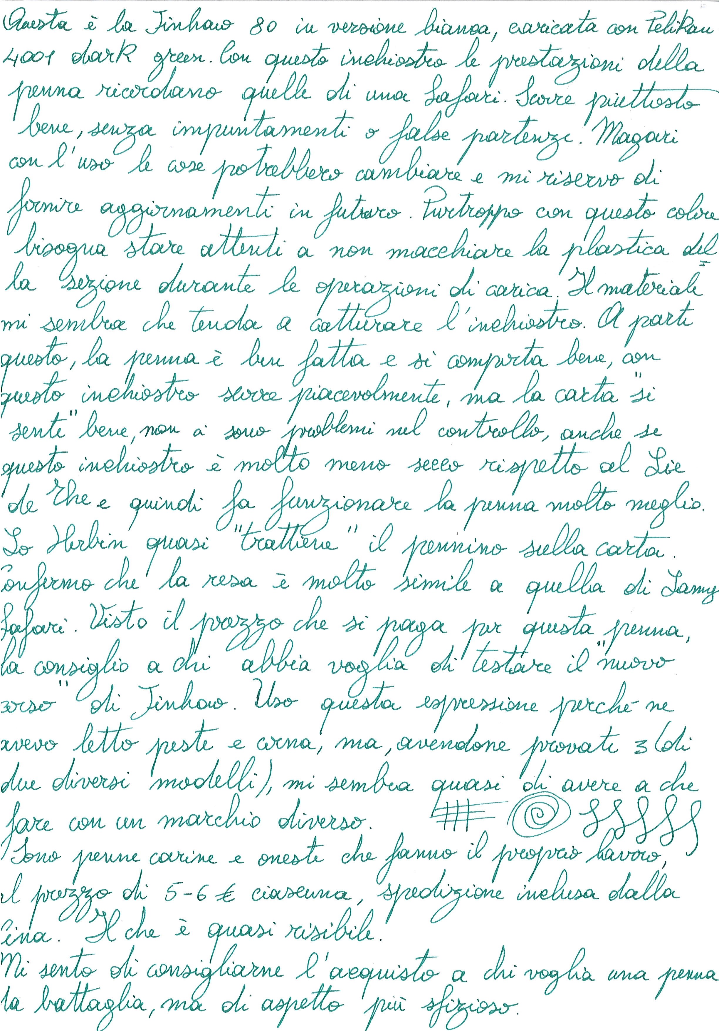 Ho fatto l'errore di caricare la nera con Herbin Lie de The, che è un inchiostro che secca moltissimo i pennini (e riduce il flusso fino ad azzerarlo). Lo fa con tutte le penne che ho, quindi non era il più indicato per una prova e, personalmente, ho finito per detestarlo. La bianca, però, è stata caricata con Pelikan 4001 dark green e la resa è stata perfetta.