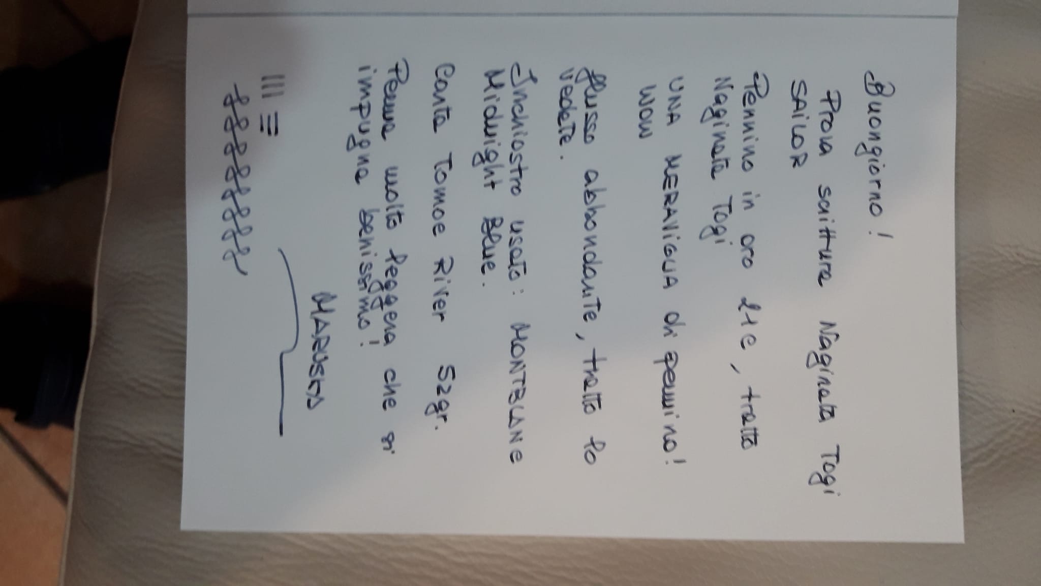 Silvia1974 ha scritto: domenica 30 ottobre 2022, 6:54 Grazie! Davvero molto chiara come spiegazione :thumbup: Bella penna. Inizio a capire come mai con la mia Sailor 1911 che ho venduto non mi trovavo. Aveva di fatto un tratto architect, non chiedetemi perché, e probabilmente la impugnavo non correttamente. Il Naginata dev’essere bellissimo da usare! :)