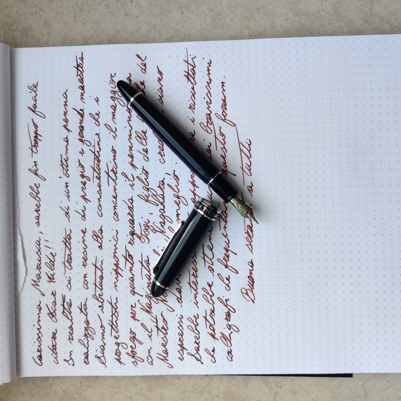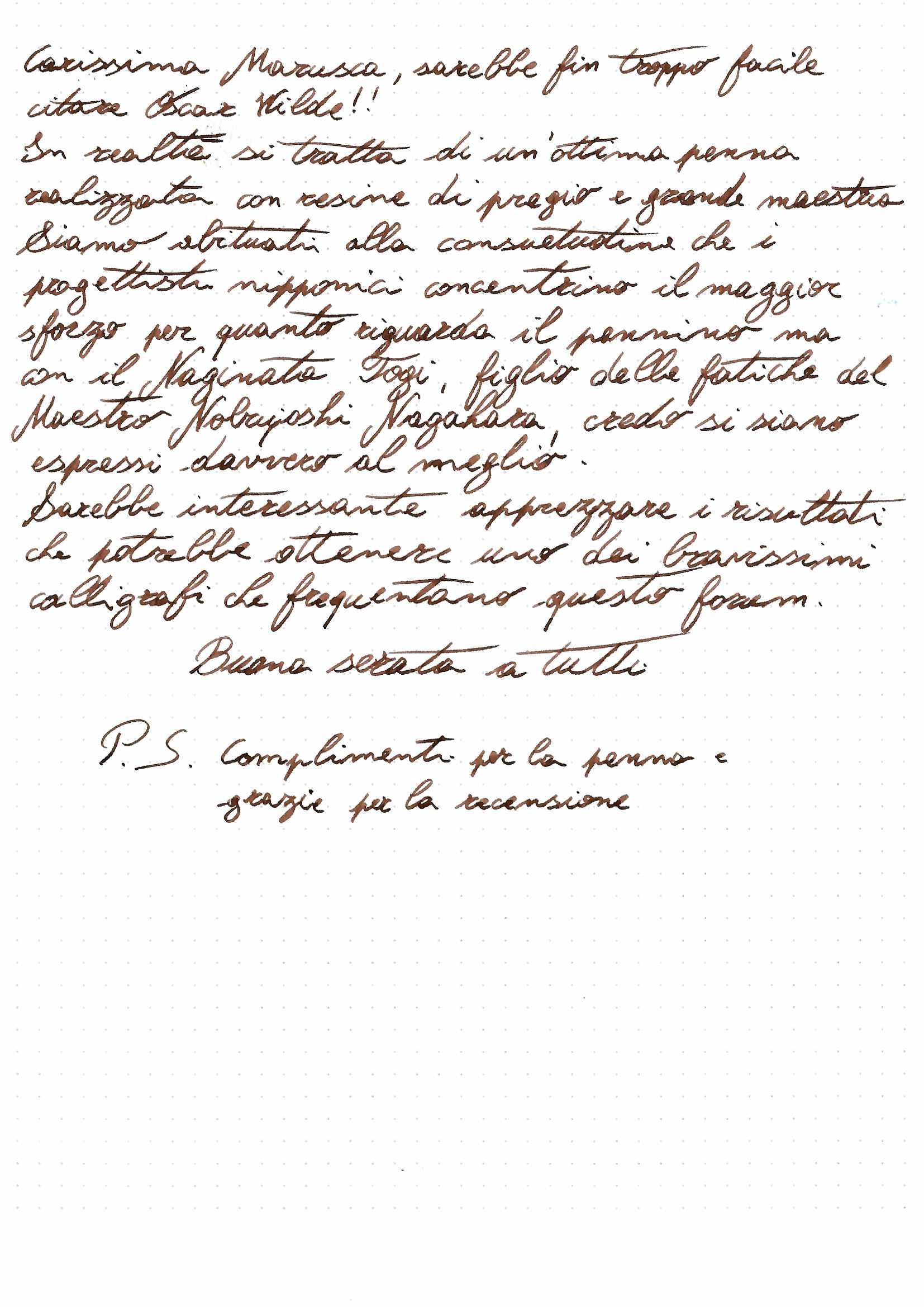 E' una penna che non mi sento di consigliare per un uso quotidiano e continuativo, ma per scrivere il proprio diario, sì! Non me la porterei in ufficio per scrivere sul brogliaccio per esempio o sullo scadenziario. E' una penna da calligrafia senza bisogno di essere dei calligrafi, basta mettere il pennino sul foglio e andare, e il pennino da solo rende una scrittura stupenda. E' un pennino che ama un certo tipo di carta, tipo la Tomoe River oppure la Midori MD paper, sulla quale ha un certo attrito e non slitta, meno bene su Clairefontaine o Rhodia, che risultano troppo lisce e patinate e il pennino tende a scivolare. No su carta troppo porosa perché a causa del flusso molto bagnato, il tratto perde il suo stile e tanto vale scrivere con un broad Lamy o Pelikan.