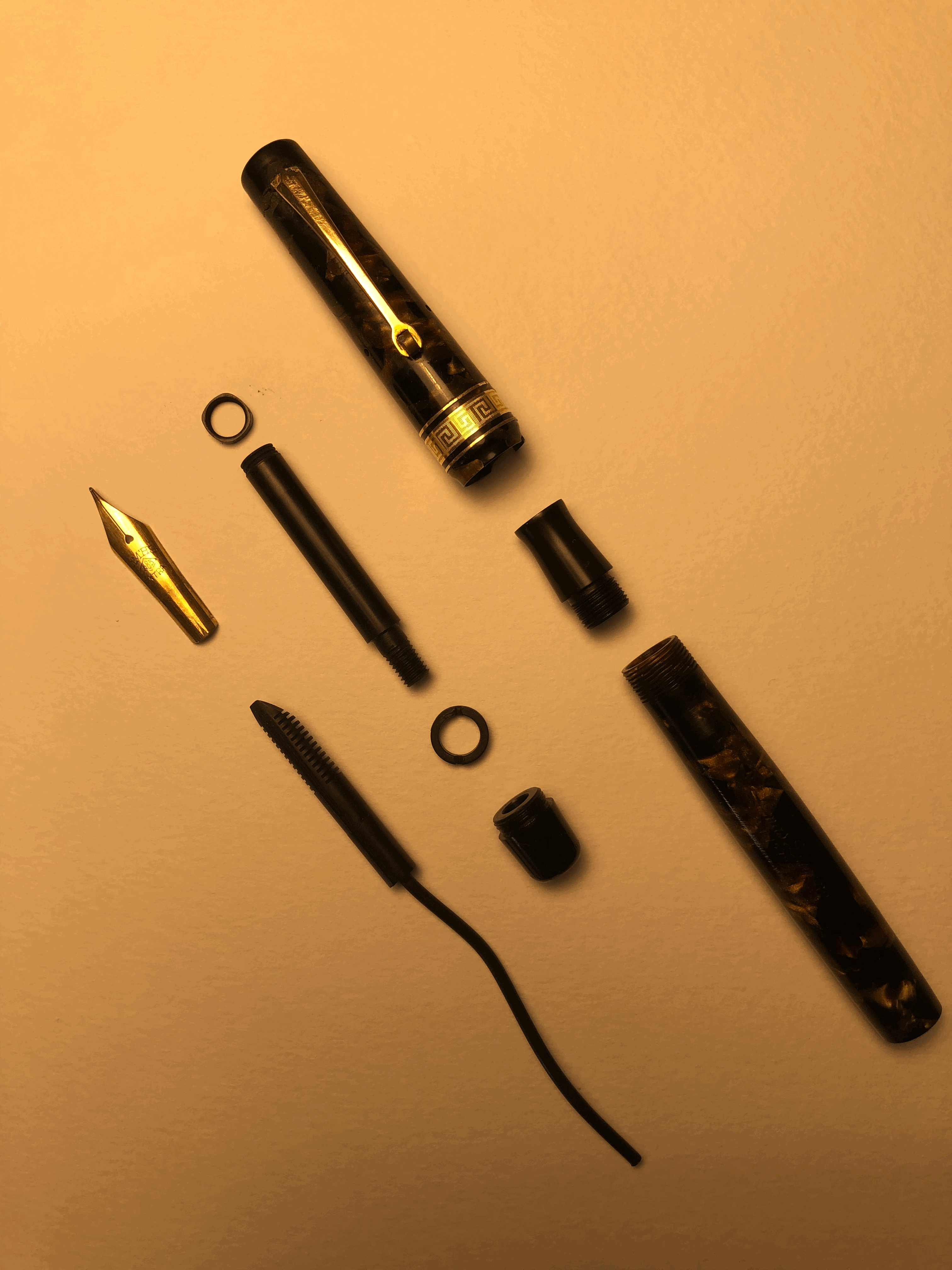 Io ne ho un paio, entrambe restaurate. Lo smontaggio non è dei più semplici, si svita la sezione, il pennino è incastrato a frizione nella sezione assieme all'alimentatore dal quale parte il tubicino di sfiato. la parte del fondello a me ha dato qualche difficoltà e in effetti non riuscendo a svitarlo la ho data a uno che ripara. Lascio una foto della mia smontata (quella marrone prima serie), che ovviamente ho smontato solo perché mi è, fortunatamente, riuscito facile, si è svitato tutto in un attimo, e le ho cambiato il sughero.
