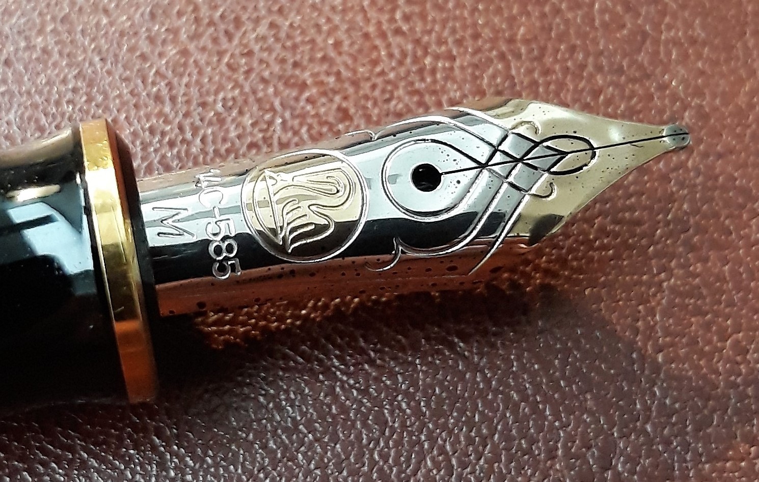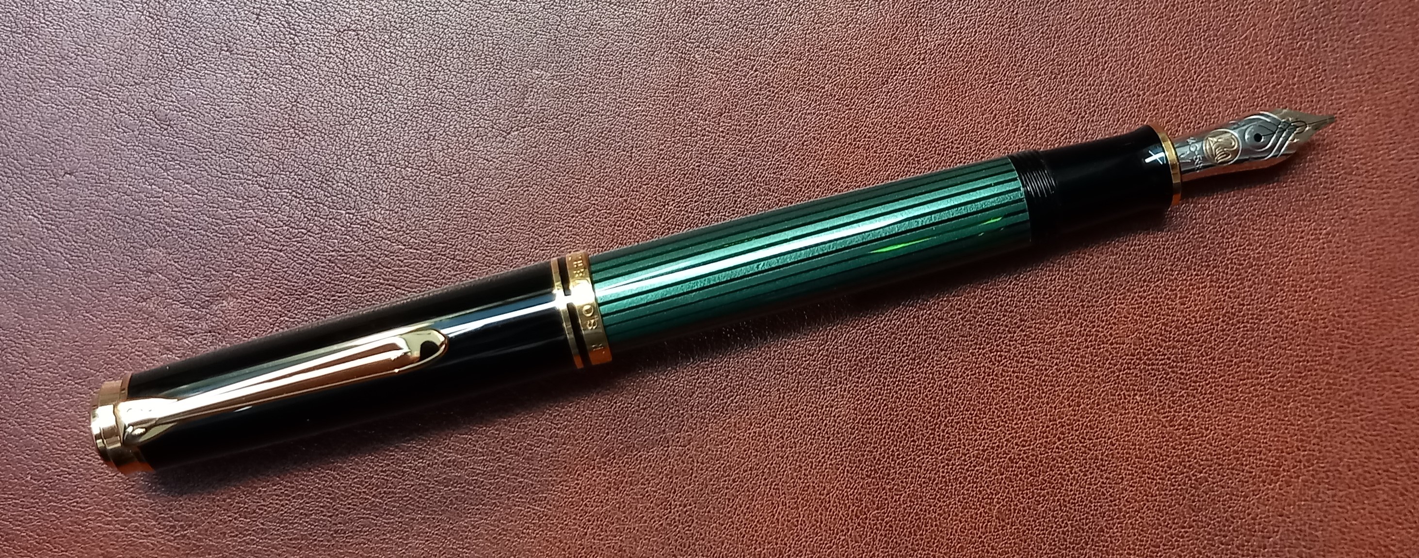 La livrea è quella classica verde e nera con finiture dorate, che trovo sempre elegante, non noiosa né scontata. L’alimentazione è a pistone, sistema di caricamento introdotto proprio da Pelikan nel 1929 ed ancora molto apprezzato. Il pennino è d’oro a 14 carati, bicolore e graziosamente inciso.