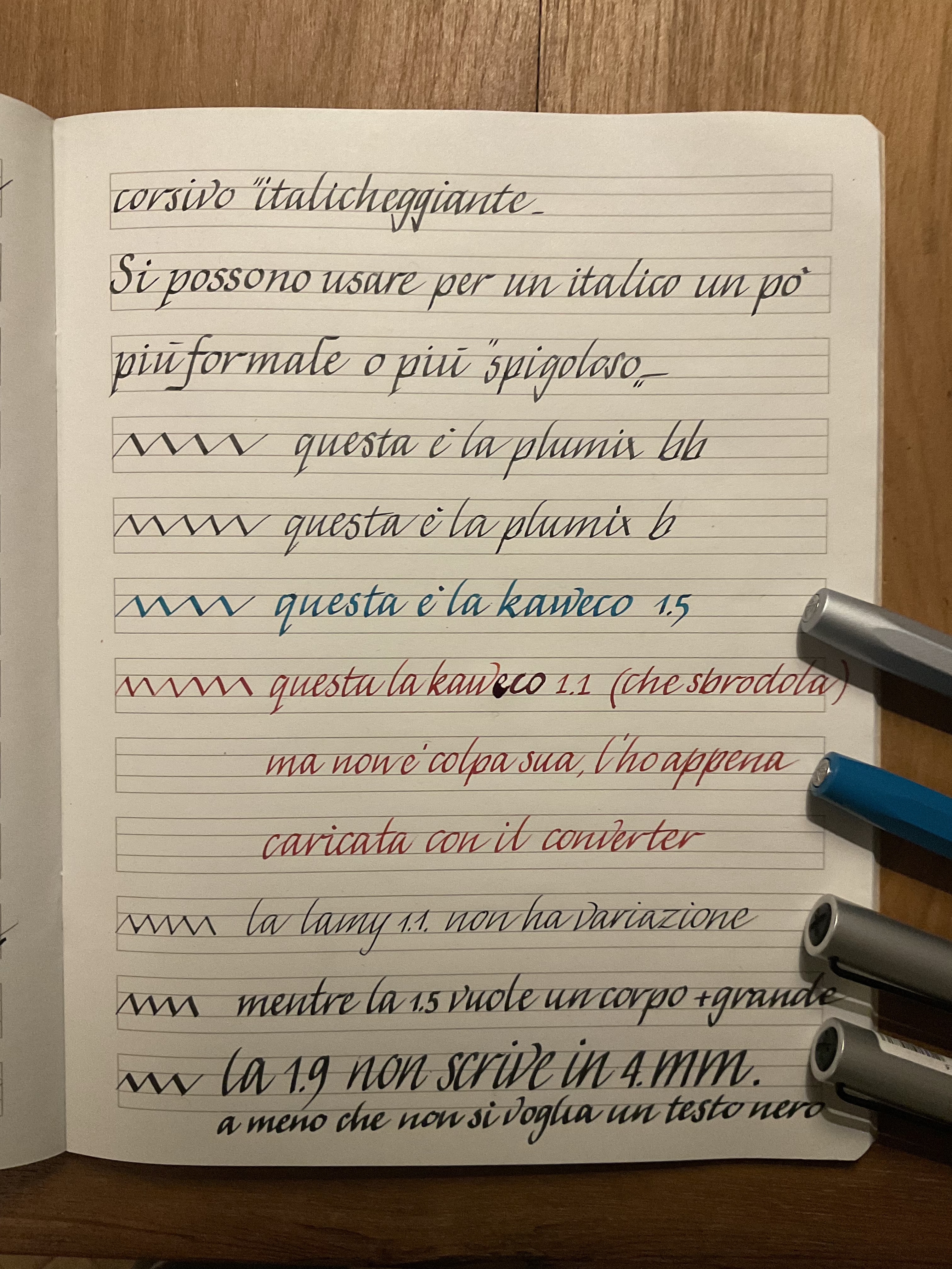 L’ho confrontata con altri pennini stub ed italici che ho, quali i lamy e Kaweco, entrambi più facili ed arrotondati.