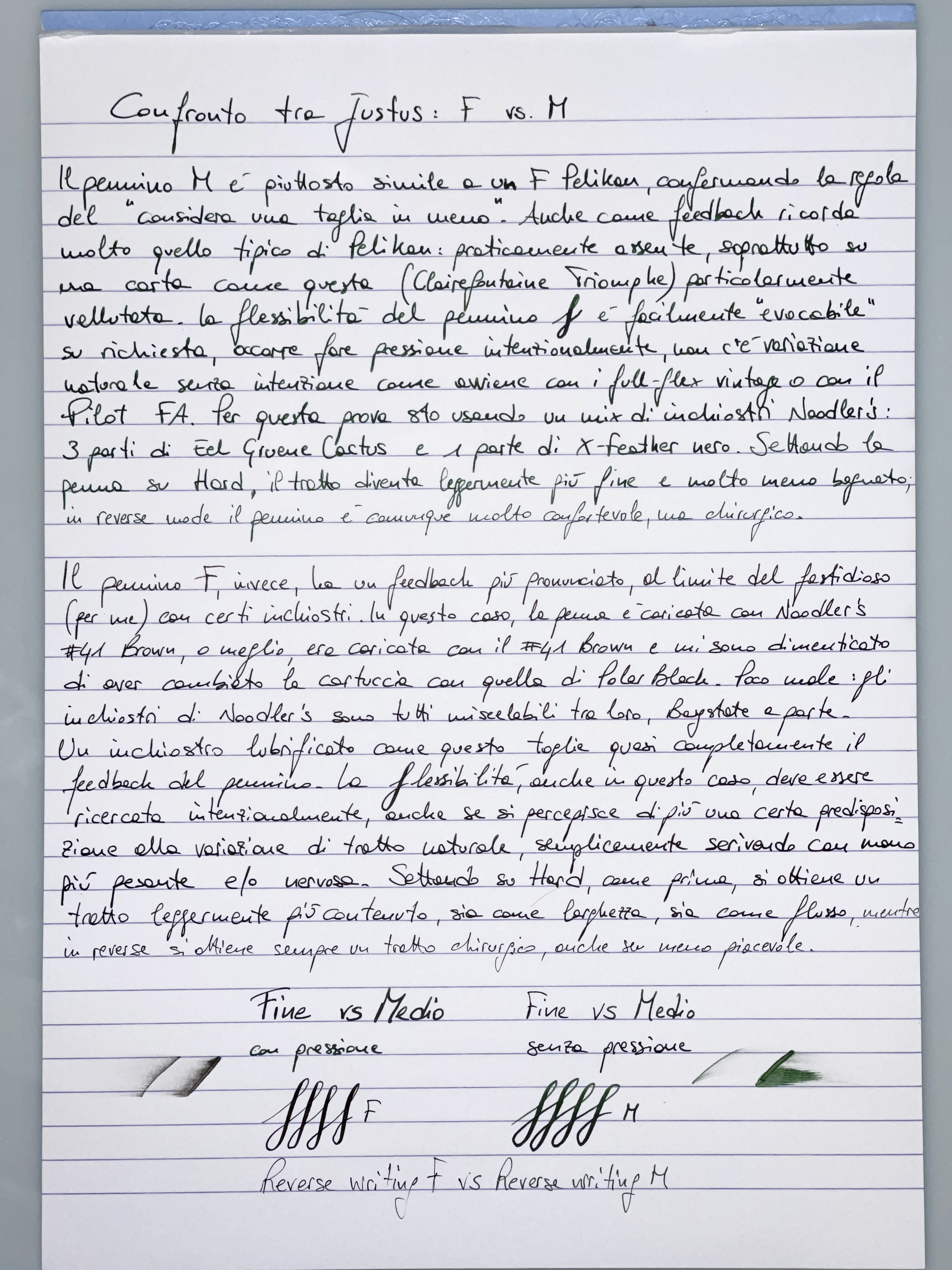 Entrambi i pennini hanno una morbidezza fantastica che rende estremamente piacevole e per niente faticosa la scrittura anche di parecchie pagine, con una flessibilità sempre da ricercare intenzionalmente con una buona pressione (quella sì affaticante, non sono certo pennini flessibili): la variazione di tratto richiede un certo impegno, non è naturale come con il pennino FA della 912 o con i full-flex di una volta.