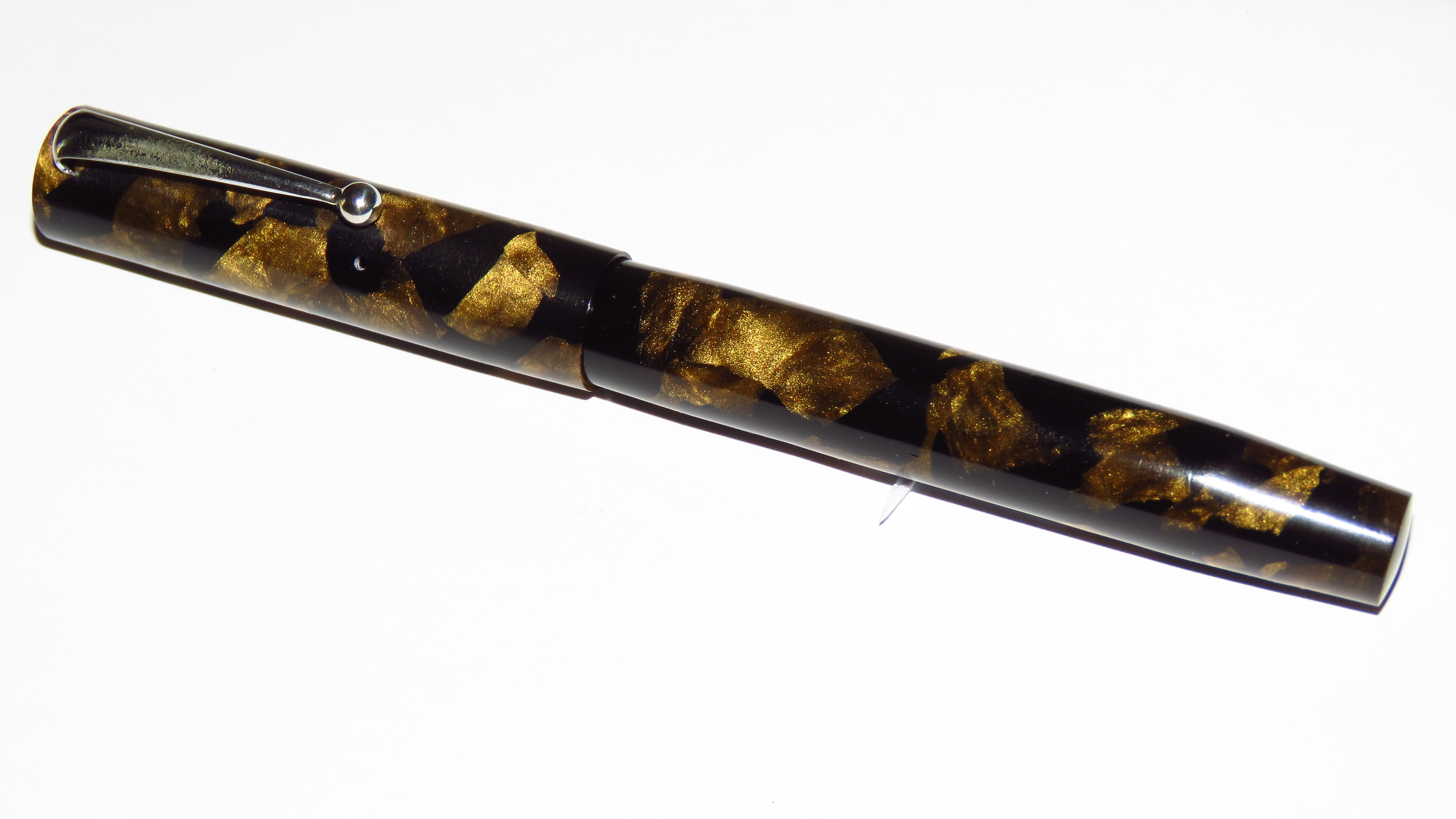 La penna è prodotta in una, a parer mio, molto elegante celluloide marmorizzata ambra-nera, con ampi spazi "sbrilluccicanti" inclusi nelle sezioni ambrate. (Da una breve ricerca ho appreso la presenza di altre stupende colorazioni, non usuali rispetto a quelle tipiche per Swan/Blackbird). Laddove il materiale si assottiglia molto, nella regione terminale alla base del cappuccio, per altro molto fragile e tipicamente più soggetta a fratture, la trasparenza è apprezzabile.