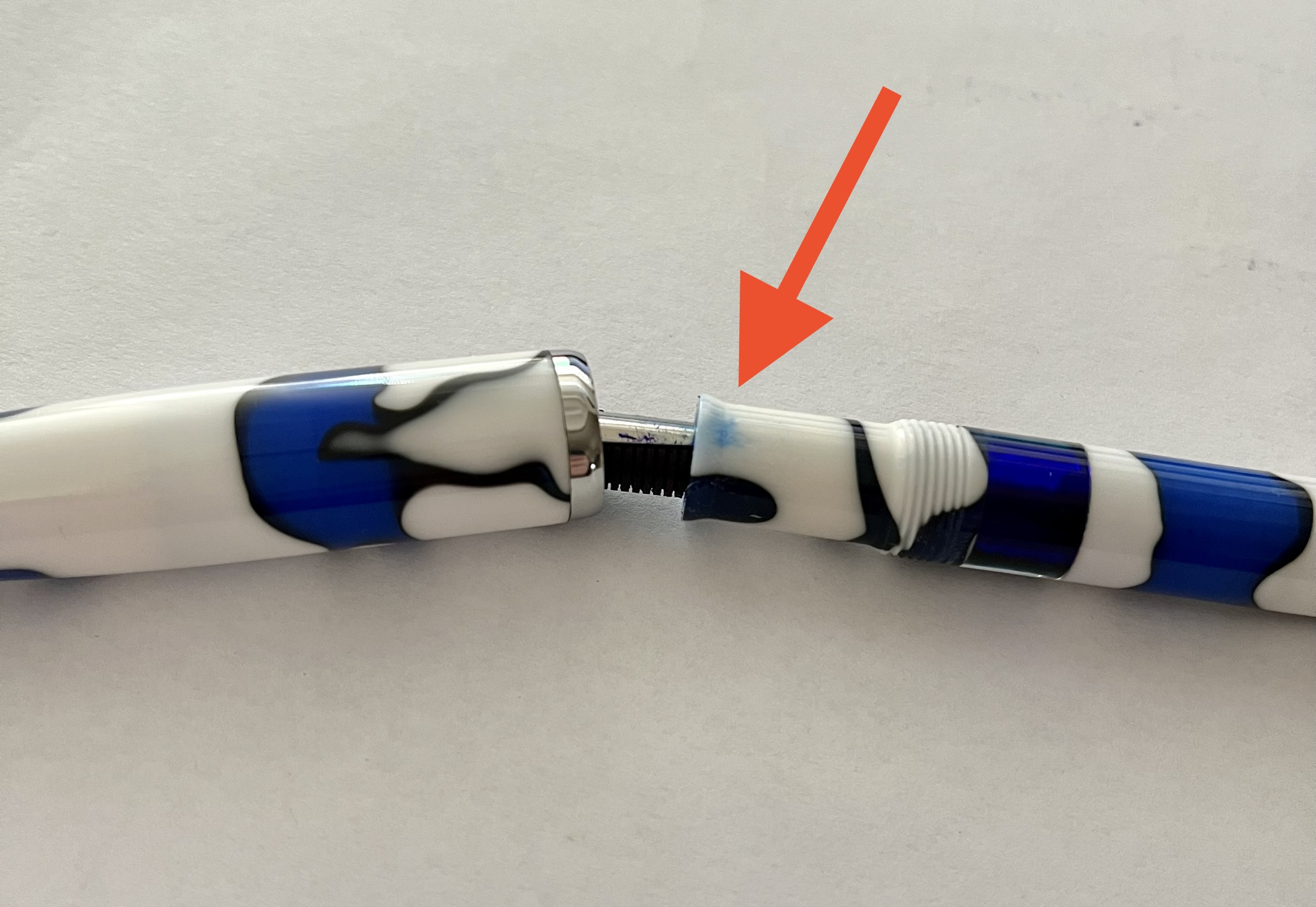 A causa di piccole fuoriuscite di inchiostro, ed anche per caricarla immergendola, si è macchiato l'interno del cappuccio e parte del fusto.