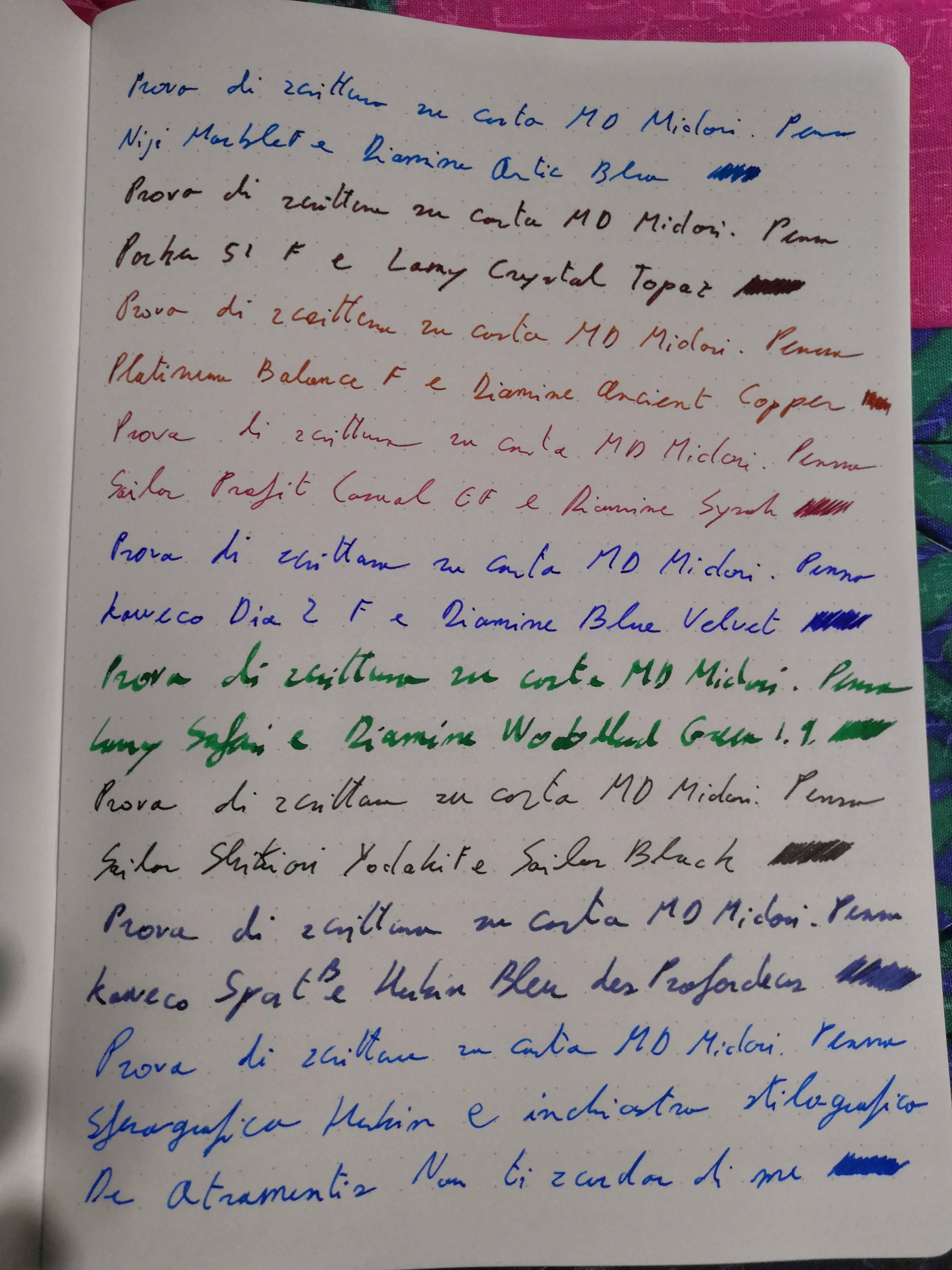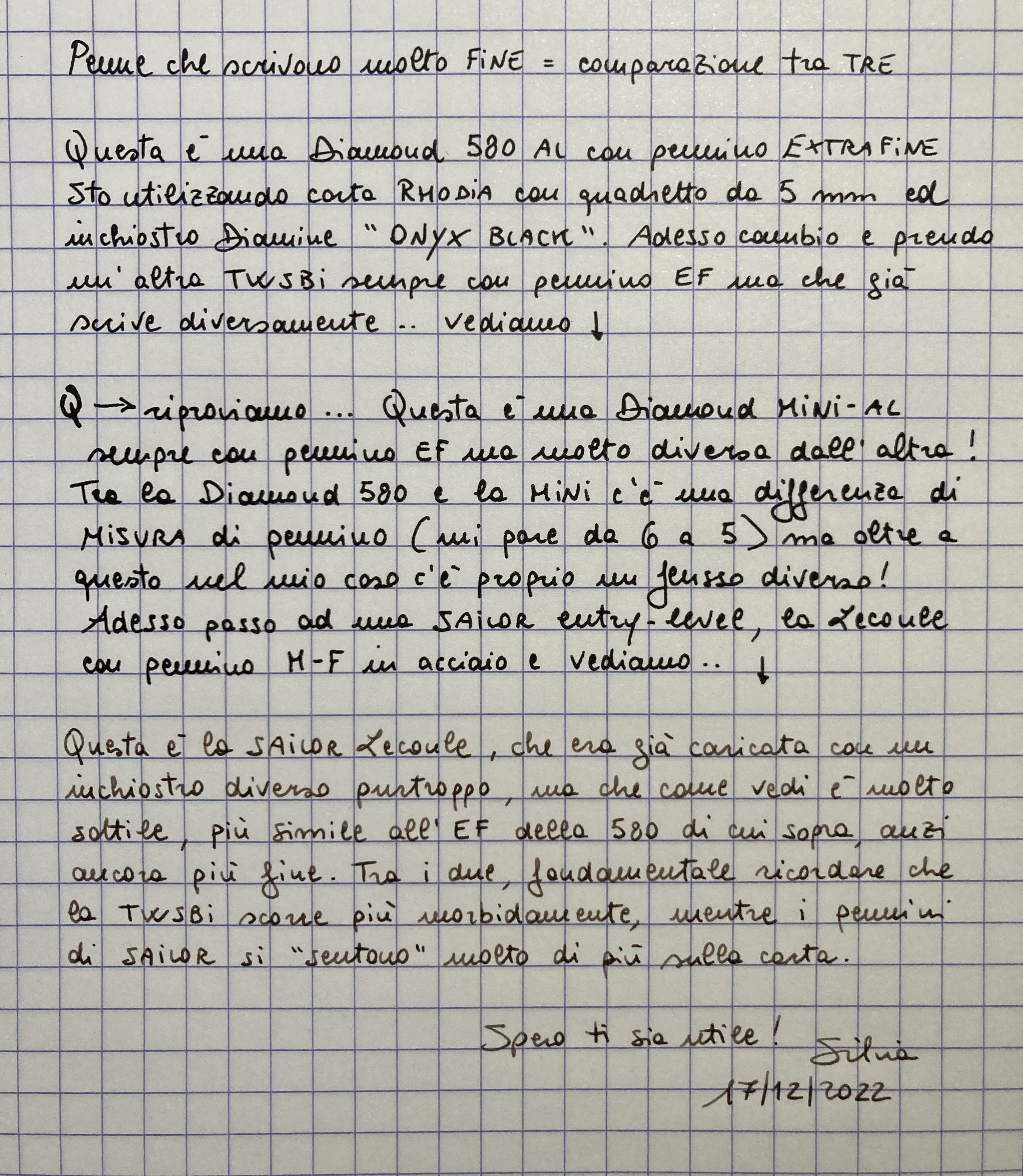 C'è anche da dire che ci possono essere differenze tra pennini della stessa casa, basta citare i pennini della Lamy Z50 EF, non ne ho uno che scriva uguale, per avere una coerenza di tratto li ho tutti cambiati con dei pennini presi dalla Cina. Parlo per la mia esperienza, che può benissimo essere smentita, tra la ECO in mio possesso e la Diamond 580 e la Diamond 580 AL, tutte EF, la ECO è leggermente più abbondante potrei quasi dire che siamo su un EF europeo.