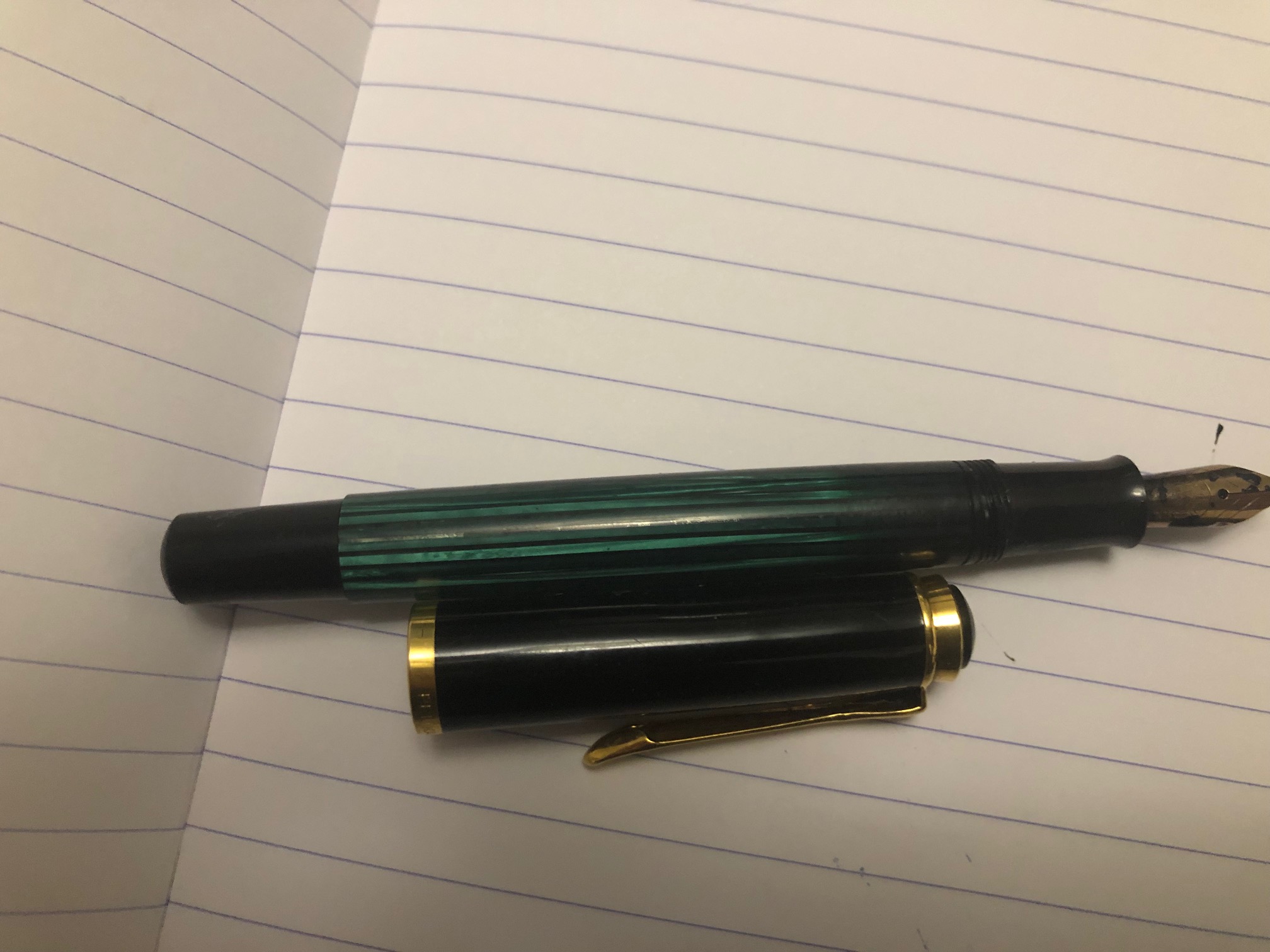 Questa m400 è stata la mia prima penna seria, arrivata come regalo aziendale a mio padre e gentilmente giratami... l'ho usata per tutto il liceo e poi dimenticata in un cassetto! Il pennino è sporco in foto perché appena intinto, ma è a posto. Il fusto invece è rimasto macchiato e passando col dito sembra leggermente in rilievo la parte scura... non saprei cosa può essere successo, suppongo di averla dimenticata inchiostrata e che lo stesso inchiostro sia filtrato fra cappuccio e fusto e fatto il disastro! Ma sono solo supposizioni...