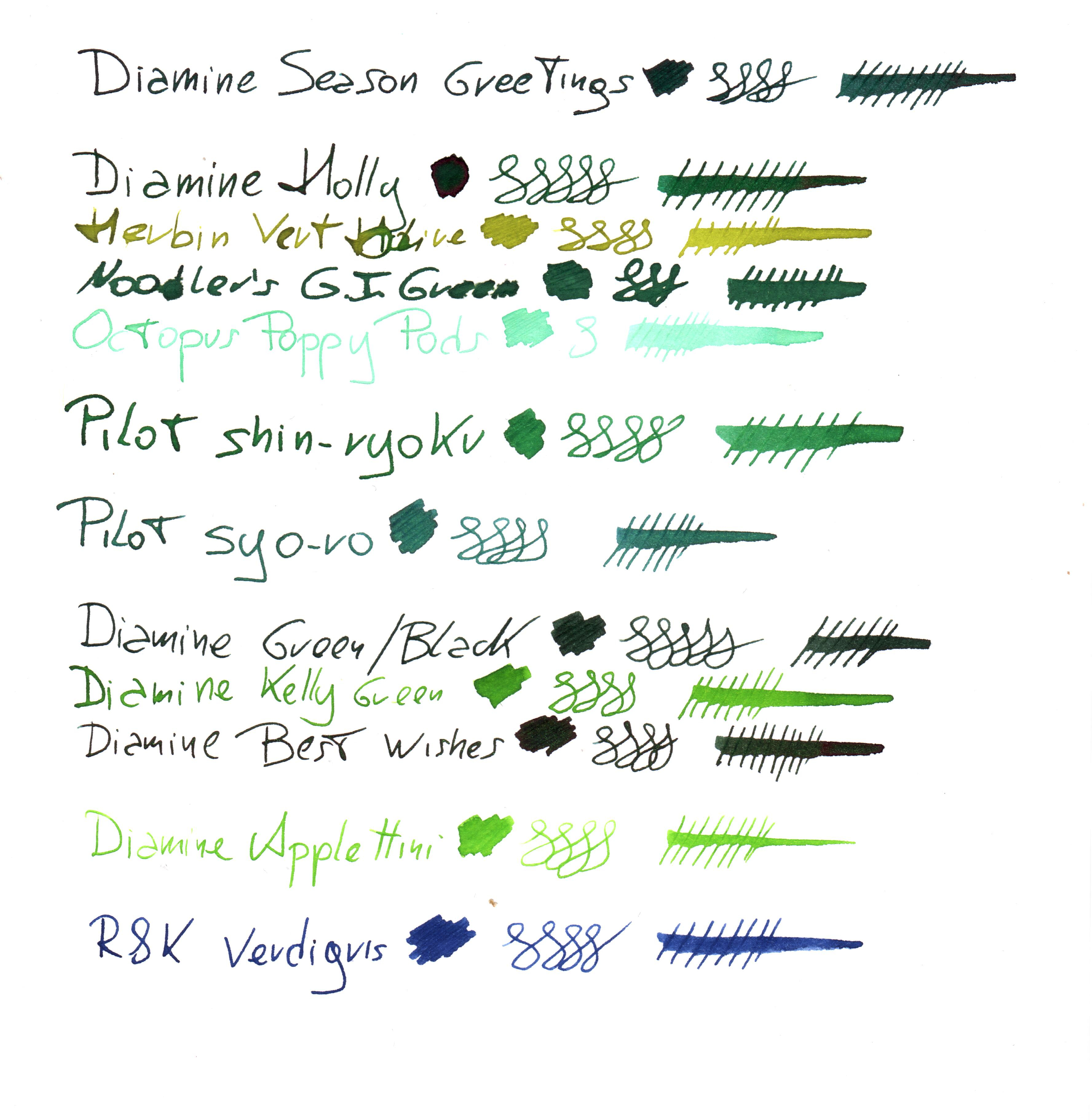 A me il Diamine Holly piace molto, su tratti molto fini schiarisce un po'. Un altro verde che trovo valido è il Woodland Green, sempre Diamine. Forse un po' troppo chiaro per alcuni ambienti, ma non chiaro come il Kelly. Hacanche qualche sfumatura. Un verde medio, direi
