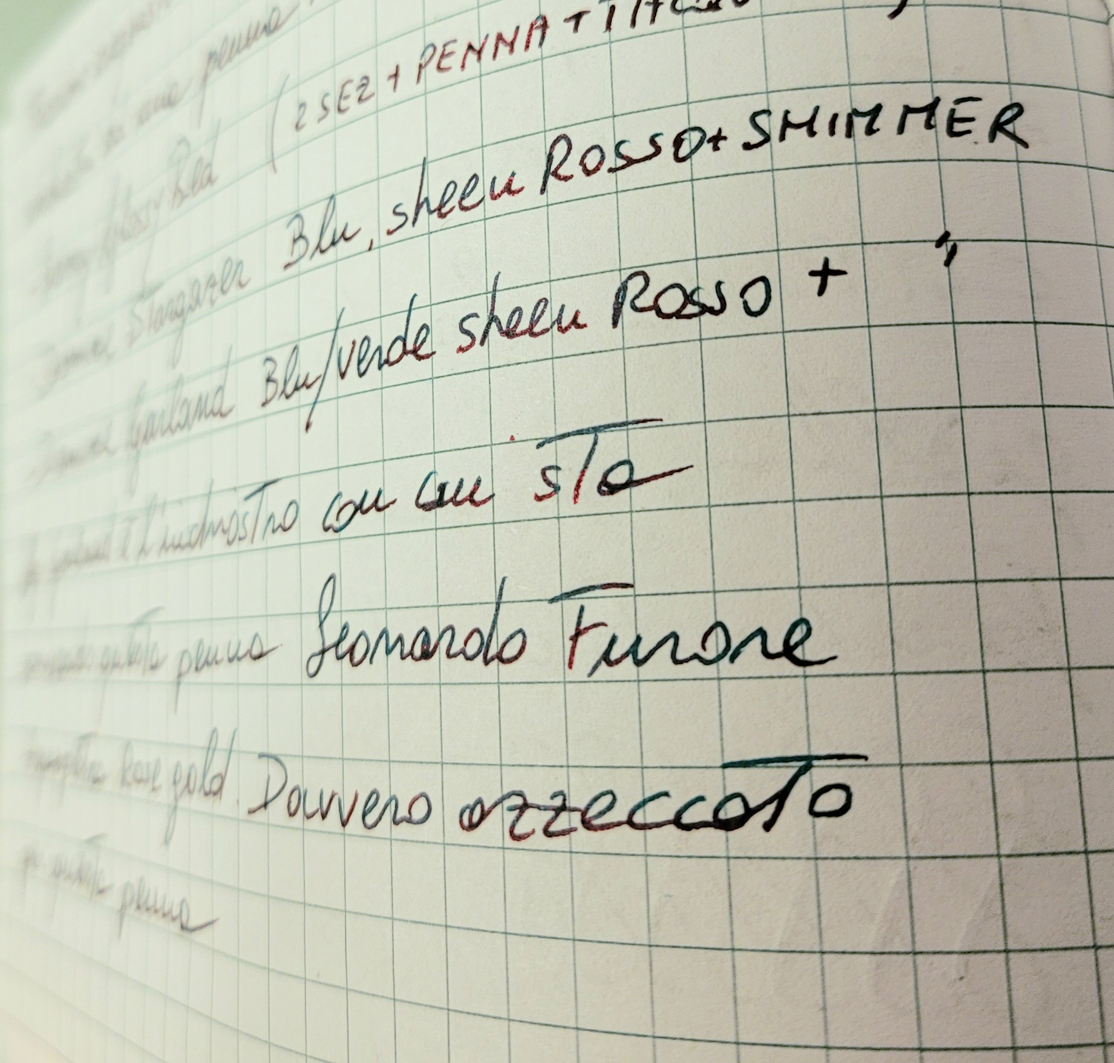 - Diamine Stargazer un verde/blu con evidentissimo e spettacolare sheen rosso. Purtroppo è un inchiostro shimmer (blu) siccome non mi garbano molto i brillantini lascio che si depositino sul fondo del calamaio e carico regolarmente nelle mie penne solo la parte liquida. L'effetto dal vivo è meraviglioso! A seconda della luce e dall'angolazione in cui si guarda il verde scuro vira a blu e poi rosso: è camaleontico! Perdonate le foto penose.