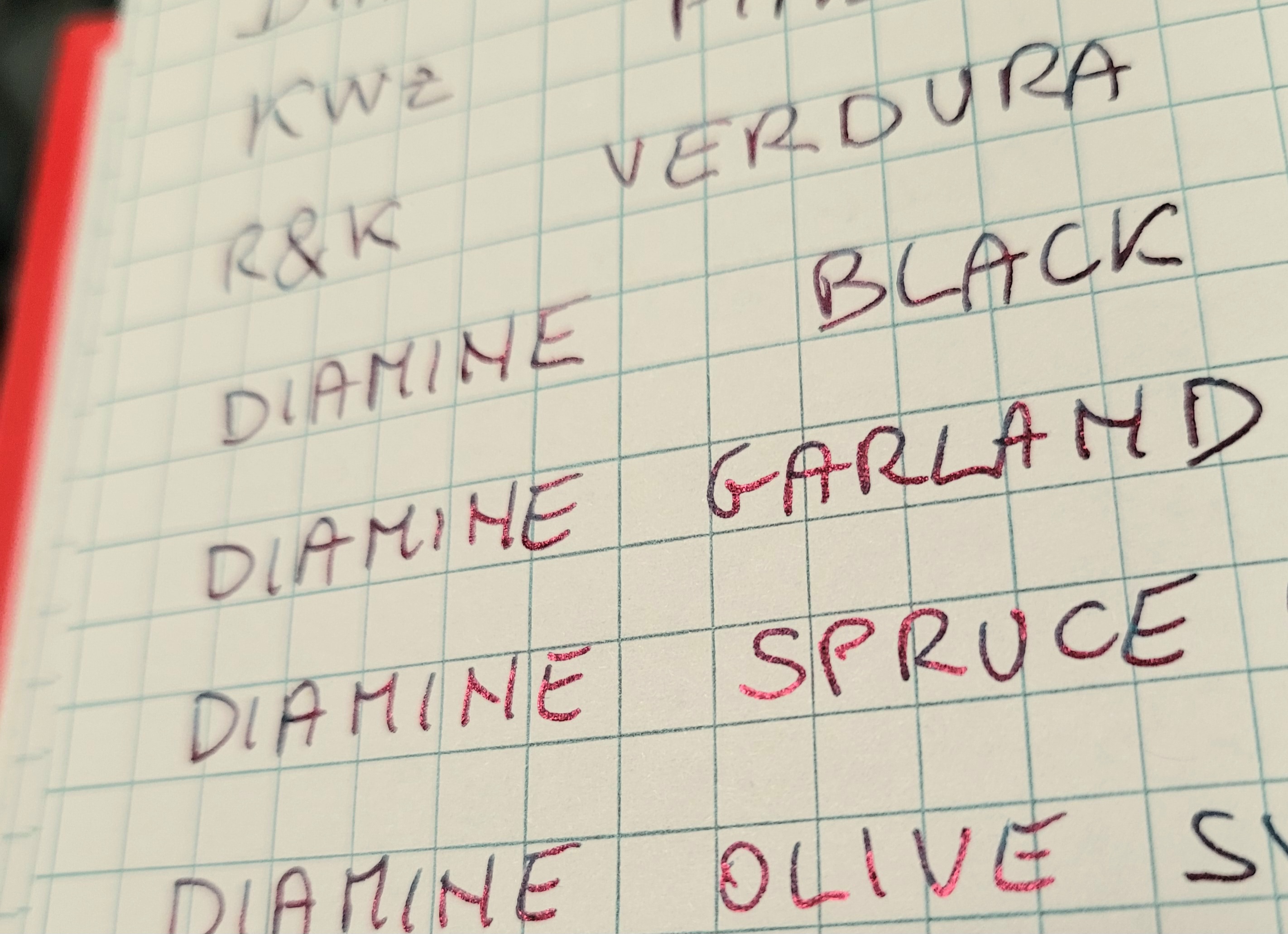 • Herbin Vert Olive: per praticamente inutilizzabile. Mi pare secco come pochi altri, ogni penna in cui l'ho provato smetteva di scrivere