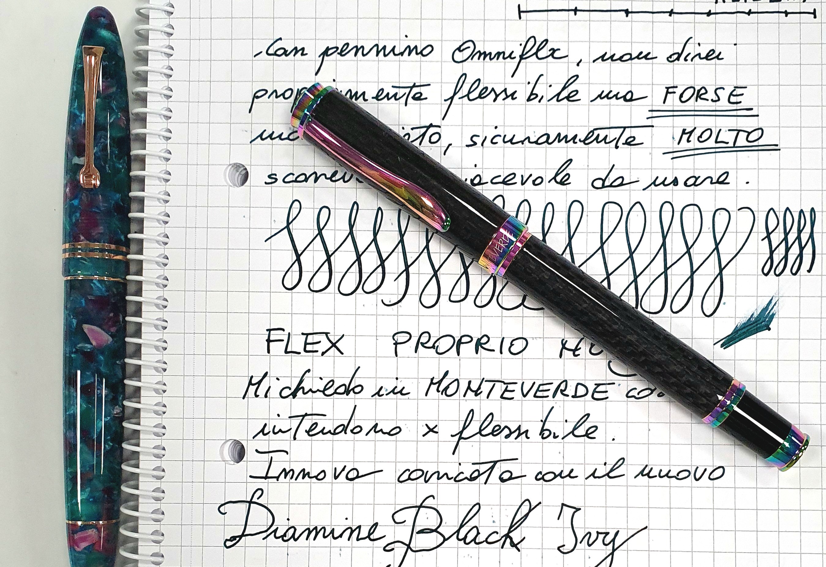 - Diamine Black Ivy anche questo inchiostro è di base un verde scuro con riflessi blu scuro più marcato rispetto al precedente e ha sheen rosso: molto intrigante. Inchiostro abbastanza fluido ma neutro riguardo le dimensioni del tratto. Qui insieme alla mia Monteverde Innova: