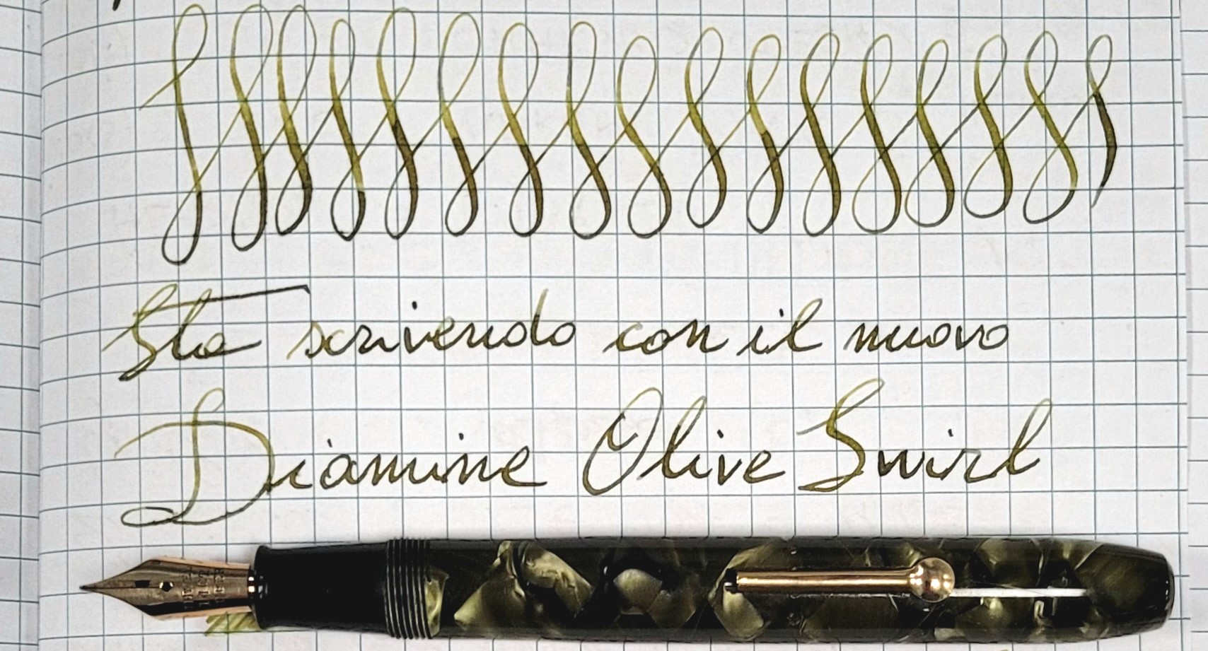 - Diamine Olive Swirl verde oliva con una buona sfumatura (shade) soprattutto con tratti generosi. E' l'abbinamento ideale per questa Moore con pennino flessibile: