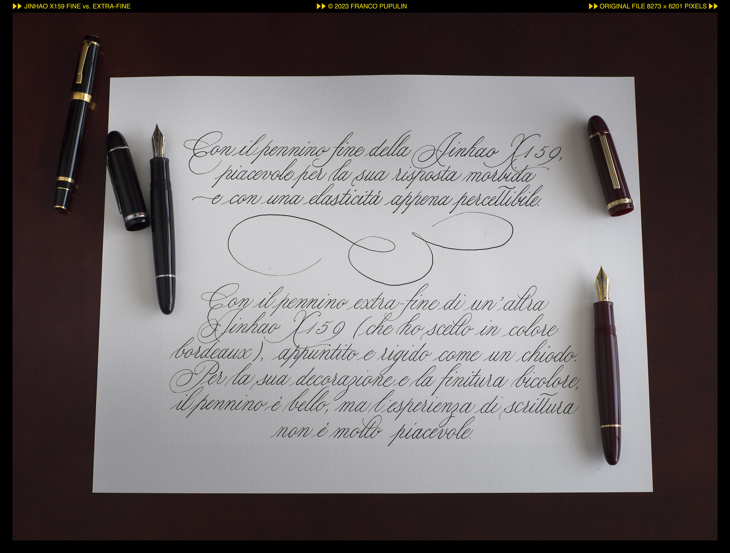 Come potete vedere nella fotografia vi é, effettivamente, una netta differenza nello spessore del tratto, e l'extra-fine rilascia una linea decisamente più sottile. In compenso, però, é molto più rigido del pennino fine e fornisce un'esperienza di scrittura meno piacevole. Per questo, direi, é meno adatto alla scrittura quotidiana, almeno per coloro che richiedono al pennino un poco di cedevolezza sulla carta. Per un uso specialistico, l'extra-fine della Jinhao X159 produce la linea che promette: extra-fine. E' già qualcosa.