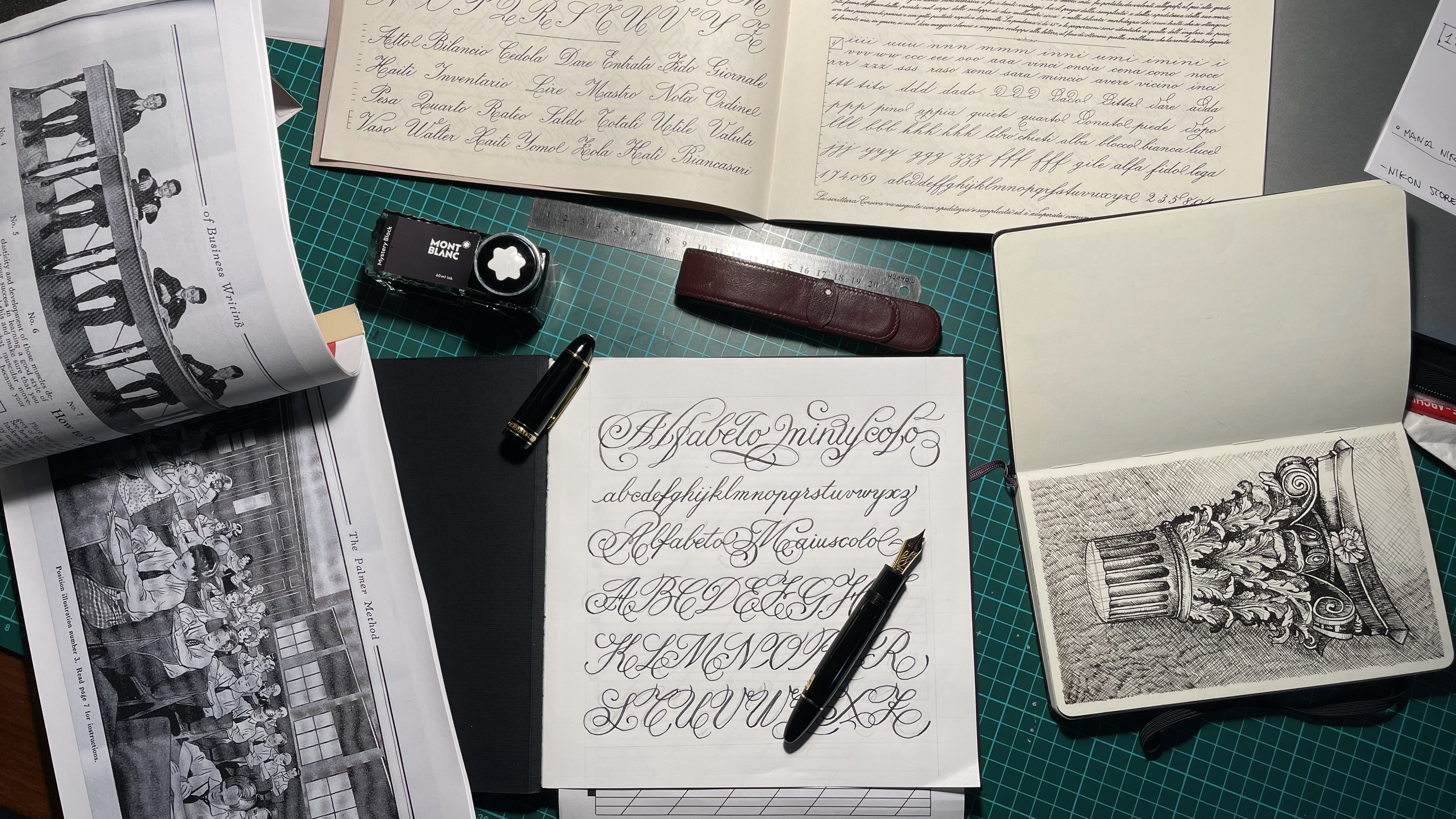 In foto una piccola tavola realizzata da me usando il corsivo inglese ed una montblanc 149 calligraphy , inchiostro nero montblanc e fogli Fabriano .